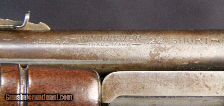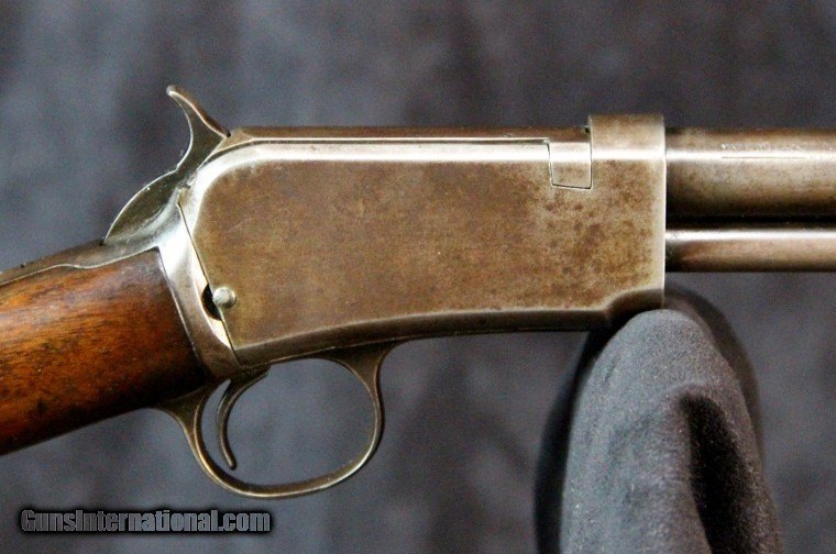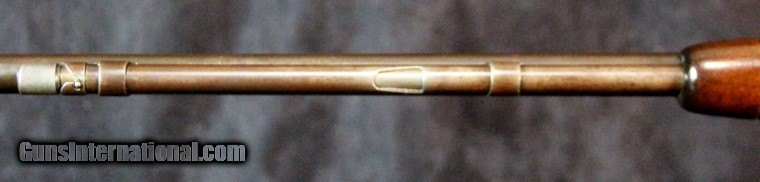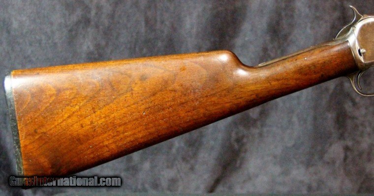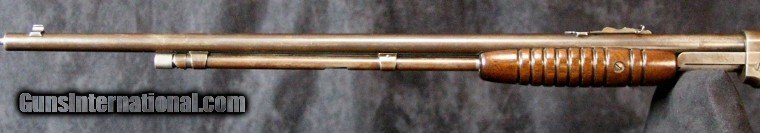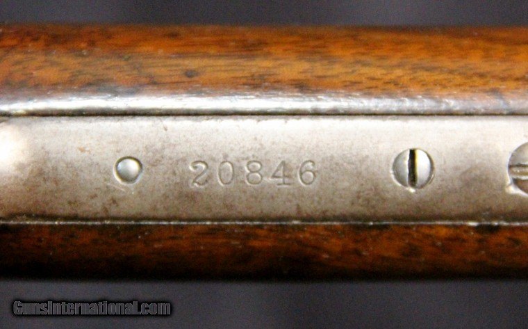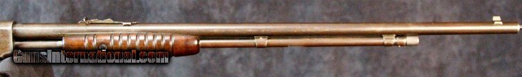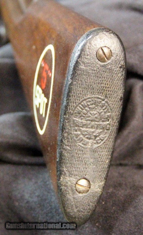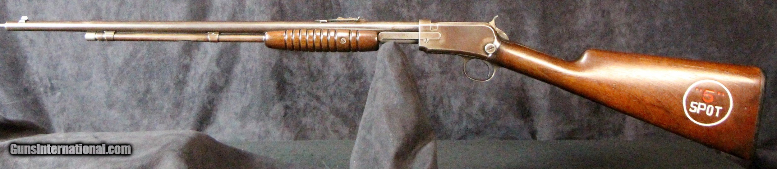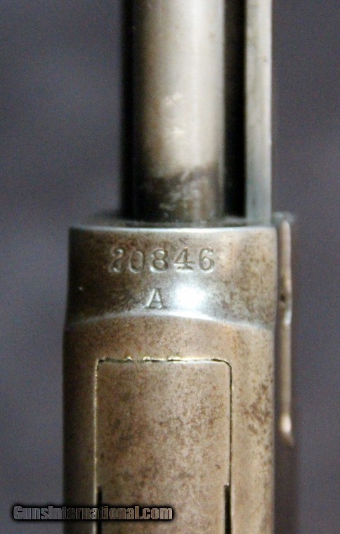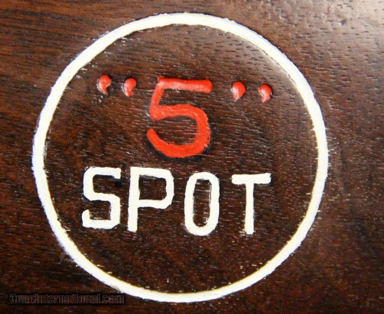Description: .22rf, short, #20846, blue finish, walnut stock and forearm, original sights, 2 inch circle on left side of stock with " "5"/SPOT" in circle, 1935. Condition: excellent bright bore, 90% barrel blue thinning to silver, 70% receiver blue thinning to silver, excellent wood, excellent mechanically, excellent marks. SOLD Curio/Relic: Yes |