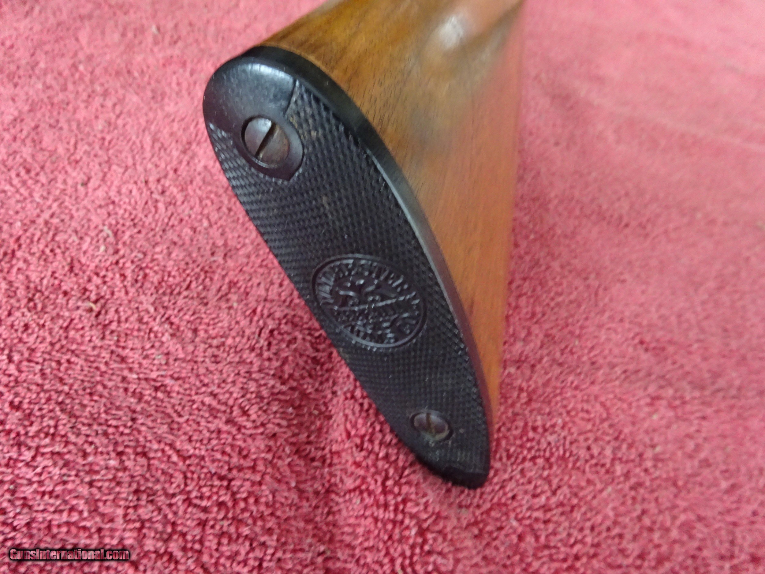 Description: *** SALE PENDING *** WINCHESTER MODEL 62 SHORT, 23" ROUND BARREL. VERY GOOD BLUE, MIRROR PERFECT BORE, FIXED FRONT SIGHT, STEP ADJUSTABLE REAR SIGHT. FRAME, TRIGGERGUARD AND MAGAZINE TUBE HAVE TURNED AN EVEN GRAY. EXCELLENT STRAIGHT GRIP STOCK WITH ATTRACTIVE FIGURE AND COLOR, SMALL RIBBED FOREARM, PERFECT WINCHESTER MARKED COMPOSITION BUTTPLATE. THE WOOD ON THIS GUN IS EXCEPTIONAL. MADE IN 1937, 100% ORIGINAL CONDITION. HARD GUN TO FIND. $975.0 + $60.00 Insured shipping to an FFL address. Layaway is available. See all Pats gun listings on this site! We also have hundreds of pieces of ORIGINAL gun company advertising & memorabilia available for sale on our site SPORTINGCOLLECTIBLES. We have no reprints or reproductions. Email for more information. SOLD Curio/Relic: Yes |