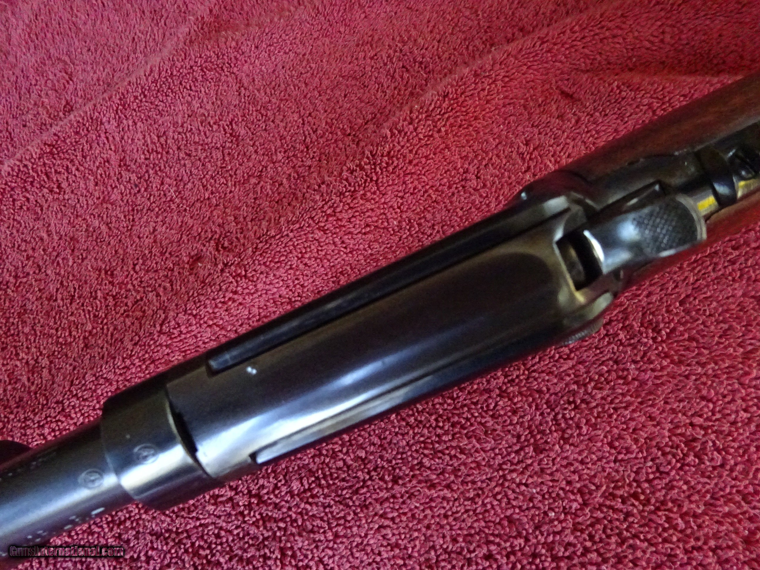 Description: WINCHESTER MODEL 62 PRE-WAR SLIDE ACTION 22 S. L. OR LR. 23" BARREL, FIXED FRONT SIGHT, STEP ADJUSTABLE REAR SIGHT, LYMAN TANG PEEP SIGHT. EXCELLENT BLUE, MIRROR PERFECT BORE. STRAIGHT GRIP STOCK SMALL RIBBED FOREARM, EXCELLENT WOOD WITH VERY FEW TINY HANDLING MARKS. WINCHESTER MARKED BAKELITE CHECKERED BUTTPLATE. MADE IN 1939, 100% ORIGINAL CONDITION. PRE-WAR 62 WINCHESTERS IN THIS CONDITION ARE SCARCE. $1475.00 + $70.00 Insured shipping to an FFL address. Layaway is available. See all Pats gun listings on this site! We also have hundreds of ORIGINAL gun company advertising & memorabilia pieces available for sale on our site SPORTINGCOLLECTIBLES. We have no reprints or reproductions. Email for more information. If you need to call, morning or evening is best, and please note the Seller's Inventory number. SOLD Curio/Relic: Yes |