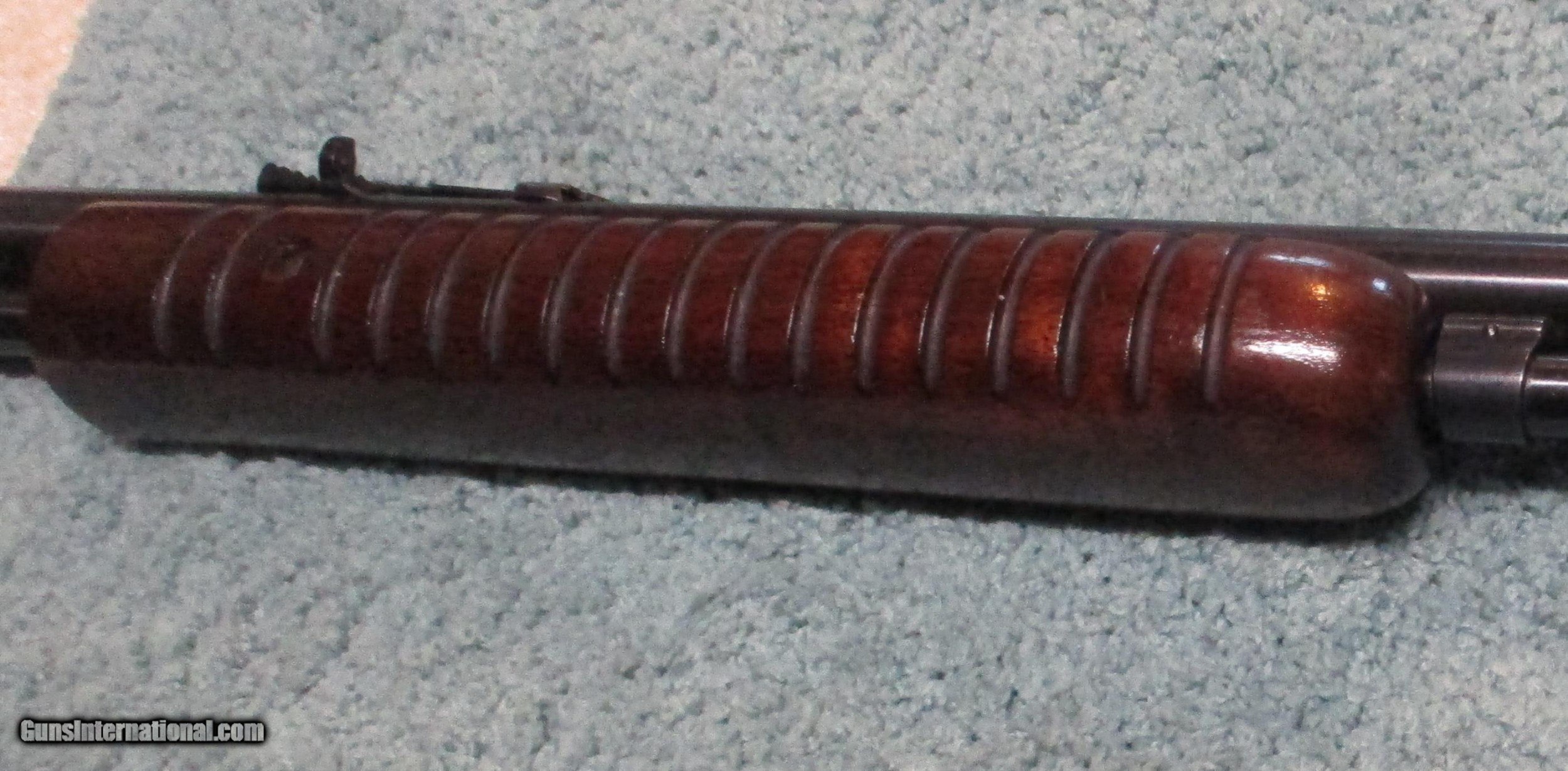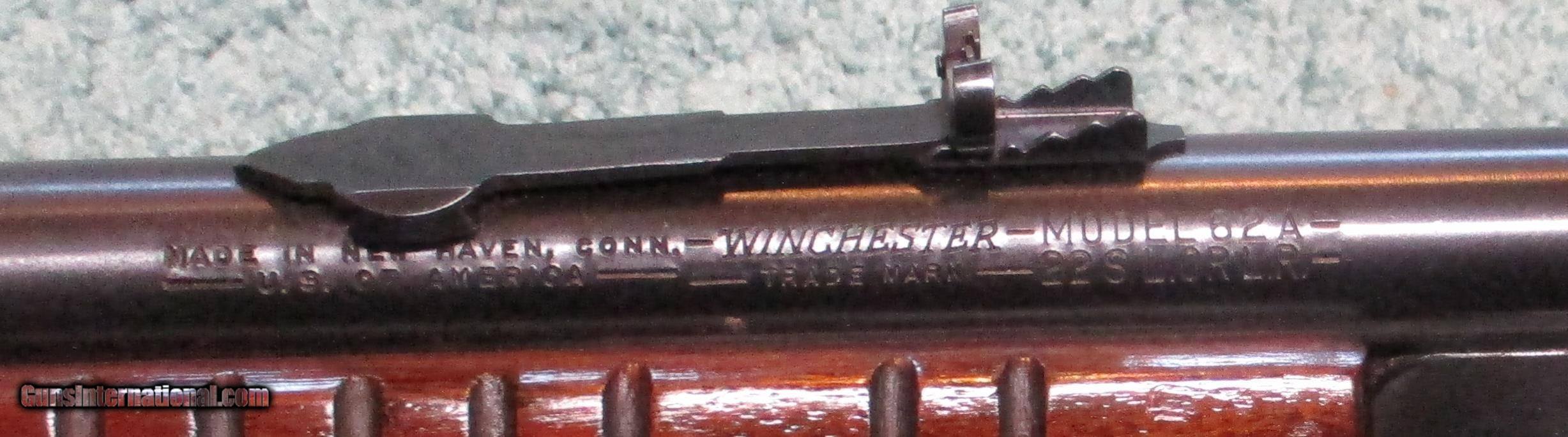 Description: Winchester model 62A pump action rifle,caliber 22 short,long or long rifle,adjustable rear sight,23 inch round barrel,serial number 2966XX,made in 1951,bright shiney bore,no cracks in the wood,original blueing with only minor blue wear from using the slide action,no rust on metal surfaces,plastic butt plate,all marking are clear and crisp.FREE SHIPPING with insurance,rifle will be shipped in a new hard rifle case that is included in the sale.Payment by Bank of America Cashiers Check or U.S. Postal Money Order ONLY.Will only ship to a FFL dealer. SOLD Manufacturer: Winchester Model: 62A Serial Number: 2966XX Caliber Info: 22 short,long or long rifle Bore: bright & shiney Condition: used Metal Condition: no rust or pits original blue Wood Condition: good no cracks Barrels: 23 inch Barrel Type: round Action: pump Stock: wood Fore End: wood Butt Pad: plastic |