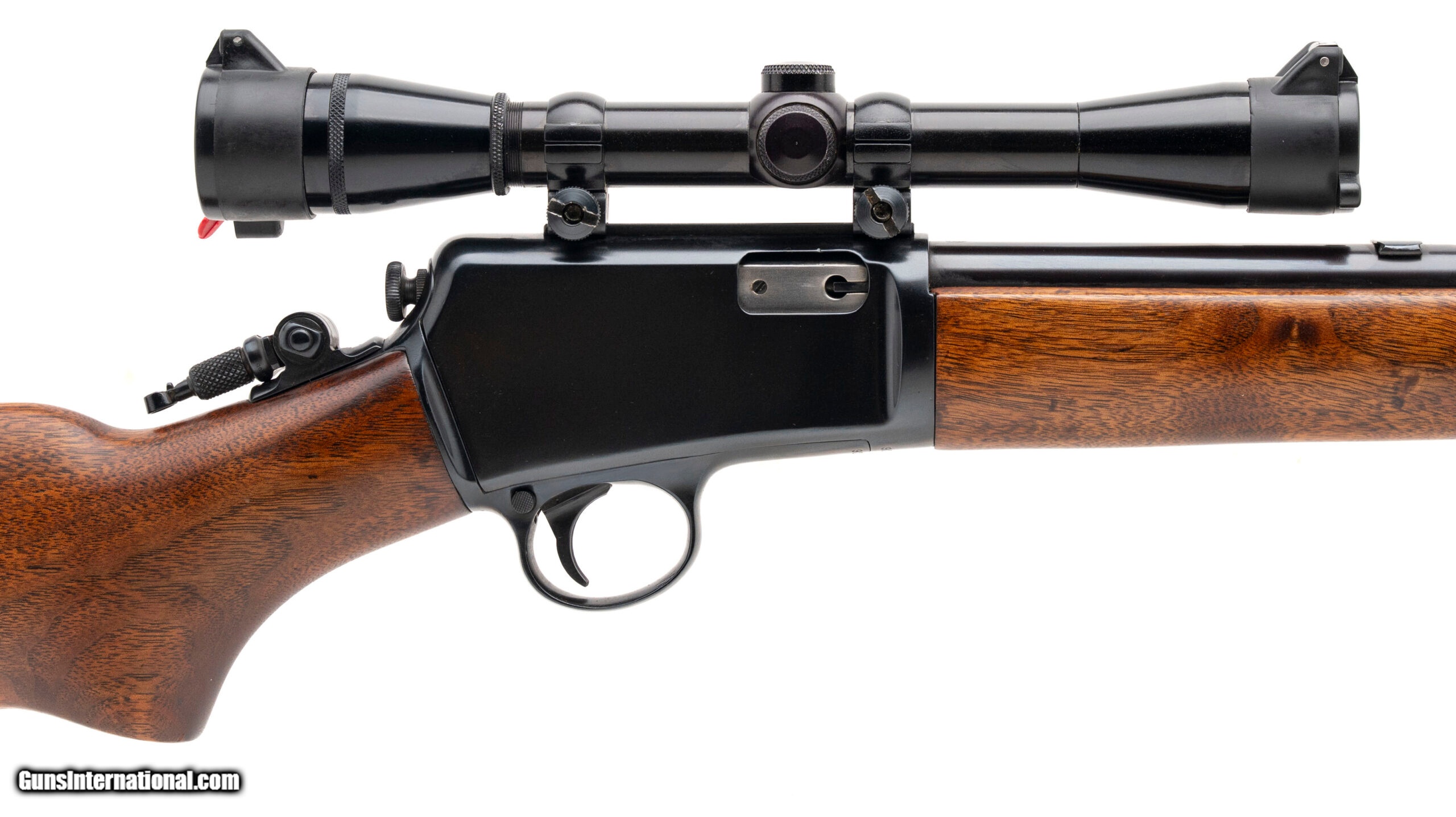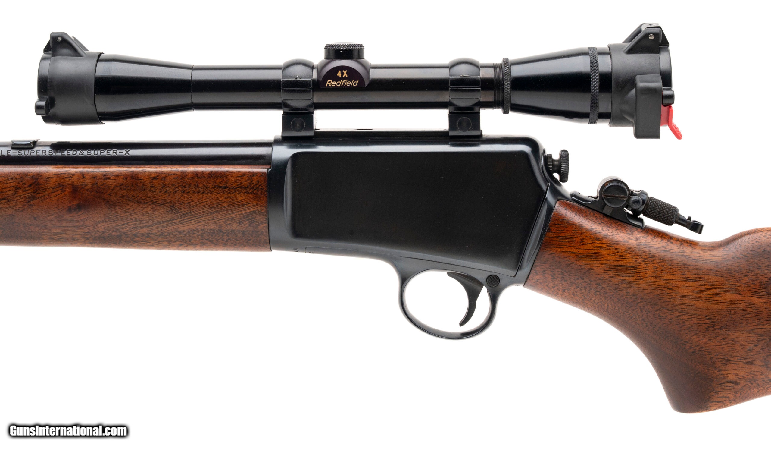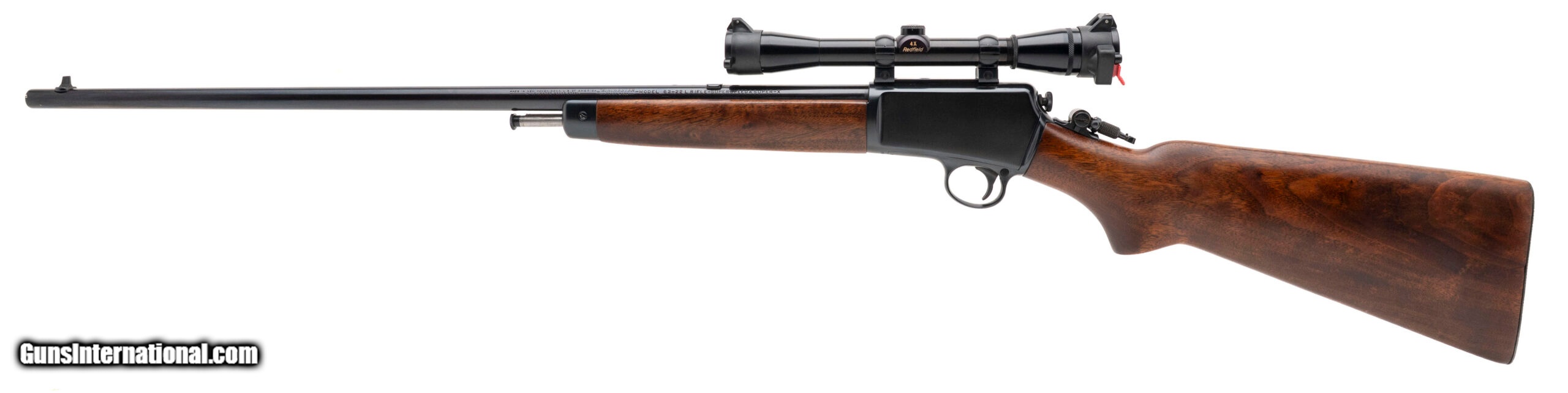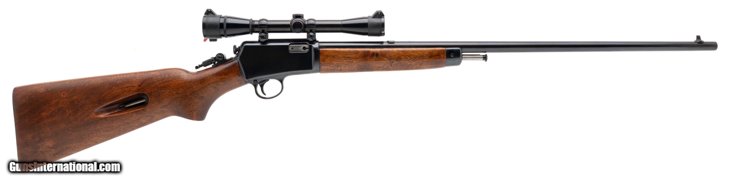 Description: "SN: 92734A. Made in 1950, .22LR with a 23"" barrel. Pre-64 semi-auto rifle. The metal has been reblued, looks excellent. The wood is very good with a few light marks. Has a tang peep sight and a Redfield 4X rimfire scope. A good looking rifle, ready to shoot. SOLD |