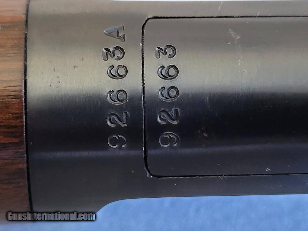 Description: This is an exceptional model 63 Winchester 22LR from 1950. This is rhe rifle version with the 23" barrel, as opposed to the 20" carbine that was standard in the first 2 years of production. The model 63 was manufactured from 1933-1959, and designed to shoot the 22LR Super Speed and Super X ammunition. These are considered one of the finest 22 auto-loading rifles ever built by anyone. The bore is in mint condition, and the barrel script, S/N, and proof marks are all as clear and crisp as day one. This is a take down rifle, so it has the S/N's stamped on both halves (which match), and it disassembles and reasembles easily. The original walnut stocks are in excellent condition, with no cracks or repairs, and show only light handling wear. This is a fine example of pre-64 Winchester quality, and getting near impossible to find in this condition. I would rate this this gun at 98% or better overall. I prefer Postal Money Orders, unless otherwise agreed. Thanks for your interest. Dan at (606) 751-7194. SOLD Curio/Relic: Yes Manufacturer: Winchester Model: 63 Serial Number: 92663 Barrel Length: 23 Bore: rifled Condition: near mint Metal Condition: 98% Wood Condition: 98% Bore Condition: mint Barrel Type: round Action: Semi-auto Triggers: single Stock: factory walnut Butt Pad: factory steel checkered Finish: Blue Sights: factory original Manufacture Date: 1950 |