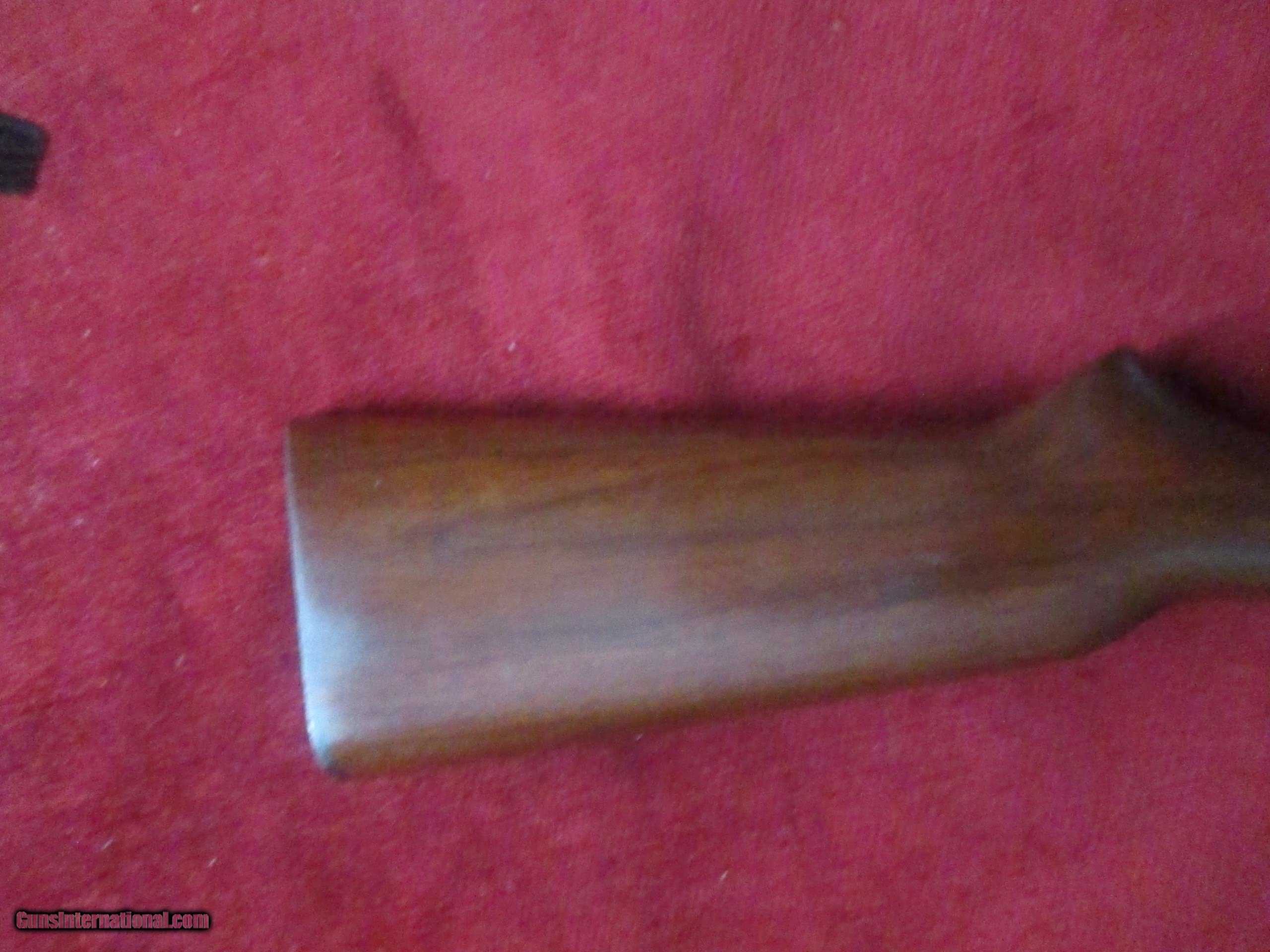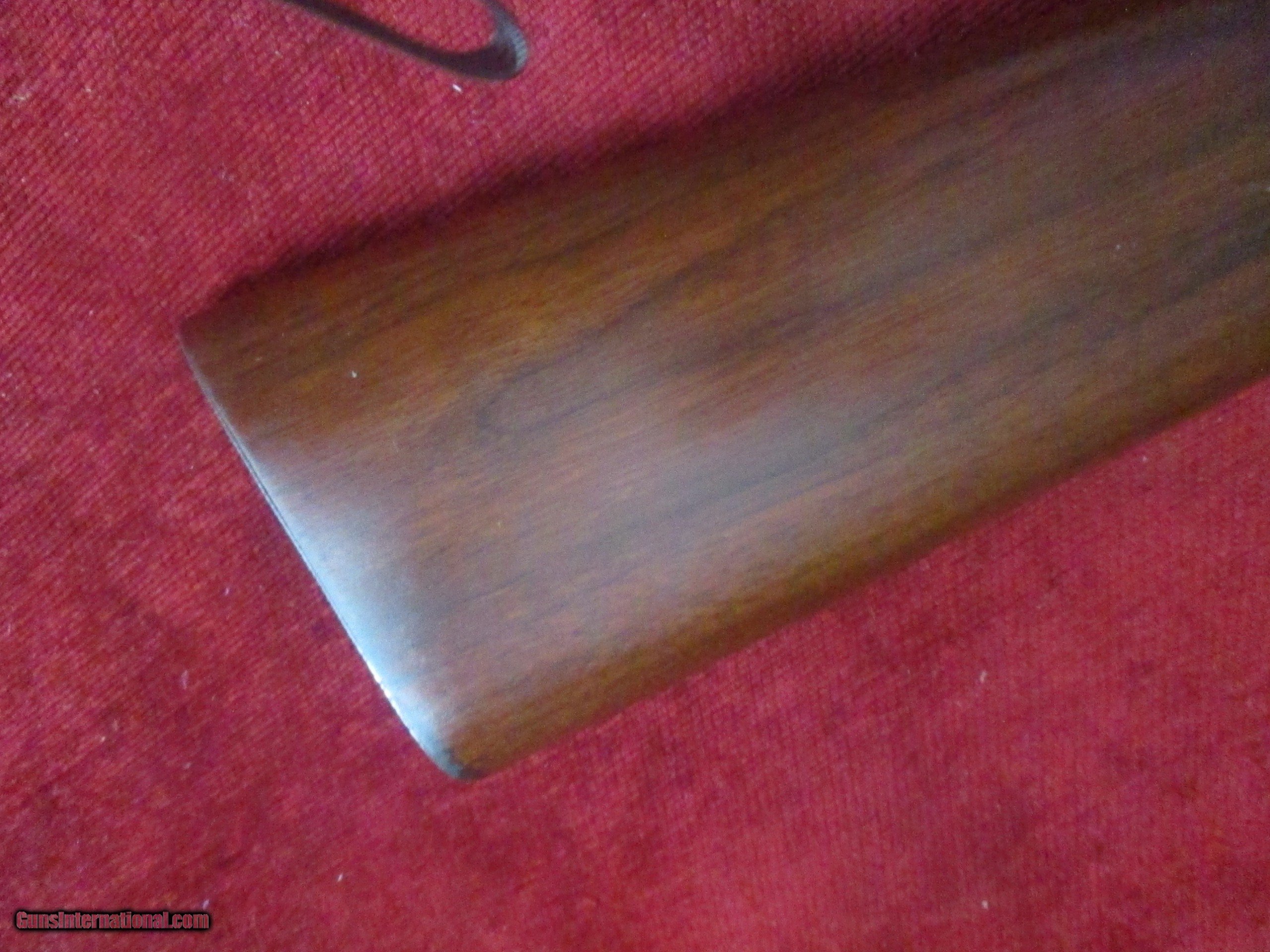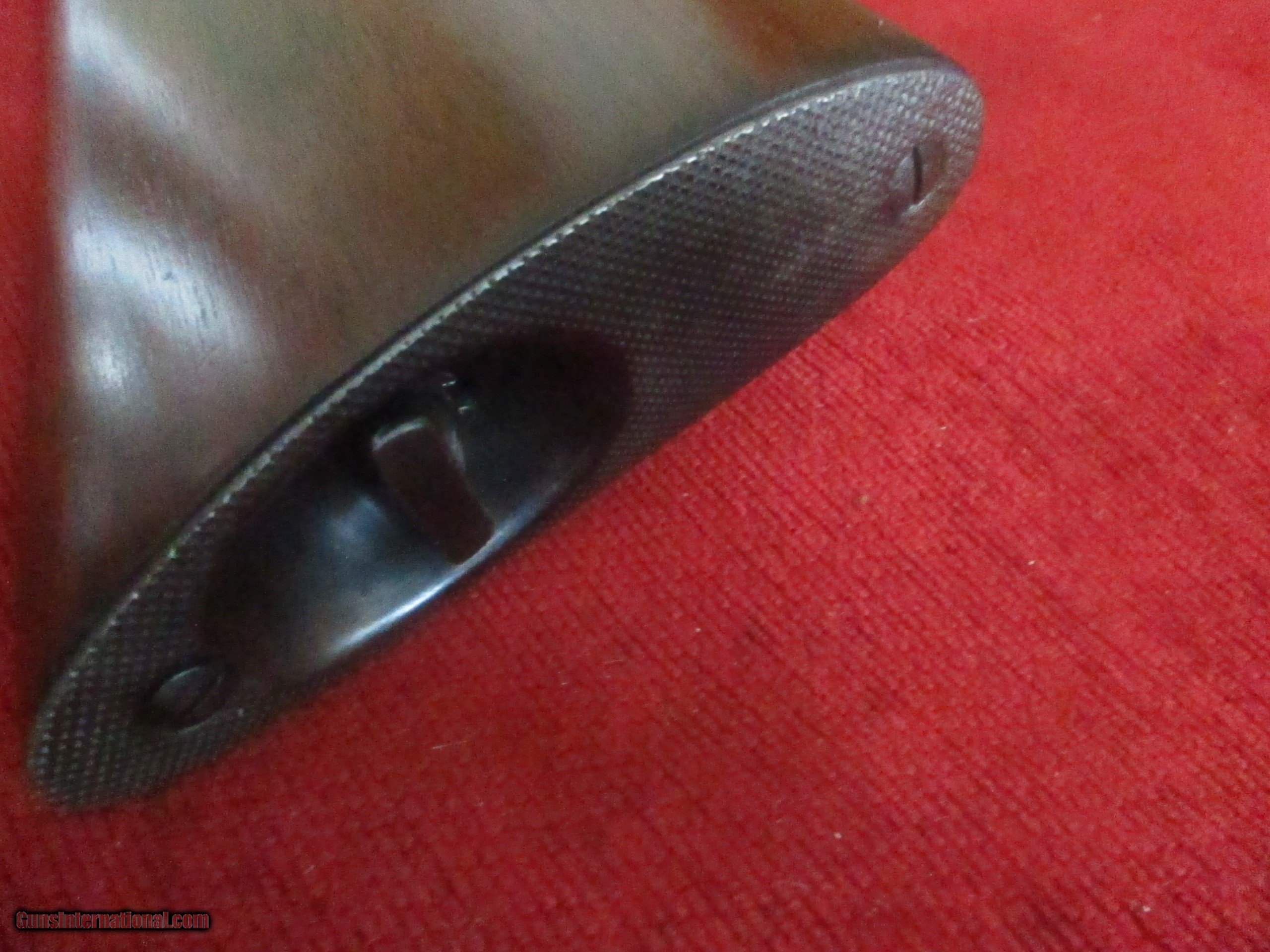 Description: 23" bbl., standing blade with bead front, open semi-buckhorn style rear, stock or rear fed magazine, figured American walnut stock & forearm, checkered steel creseant butt, 98% blue, minor blemish (no pits or surface damage) rt. rec.side pictured but barely visable, perfect bore, very tight, overall excellent condition, SOLD |