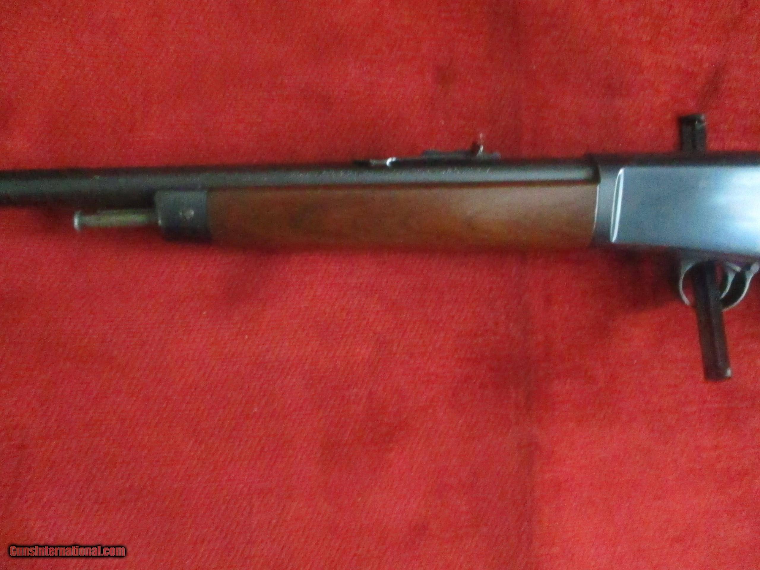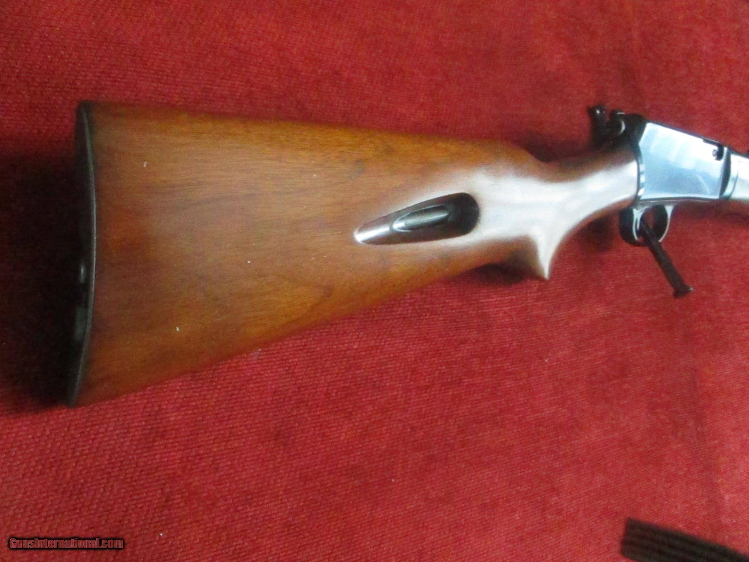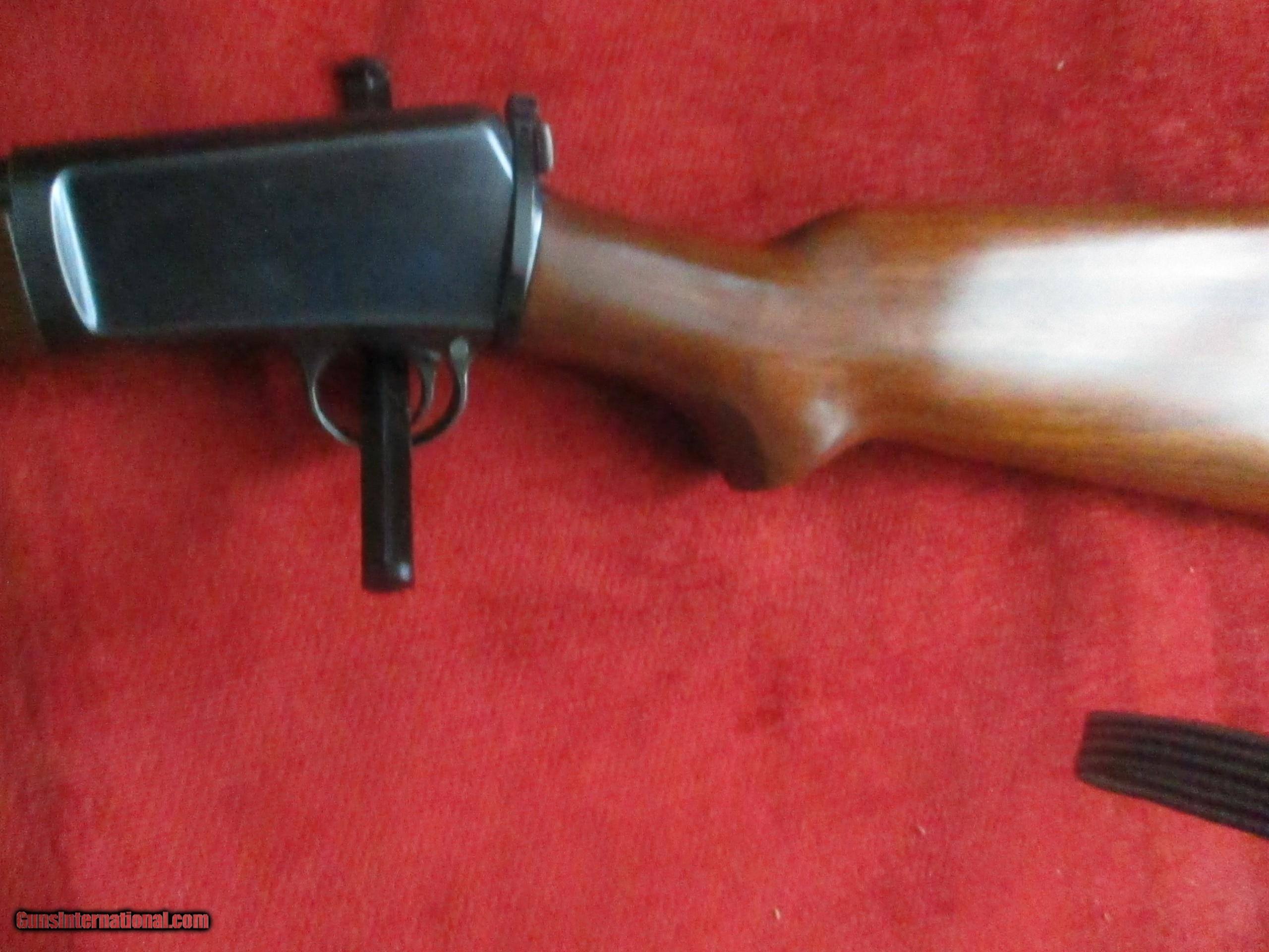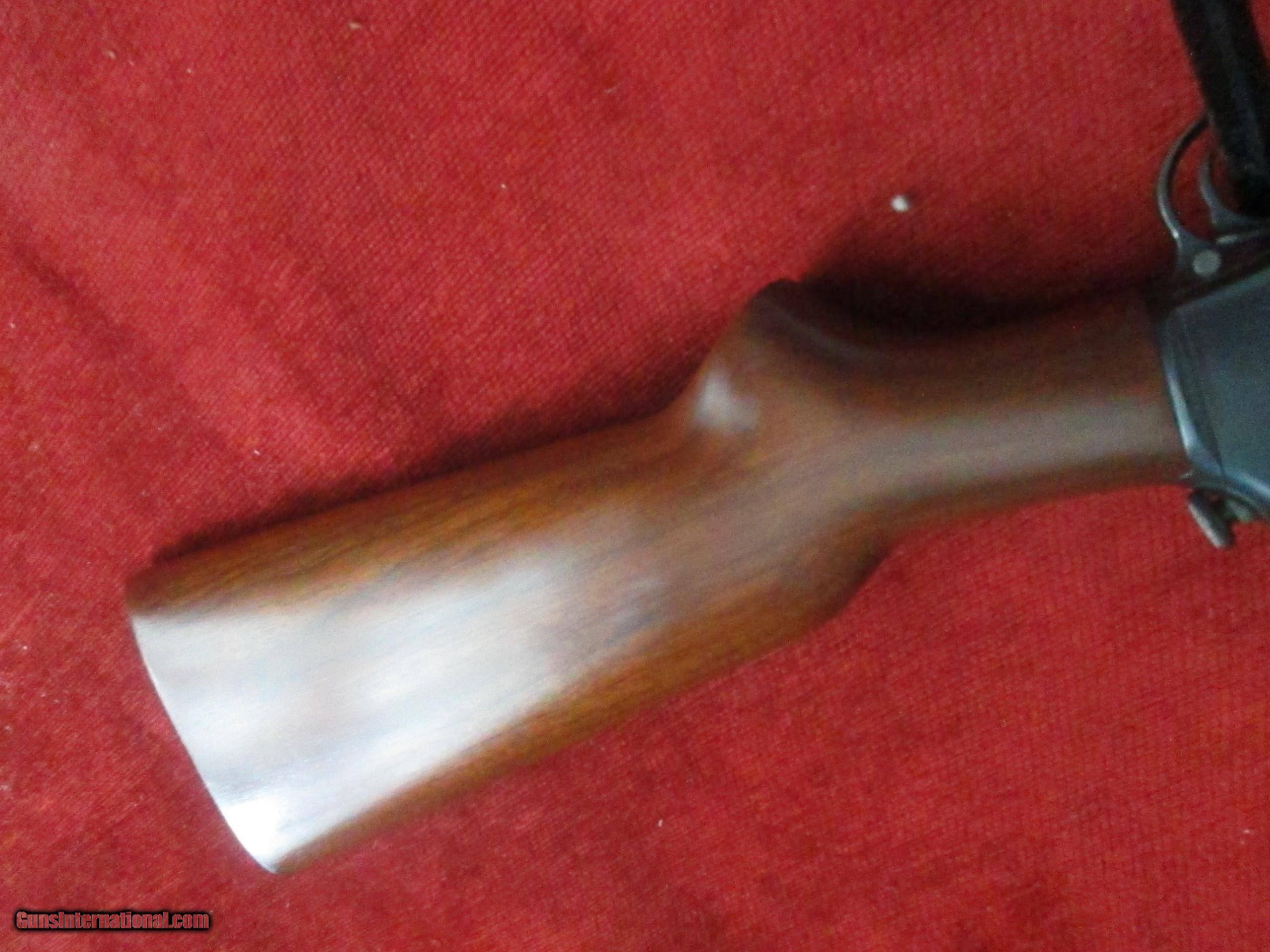 Description: 23" bbl., standing blade with bead front, open semi-buckhorn style rear, stock or rear fed magazine, figured American walnut stock & forearm, checkered steel creseant butt, 98% blue, minor blemish (no pits or surface damage) rt. rec.side pictured but barely visable, perfect bore, very tight, overall excellent condition, SOLD |