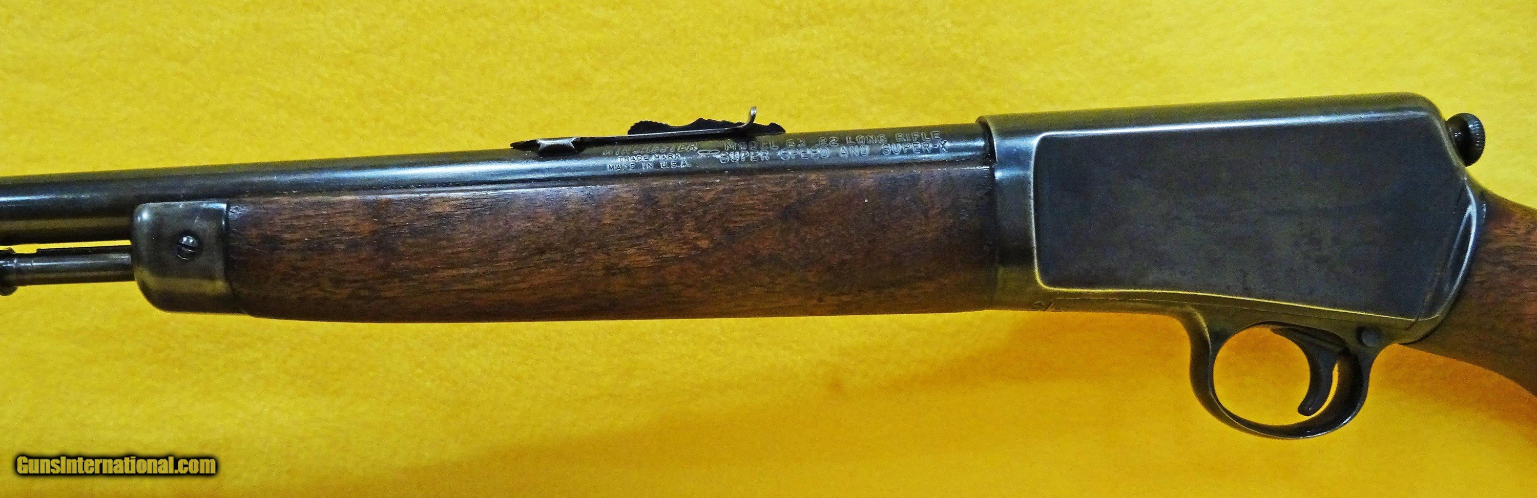 Description: WINCHESTER 63 IN .22 L.R., SUPER SPEED WITH 22 1/2" BARREL. COLOR BLUE. CONDITION 85+%. SERIAL NUMBER 131908A. WINCHESTER MODEL 63, BRIGHT SHINY BORE, TUBE FEED, WOOD EXCELLENT, PICTURES DO NOT DUE THE RECEIVER EDGE FINISH JUSTICE, ALL ORIGINAL, 85%+ OVERALL CONDITION, OUR STOCK # D89. YA12405 SOLD |