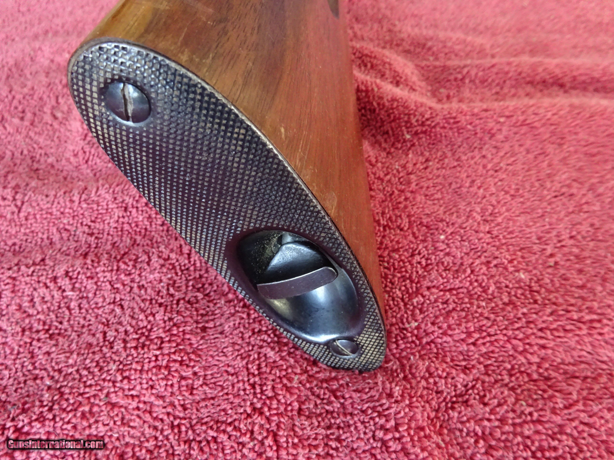 Description: WINCHESTER MODEL 63, GROOVED RECEIVER, 22 LONG RIFLE SUPER SPEED AND SUPER-X, 23" ROUND BARREL. EXCELLENT BLUE, MIRROR-PERFECT BORE, FIXED FRONT SIGHT, STEP ADJUSTABLE REAR SIGHT. PISTOL GRIP STOCK, SMOOTH FOREARM, BLACK PLASTIC FOREND CAP - WINCHESTER EXPERIMENTED WITH THE PLASTIC CAPS FOR A SHORT TIME IN EARLY 1958 THEN WENT BACK TO THE ORIGINAL STEEL CAPS. ALL WERE IN THE 172xxx SERIAL NUMBER RANGE. THIS IS AN UNUSUAL SELDOM ENCOUNTERED VARIATION. VERY GOOD SOUND WOOD WITH SCUFFS AND SCRAPES IN THE VARNISH, CHECKERED STEEL BUTTPLATE, 100% ORIGINAL CONDITION. DESIRABLE VARIATION. $1375.00 + $60.00 Insured shipping to an FFL address. Layaway is available. See all Pats gun listings on this site! We also have hundreds of pieces of ORIGINAL gun company advertising & memorabilia available for sale on our site SPORTINGCOLLECTIBLES. We have no reprints or reproductions. Email for more information. SOLD Curio/Relic: Yes |