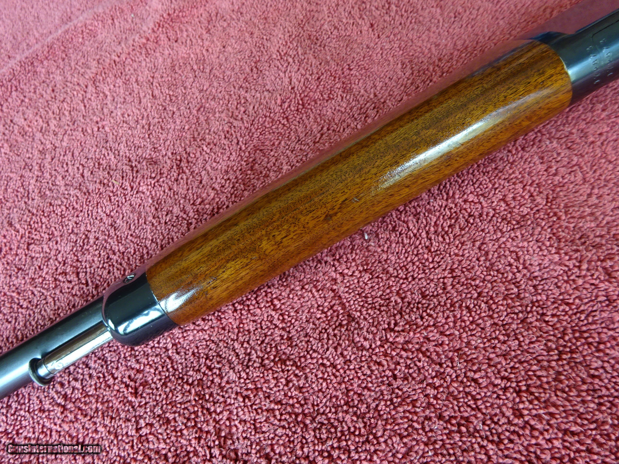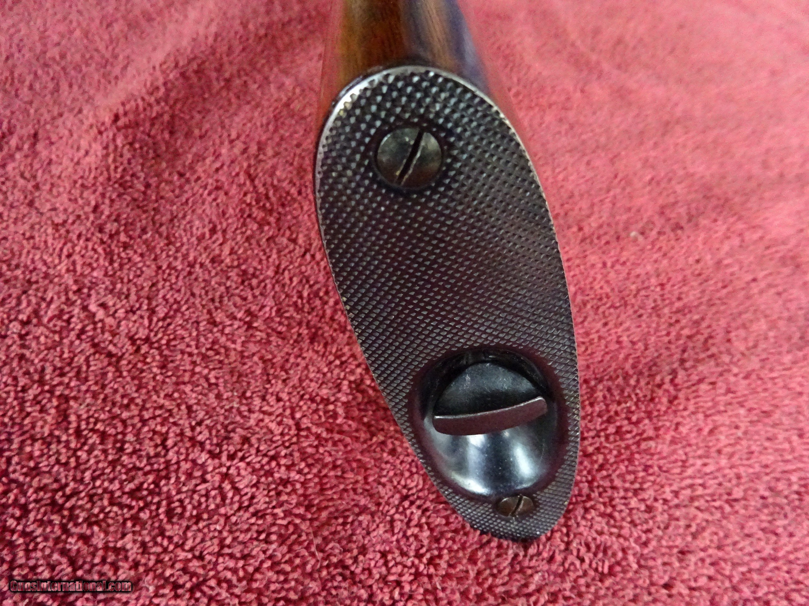 Description: WINCHESTER MODEL 63, 22 LONG RIFLE SUPER SPEED & SUPER-X. 23" BARREL, 100% BRIGHT ORIGINAL BLUE, MIRROR PERFET BORE. FIXED FRONT SIGHT, STEP ADJUSTABLE REAR SIGHT. GROOVED RECEIVER, FRAME AND TRIGGERGUARD ALSO 100% BLUE. SMOOTH PISTOL GRIP STOCK AND FOREARM, NEAR PERFECT WOOD FINISH, CHECKERED STEEL BUTTPLATE. FOREND CAP IS BLACK PLASTIC. WINCHESTER EXPERIMENTED WITH THESE AT ABOUT SERIAL NUMBER 172,000. THEY QUICKLY REALIZED IT WAS A MISTAKE AND WENT BACK TO THE STEEL VERSION. THIS GUN IS A SCARCE ORIGINAL VARIATION - INTERESTING IF YOU'RE A DIEHARD MODEL 63 COLLECTOR. THESE GUNS SELDOM COME UP FOR SALE. 100% ORIGINAL CONDITION, MADE IN 1957. $1595.00 + $70.00 Insured shipping to an FFL address. Layaway is available. See all Pats gun listings on this site! We also have hundreds of ORIGINAL gun company advertising & memorabilia pieces available for sale on our site SPORTINGCOLLECTIBLES. We have no reprints or reproductions. Email for more information. If you need to call, morning or evening is best, and please note the Seller's Inventory number. SOLD Curio/Relic: Yes |