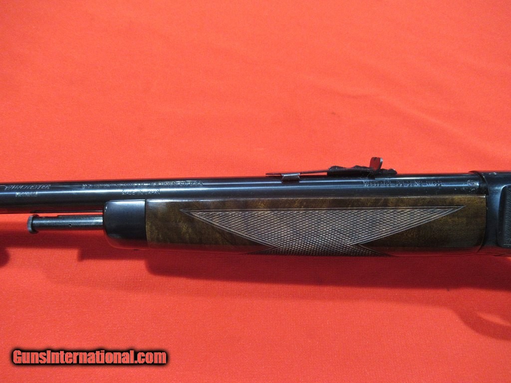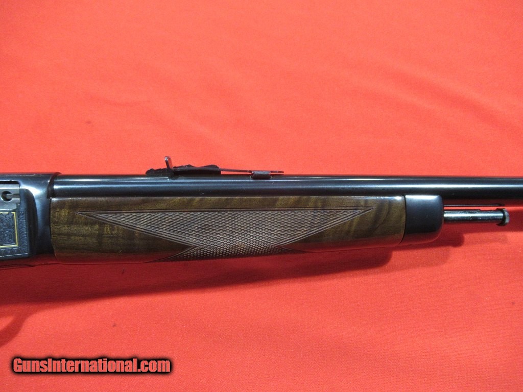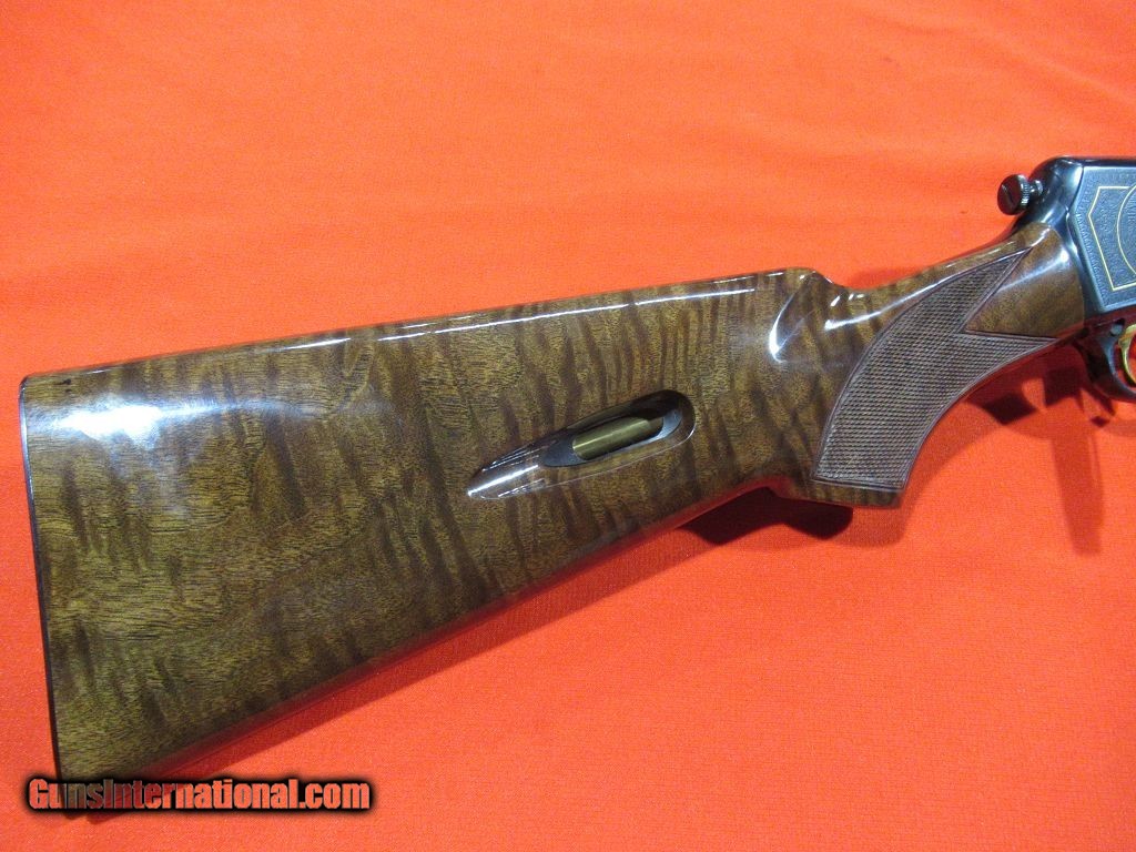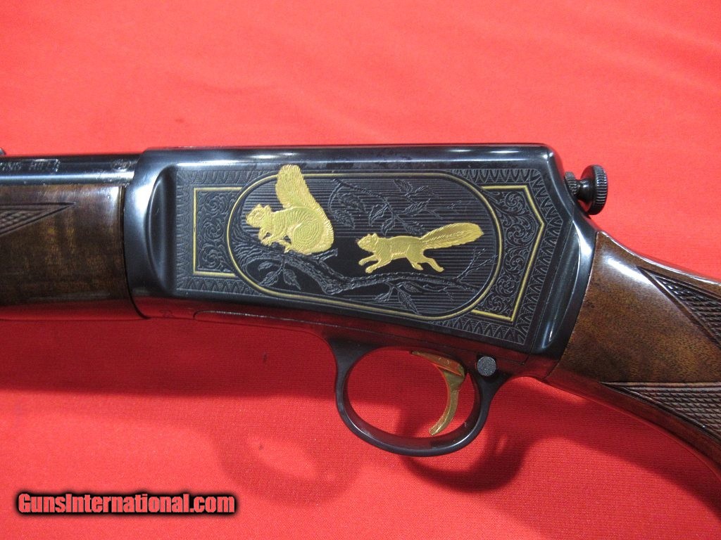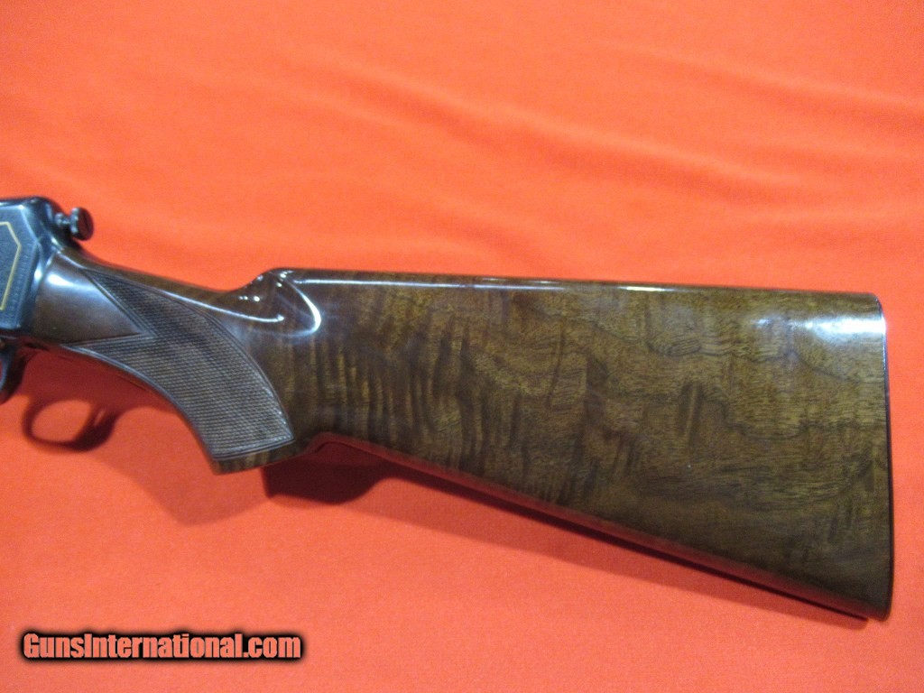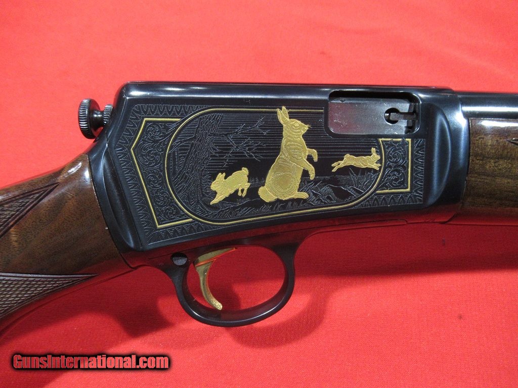 Description: Japanese Model 63 High Grade: nicely figured checkered stock and forend, gloss blue receiver with full coverage scroll and game scenes, gold rabbits on the right, gold squirrels on the left. Unfired and as new condition except for a small blemish on the heel of the butt plate. Comes with the factory box and paper work. SOLD |