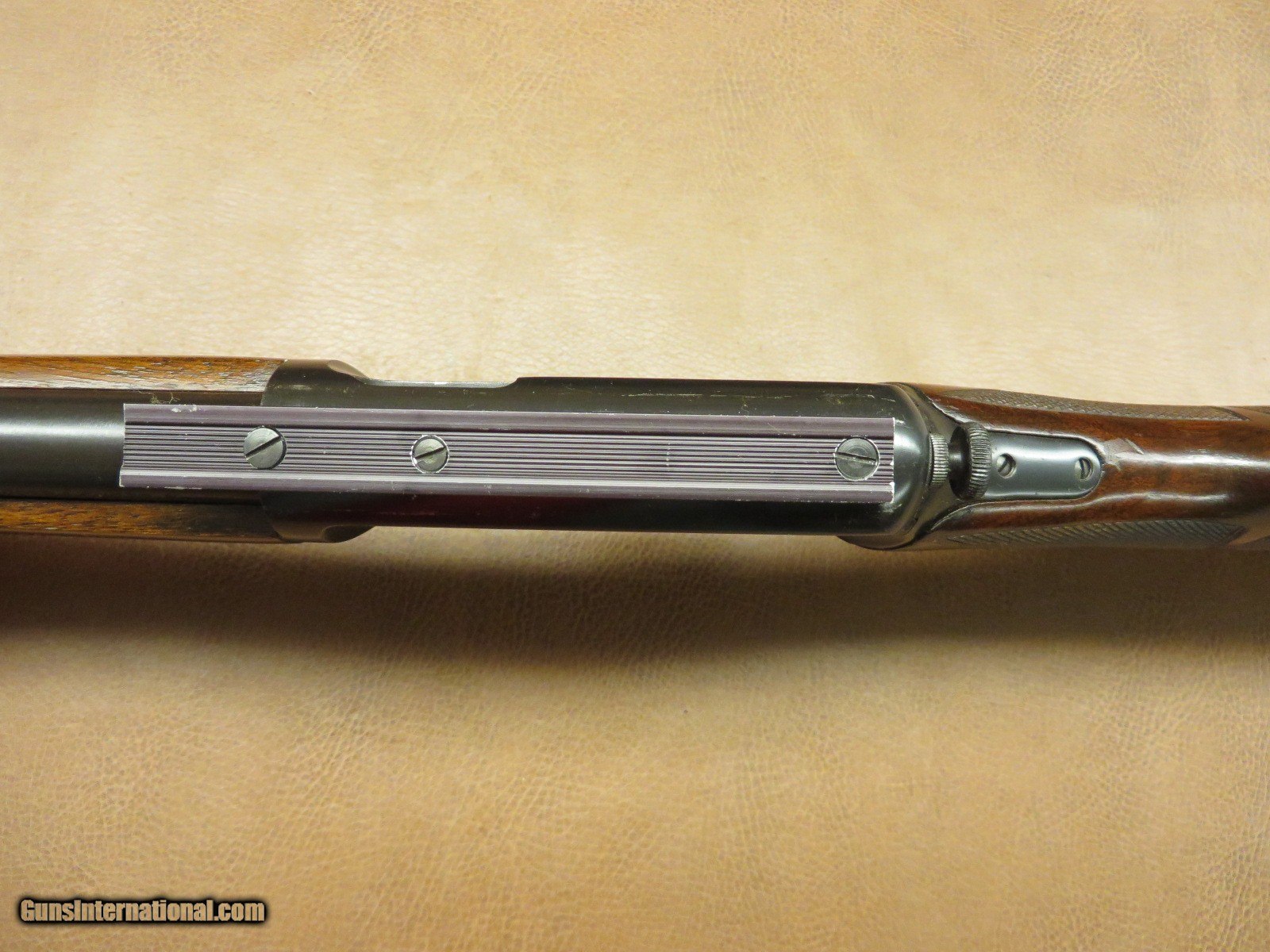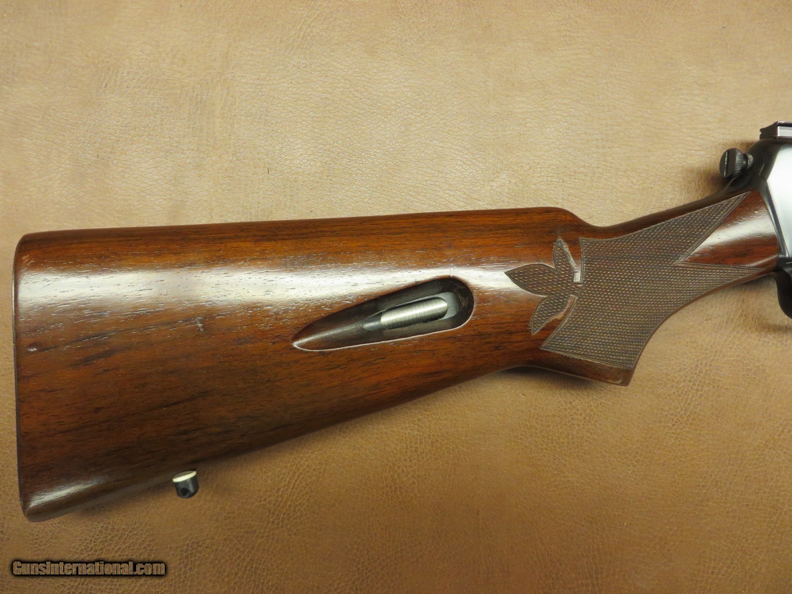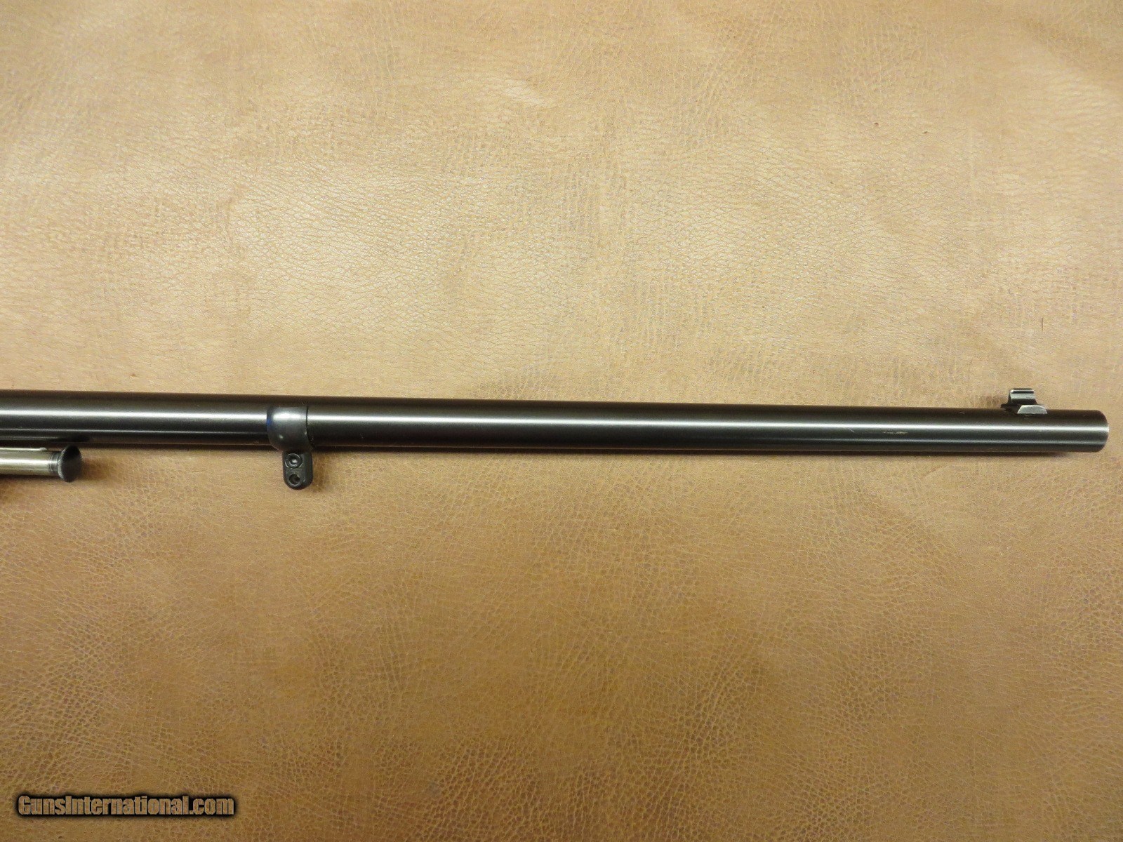 Description: .22 Long Rifle has 23 inch barrel with original front sight and a folding rear sight. Scope mounting base on top of receiver. Tang is factory drilled and tapped for tang sight. Serial number 51xxxA. Wood has been professionally checkered. Original non checkered steel butt plate and magazine tube through stock. Sling swivel stud in stock and one in band around barrel. All in 95%+ condition. SOLD |