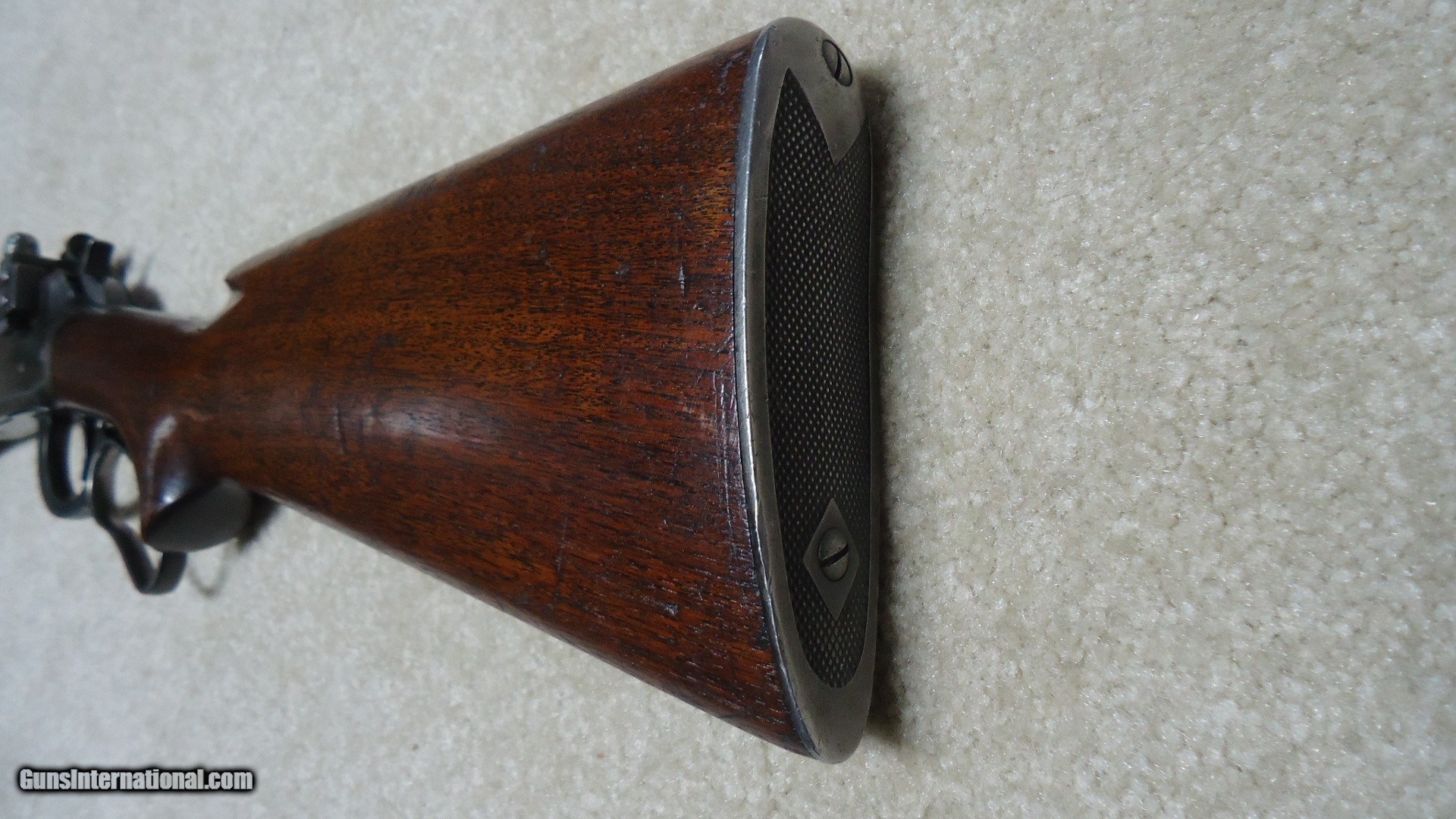 Description: RARE 20" CARBINE MODEL 64 LEVER RIFLE IN .30WCF, #1097XXX, MADE IN THE SECOND YEAR OF PRE-WAR PRODUCTION IN 1935. The standard barrel length of the Model 64 was 24" (except 26" for .219 Zipper caliber). Very few carbines with 20" barrels were made. According to the Winchester Handbook by Madis, the sales records show that from 1939-1941 only 334 of these standard M-64s with 20" barrels were sold. With the Great Depression in full swing by the year of introduction of the M-64 in 1933, sales for all calibers and barrel length were limited. After World War II, the Model 64 was continued, but the 20" carbine was not offered. This example came out of here in Montana and no doubt as some great hunting history in it! It retains fine deep barrel and magazine blue. The receiver blue has thinned to silver on the right side with good blue toward the front portion and on the loading gate, the left side shows good blue on the top portion and around the period correct fully adjustable Redfield receiver sight0- by the way the blue is good were protected by this sight leads me to believe it is original to the rifle. The bolt retains fine blue and the front sight on the barrel still has the hood attached. The rear sight dovetail has a blank filler. The butt stock and forearm are solid and show good original stock finish, only minor handling marks and just some slight wear to the bottom edge of the pistol grip on each side- probably from saddle scabbard use. Excellent screws and excellent bright bore. A rare Winchester model right out of the Great Depression! SOLD Curio/Relic: Yes Manufacturer: Winchester Model: M-64 CARBINE Serial Number: 1097XXX Barrel Length: 20 Condition: FINE Bore Condition: EXCELLENT |