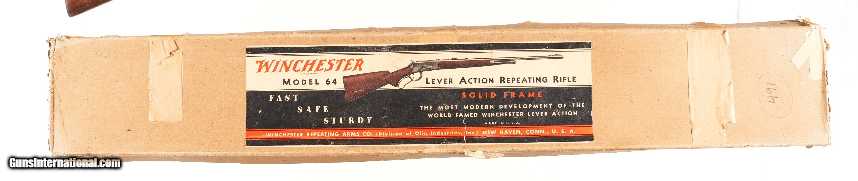 Description: Pre-War Boxed Winchester Model 64 Rifle cal, .32 Win, Spl, with original sales receipt. Rifle Mfd, 1933 with blue finish , ramped & hooded front sight with varnished pistol grip walnut stocks with checkered steel butt plate. Rifle is housed in original numbers matching Picture box with full label, Safety instructions and cleaning rod in original Outer's cardboard storage tube. Included is the numbers matching sales receipt from Sams Sporting Goods in Medford Oregon dated 9/6/ 1940 for the rifle, cleaning kit, ammunition and cleaning patches.. Condition, Rifle remains very fine with 97% finish on Bbl and magazine. Receiver has lower edge wear from use. Stocks are very fine with typical carry wear/ Bore is excellent and mechanically fine. The box is very fine with loose corners. Picture label remains vivid. Numbered end label is very good with light flocking. • Free Shipping, No Credit Card Fees. • Lay-a-way available for this firearm. • 1/3 Down, a 1/3 in 30 Days, 1/3 in 60 Days. SOLD Curio/Relic: Yes Manufacturer: Winchester Model: 64 Serial Number: 1623742 Barrel Length: 24 |