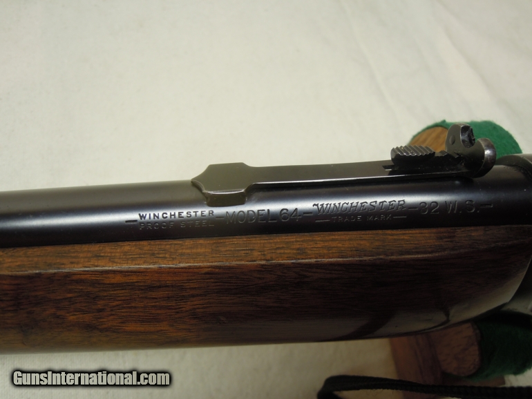Description: Winchester Model 64 "Carbine" - Cal. .32W.S. - 20" Bbl. - SN 1756XXX (1951). Absolutley perfect bore and action - excellent metal has no rust, pits, or corrosion and retains 99% original finish - shows only very slight wear at sharp edges at bottom of receiver - steel butplate has sharp checkering and 100% blue. Wood is excellent and undamaged with nice grain in buttstock - shows only a few light surface scuffs and sctratches, mostly on the bottom toe area of the buttstock.- wood retains 98% original finish. Overall, a near mint and all original Model 64 in the very scarce and desirable 20" Carbine configuration. SOLD Curio/Relic: Yes |