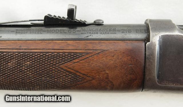 Description: Winchester, 65 Deluxe, .218 BEE, 24" bbl, shiny bore, good rifling, blued finish, normal wear, wood stock, diamond checked grip and forearm, and metal butt plate. Add 3% for Credit Card Shipping $25.00 SOLD |
