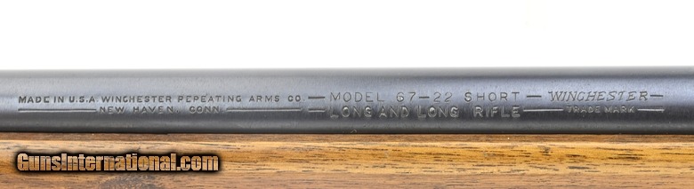 Description: Winchester 67 .22 S, L, LR caliber rifle. Single shot rifle made prior to 1968. Bore is excellent. Very good plus overall condition.