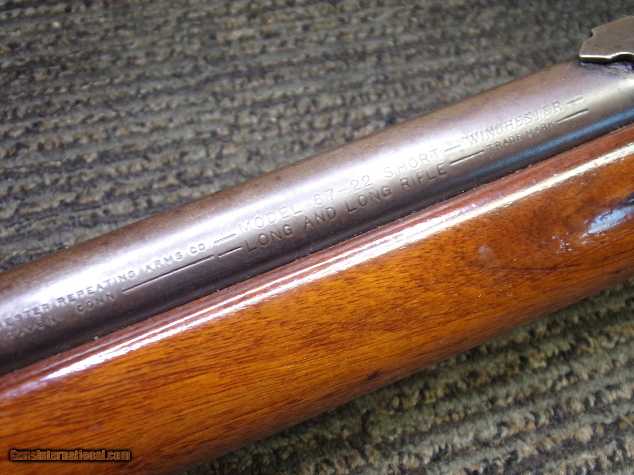 Description: Guns Listing ID: 566379 Winchester model 67 bolt action single shot rifle...shoots 22 S,L,LR....wood stock...27\" barrel with sights SOLD Manufacturer: WINCHESTER Model: 67 Caliber Info: 22 CAL Condition: Used - Non-Certified Barrels: 2.7 BARREL Finish: BLACK |