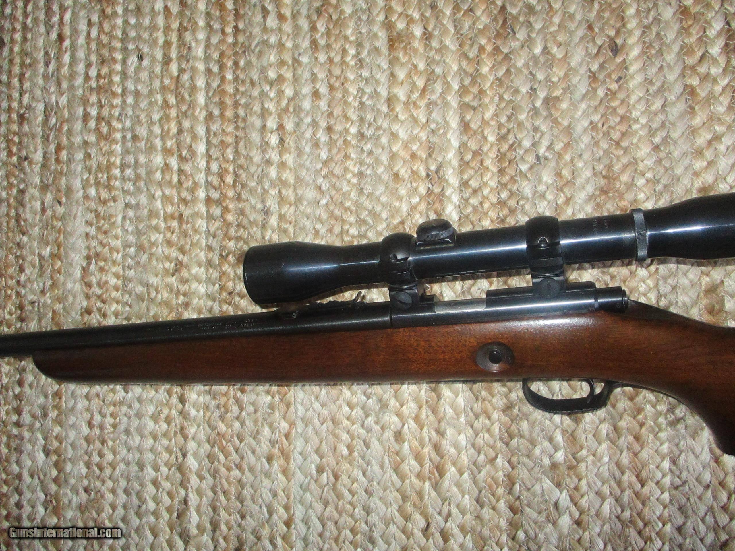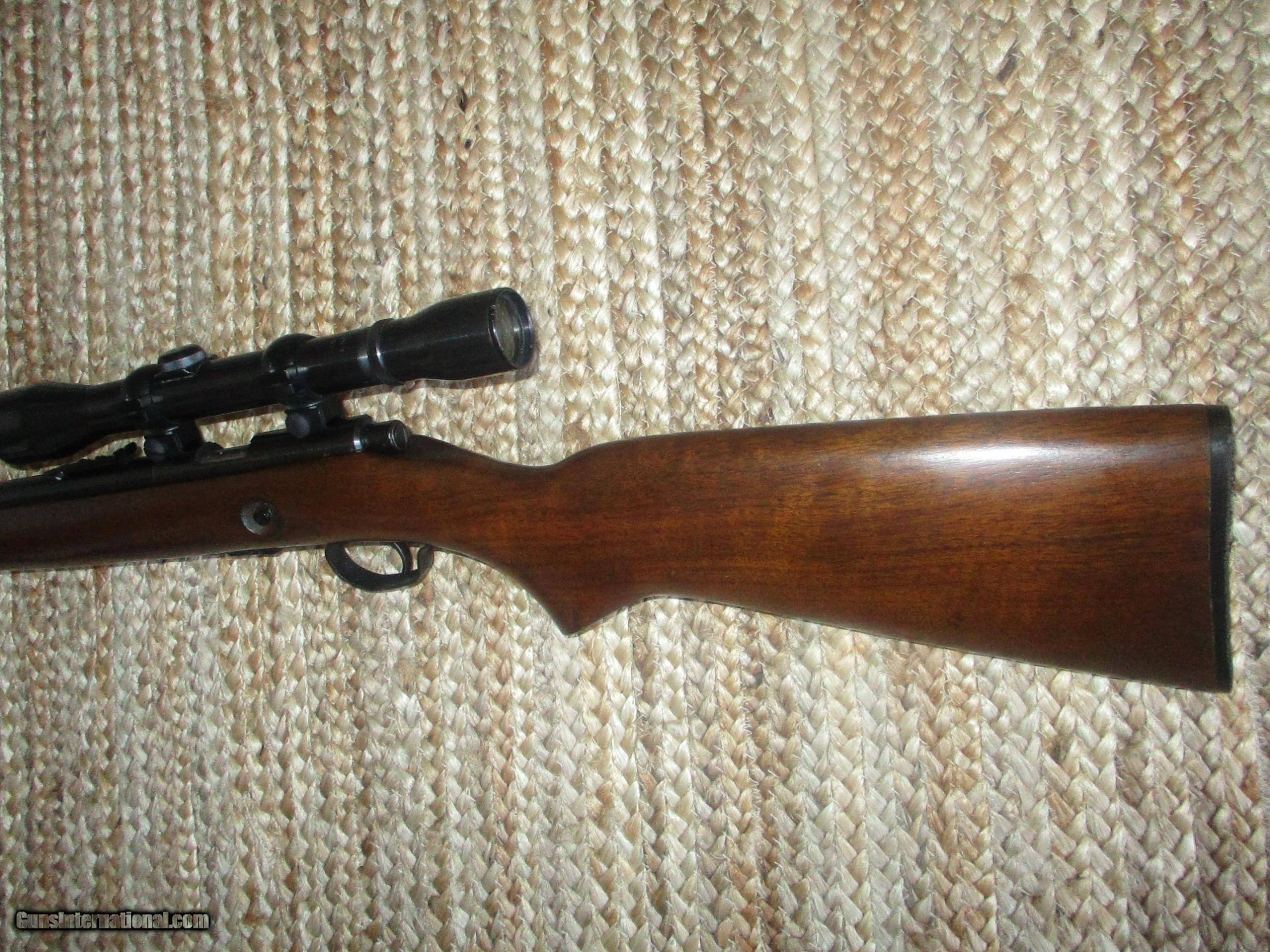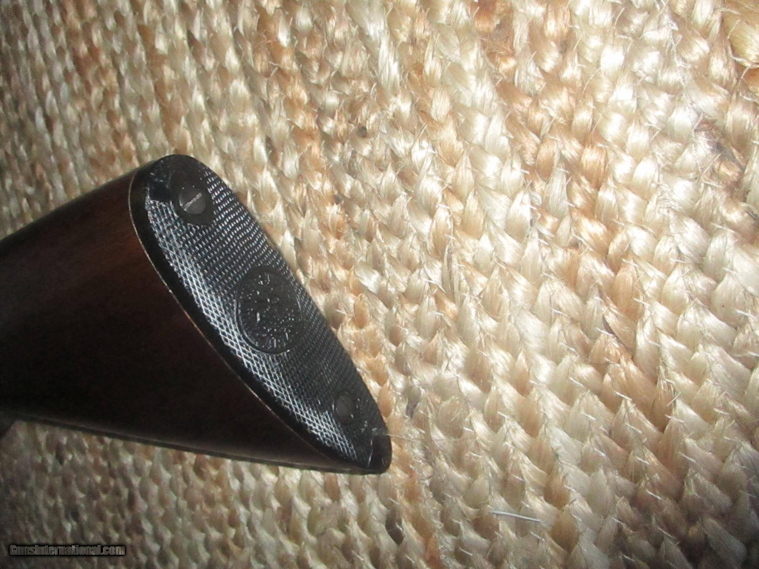 Description: 25" bbl., blade front, open rear, grooved receiver, Weaver 1" rings carrying, steel tube Weaver K4, small crosshair retical,figured American walnut stock, original Winchester buttplate, 99% overall as new original condition, fired verry little!! (This 69A Looks New Condition) SOLD |