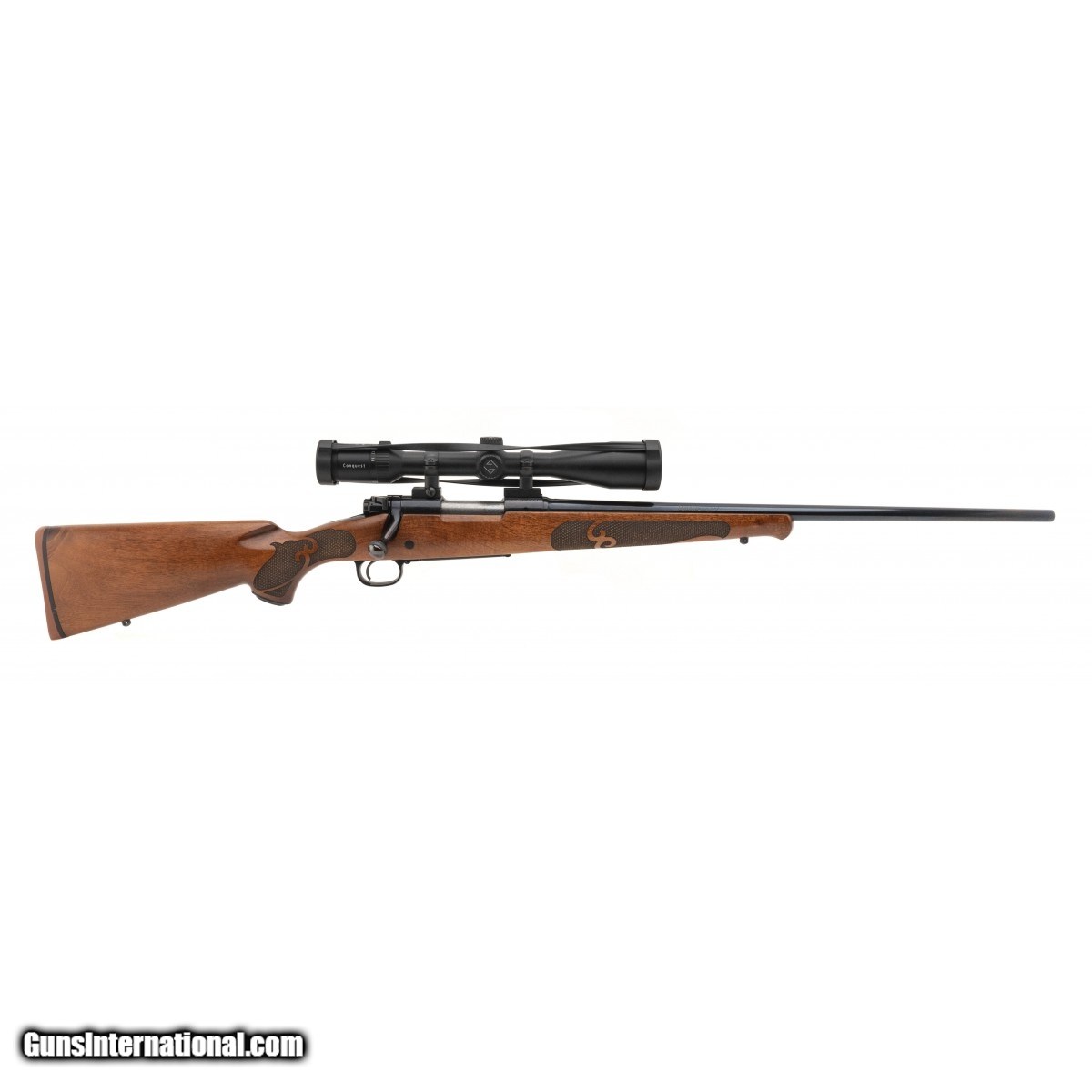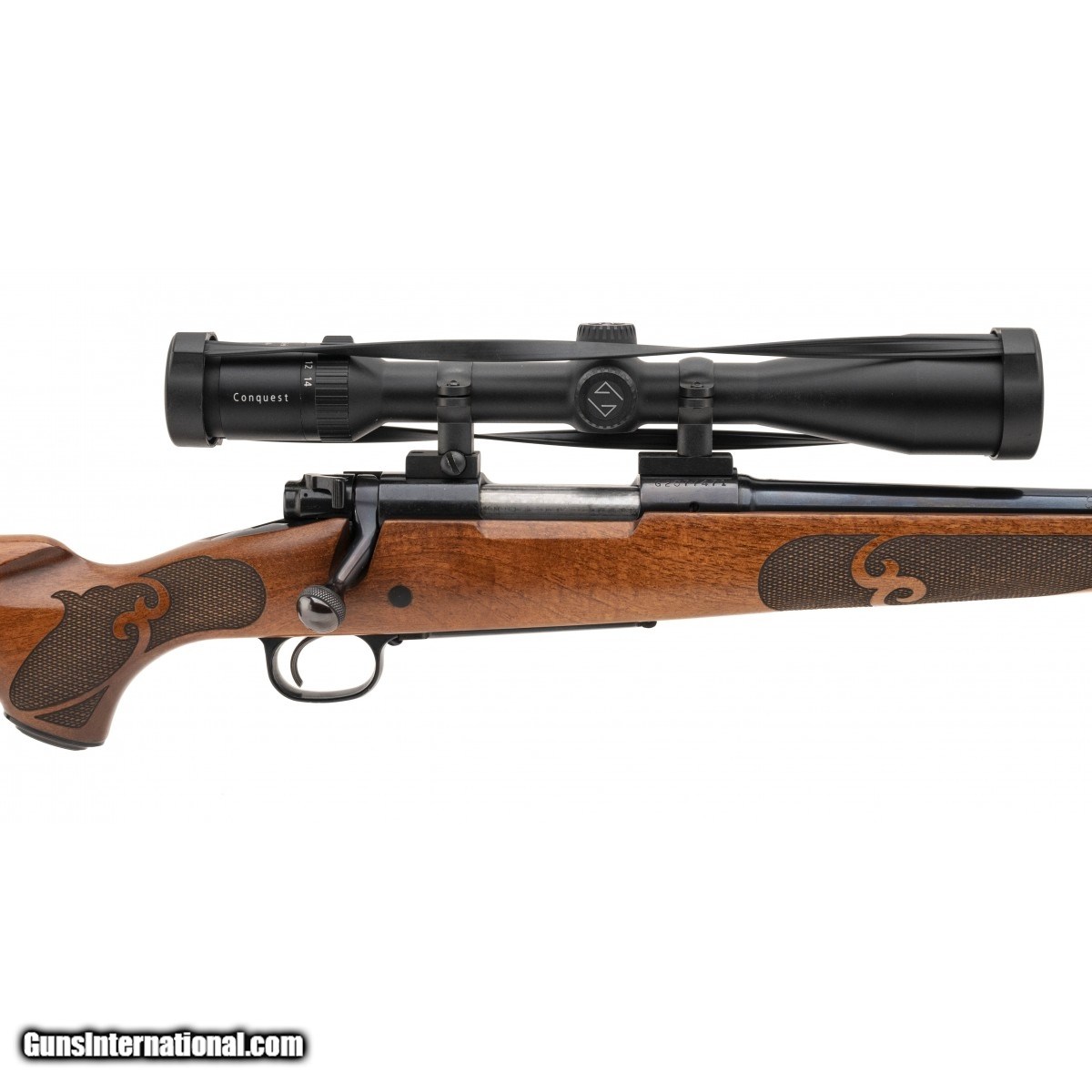 Description: " SN: G2077471. Modern production. Winchester Model 70 bolt action rifle in .22-250. Grade II Featherweight model with 22"" barrel, deluxe sporter stock and bolt jeweling. Great condition with light mechanical wear on the bolt body and small handling marks on the barrel between the stock and muzzle. Wood is excellent. Comes with mounted Zeiss Conquest 4.5-14x44 scope. Austin location. SOLD |