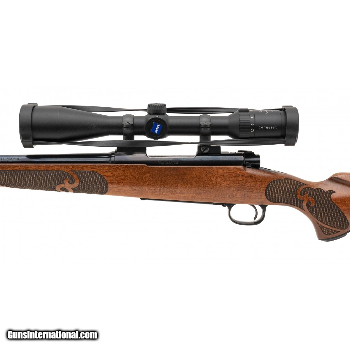 SN: G2077471. Modern production. Winchester Model 70 bolt action rifle in .22-250. Grade II Featherweight model with 22"" barrel, deluxe sporter stock and bolt jeweling. Great condition with light mechanical wear on the bolt body and small handling marks on the barrel between the stock and muzzle. Wood is excellent. Comes with mounted Zeiss Conquest 4.5-14x44 scope.