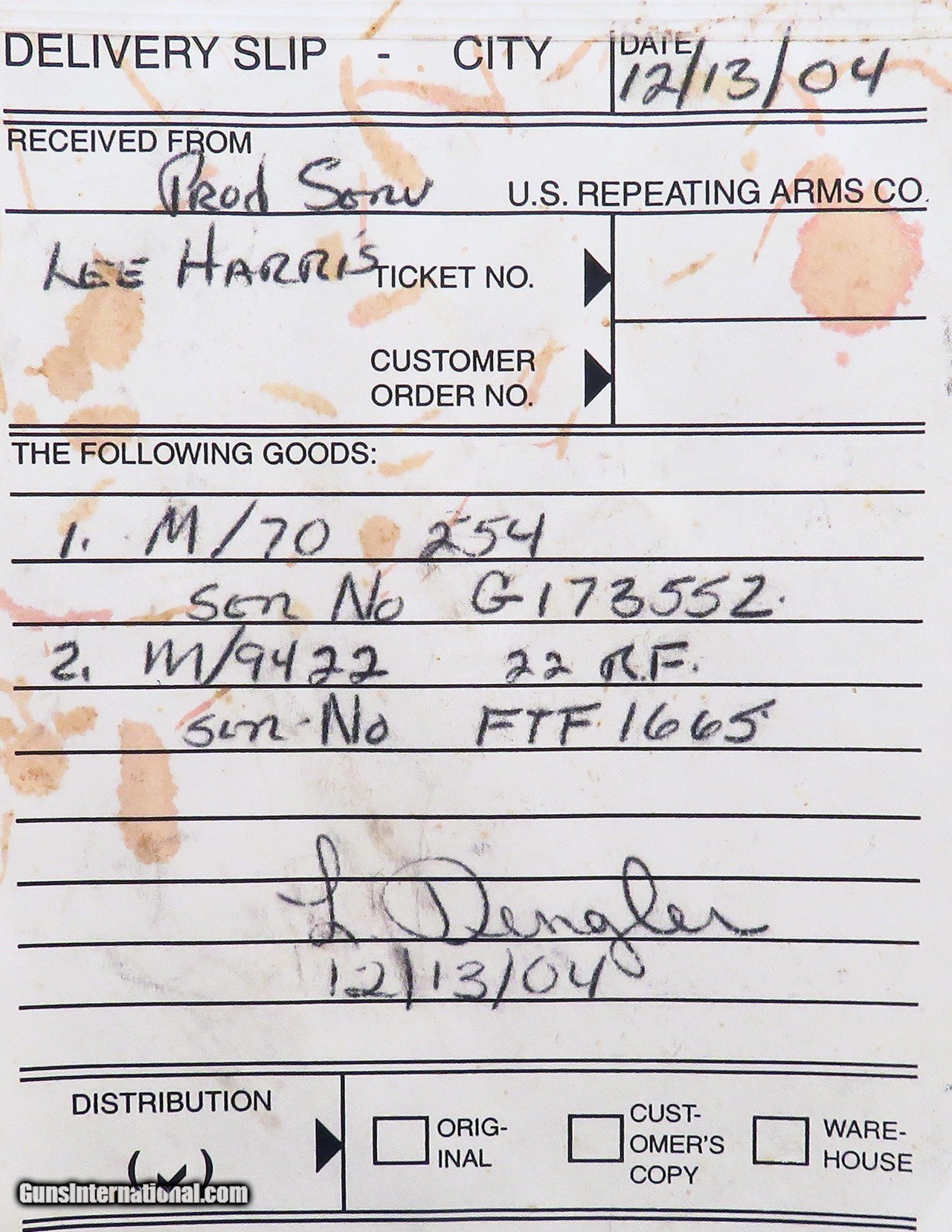 Description: Left hand Winchester Model 70 .35 Whelen. Built in the Winchester/USRAC Custom Shop circa 2004 by the Senior Design Engineer responsible for the Model 70 program as his personal bear hunting rifle and consigned by his estate, serial G173552 is both unique and important. Features include a 24-inch barrel with hybrid marking (factory roll mark with stylus caliber designation as the caliber was not catalogued), CRF action with full-length claw extractor, jeweled bolt body, three-position safety and a knurled bolt knob. Metal finish is polished blue. STOCK: Drawn from a AA-grade claro blank, formalities include wrap checkering, single crossbolt, scalloped cheek rest, Winchester logo recoil pad, sling swivel studs and a satin finish. The stock is bedded at the lug and rear guard screw. DIMENSIONS: Weight is 7.8 pounds and the length-of-pull is 13.85 inches. CONDITION: Appears to be unfired since proof. The bore is strong and bright. Metal finish is approximately 98 percent with minor traces of freckling on the bottom metal. Wood is at least 99 percent. INCLUSIONS: Factory box (no end label, a box was required to remove firearms from the factory) and delivery slip showing removal date of 12/13/04 plus serial is included. The box has some taping and tape removal marks. Upon request, a personalized letter from the estate will be mailed directly to the purchaser. The price is firm and layaway is available. $6,500 plus shipping. SOLD Rifle Caliber: .35 Whelen |