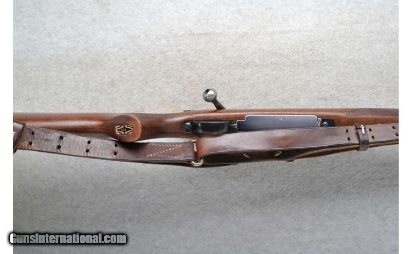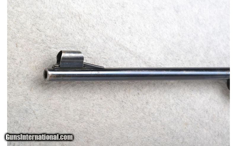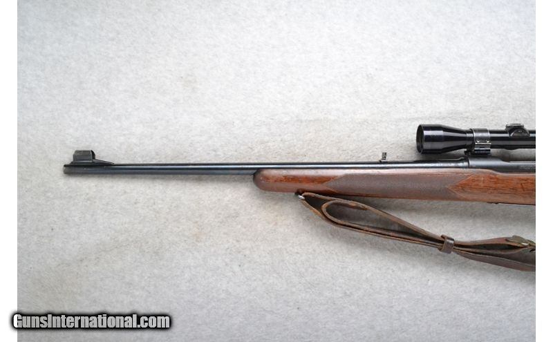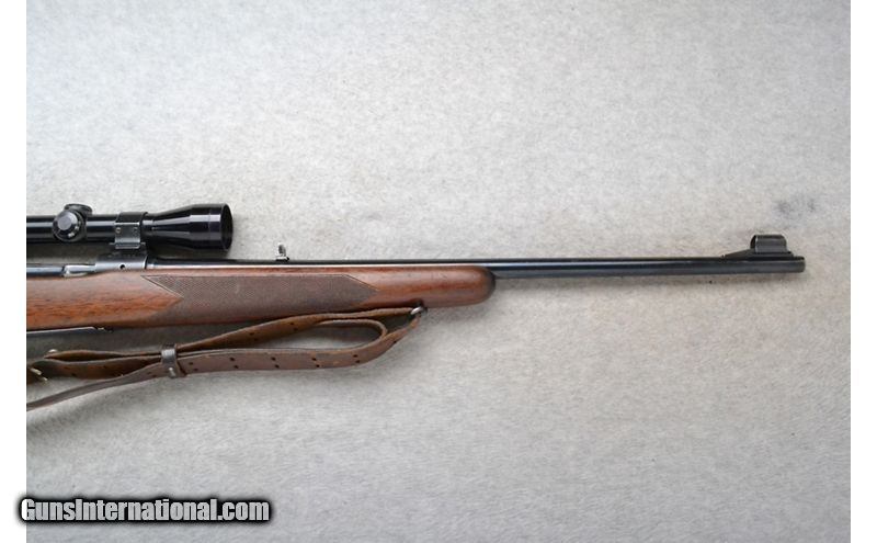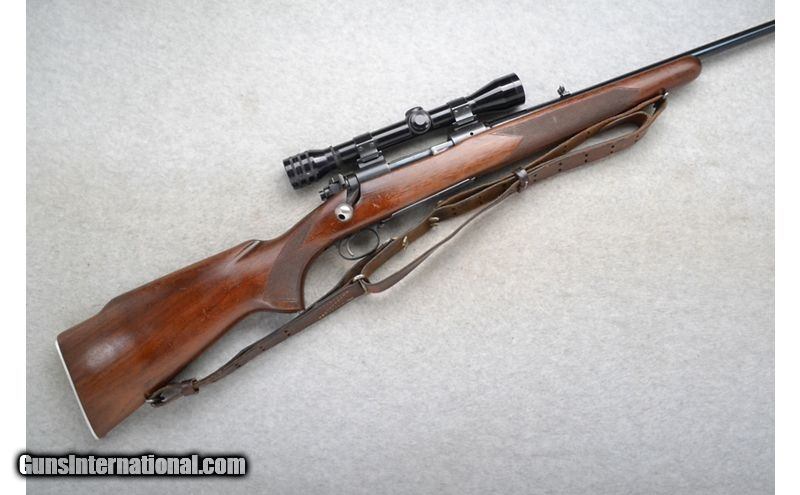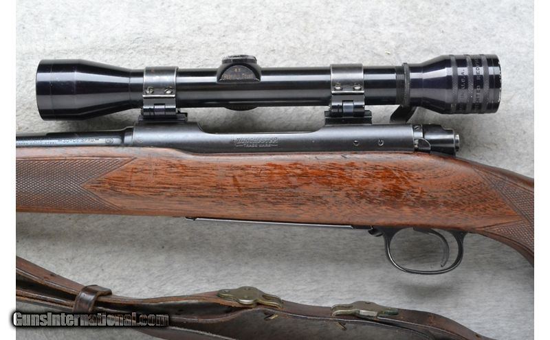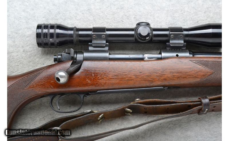 Description: This Winchester Model 70 is a right hand bolt action rifle in .30-06 Sprg. Cal. It has a 22 inch barrel. A hooded front blade sight and an adjustable notch middle sight. It is outfitted with a Redfield 4X Scope. The butt stock is a checkered grip walnut pistol grip. The forearm is a checkered grip walnut. Comes with a leather sling. S/N 416729 (1957). .30-06 Springfield SOLD Chambers: Internal magazine with a hinged floorplate. Metal Condition: "Good. Minor blue wear, handling marks and freckling. Wood Condition: Fair. Has handling marks and finish wear. Bore Condition: Very Good. Barrels: 22 inch. Stock Dimensions: LOP 13 1/4 inches. Fore End: Checkered grip walnut. Butt Pad: Checkered aluminum plate. Weight: 7 Lb. 14 Oz. Sights: Hooded front blade. Folding adjustable notch middle. Item Location: Richfield, WI |