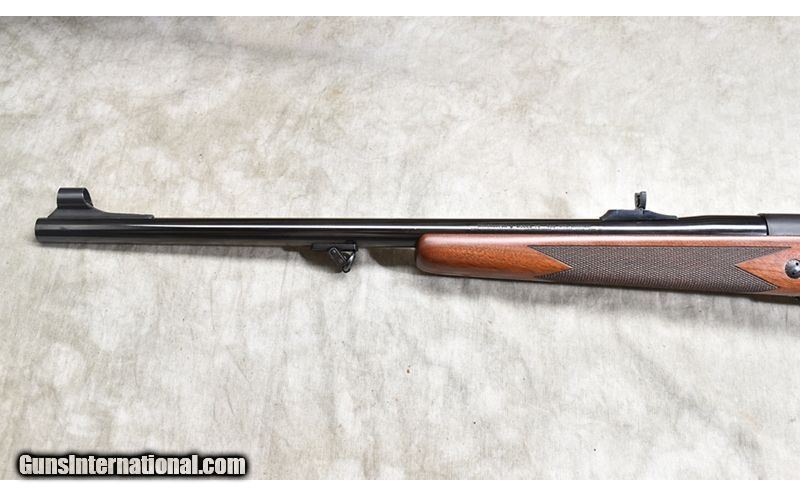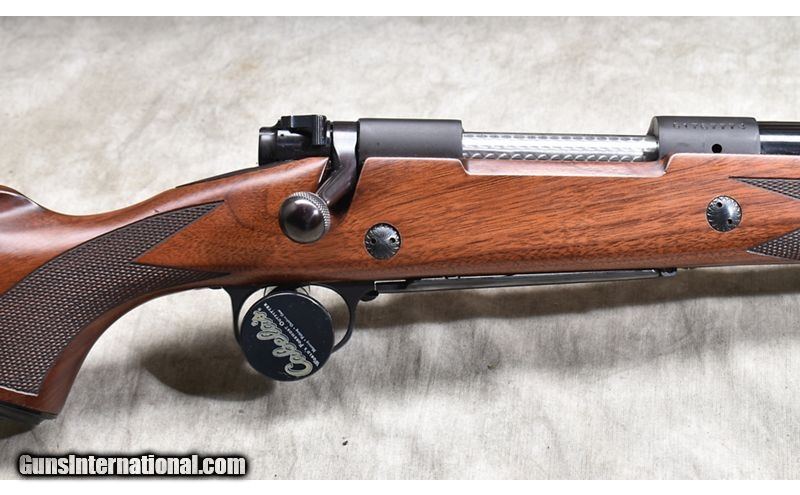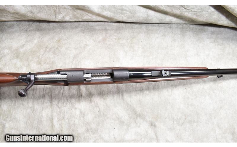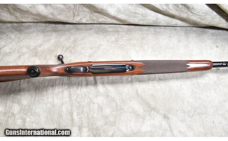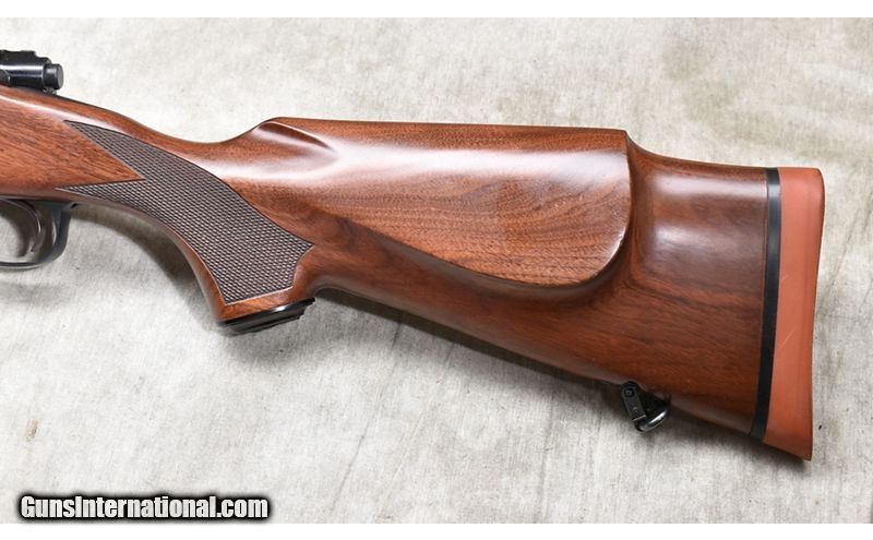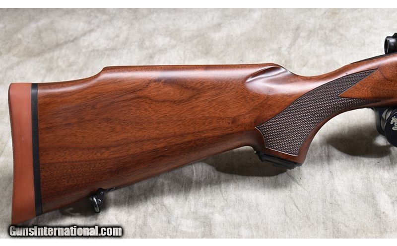 Description: This African Safari Class rifle features a walnut Monte Carlo pattern stock with sharp checkering. It has a jeweled bolt and the internal box magazine has hinged floor plate and jeweled follower. Based upon the S/N G1767xxx, this rifle was manufactured in 1984. It is in excellent condition showing little to no wear. .458 Winchester Magnum SOLD Chambers: 4 Metal Condition: Excellent. Wood Condition: Excellent. Bore Condition: Shiny and bright with good rifling Barrels: 22-inch heavy barrel Triggers: Factory trigger Stock Dimensions: 13-1/2 inch LOP Fore End: Checkered. Butt Pad: Soft red rubber pad. Sights: Hooded bead and folding leaf open sights. Drilled and tapped for scope. Item Location: Rogers |