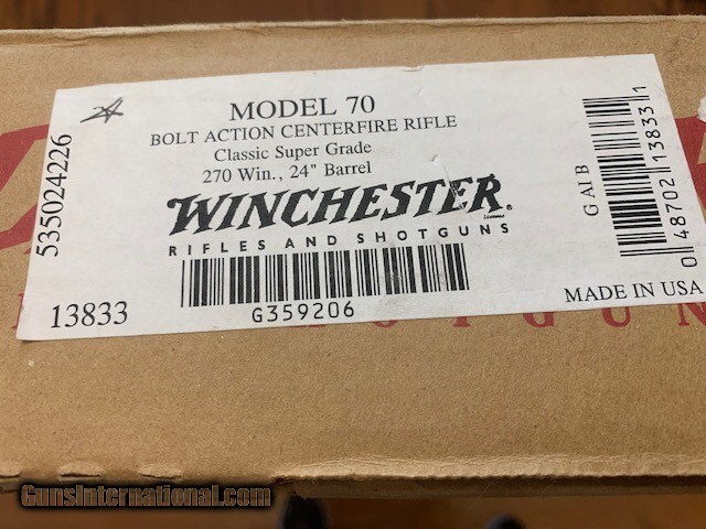 WINCHESTER 70 CLASSIC SUPER GRADE 270 WIN. CAL. MFG. IN USA, BEAUTIFUL WOOD, NEW IN THE BOX WITH OWNERS MANUAL ETC.