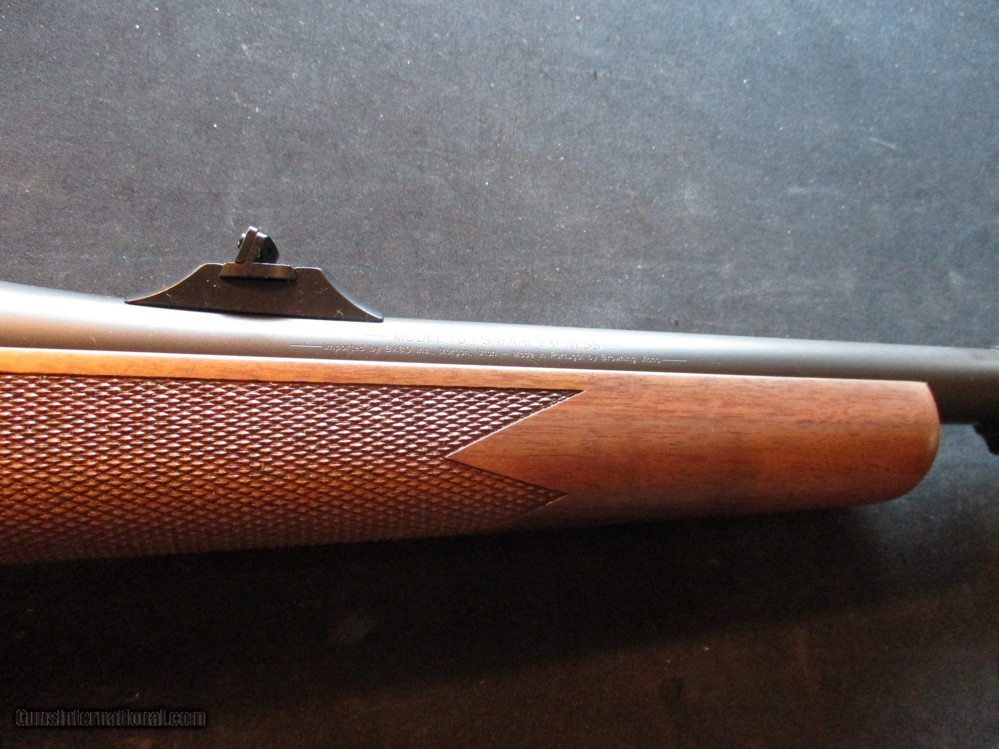 Description: Winchester Model 70 Safari Express, new in box. Email me if you would like these pics sent to you, they will come through bigger and better than on the listing page here. We do offer Lay-A-Way. Our standard terms are 25% down, 90 days. Initial deposit is not refundable. Email me with any questions. I am a store front dealer, and I will close s if the gun sells locally. Once it has aI will pull it from my shelves. Please check your local laws to confirm it is legal to own in your state! Buyer pays $25 shipping and insurance to your FFL in the lower 48. AK, HI or PR is extra. I will ship to California, NO PROBLEM! All my guns come with a non-firing, 3 day unconditional return privilege, from the day UPS delivers to your dealer. Buyer pays shipping both ways if the gun comes back. I can add a new hard case by PLANO for secure shipping for $25 if the buyer wishes (highly recommended, cheap insurance, really helps keep the UPS monster from eating my guns!). No sales tax on guns ship out of Kansas, guns sold in Kansas are subject to Kansas sales tax. I am a licensed FFL, and will include a copy of my FFL with the gun for your dealer’s records. I will ship to a C&R if the gun is eligible. I will ship to California, but you need to confirm the gun is legal where you are, California or other. WE BUY AND CONSIGN GUNS AND GUN COLLECTIONS! We will travel to pick up collections! I am always looking for good clean, old original Winchesters to buy, consign, or trade, especially Pre '64's model 70's and model 54's. WE ALSO TRADE FOR CLASSIC CARS AND TRUCKS! Email me with any questions, and good luck! SOLD |