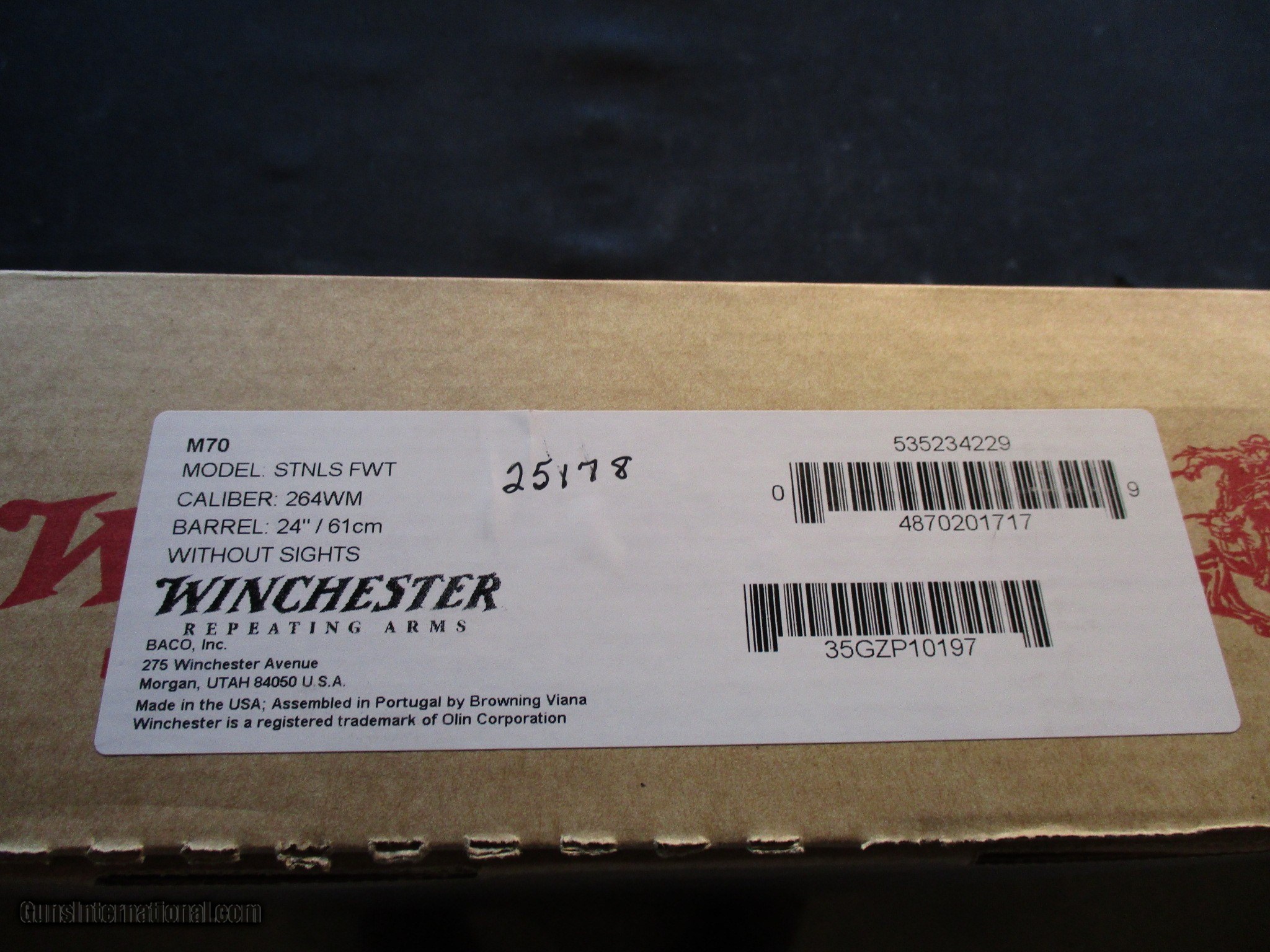 Description: Winchester Model 70 Stainless Featherweight, new in box. Email me if you would like these pics sent to you, they will come through bigger and better than on the listing page here. We do offer Lay-A-Way. Our standard terms are 25% down, 90 days. Initial deposit is not refundable. Email me with any questions. I am a store front dealer, and I will close s if the gun sells locally. Once it has aI will pull it from my shelves. Please check your local laws to confirm it is legal to own in your state! Buyer pays $25 shipping and insurance to your FFL in the lower 48. AK, HI or PR is extra. I will ship to California, NO PROBLEM! All my guns come with a non-firing, 3 day unconditional return privilege, from the day UPS delivers to your dealer. Buyer pays shipping both ways if the gun comes back. I can add a new hard case by PLANO for secure shipping for $25 if the buyer wishes (highly recommended, cheap insurance, really helps keep the UPS monster from eating my guns!). No sales tax on guns ship out of Kansas, guns sold in Kansas are subject to Kansas sales tax. I am a licensed FFL, and will include a copy of my FFL with the gun for your dealer’s records. I will ship to a C&R if the gun is eligible. I will ship to California, but you need to confirm the gun is legal where you are, California or other. WE BUY AND CONSIGN GUNS AND GUN COLLECTIONS! We will travel to pick up collections! I am always looking for good clean, old original Winchesters to buy, consign, or trade, especially Pre '64's model 70's and model 54's. WE ALSO TRADE FOR CLASSIC CARS AND TRUCKS! Email me with any questions, and good luck! SOLD |