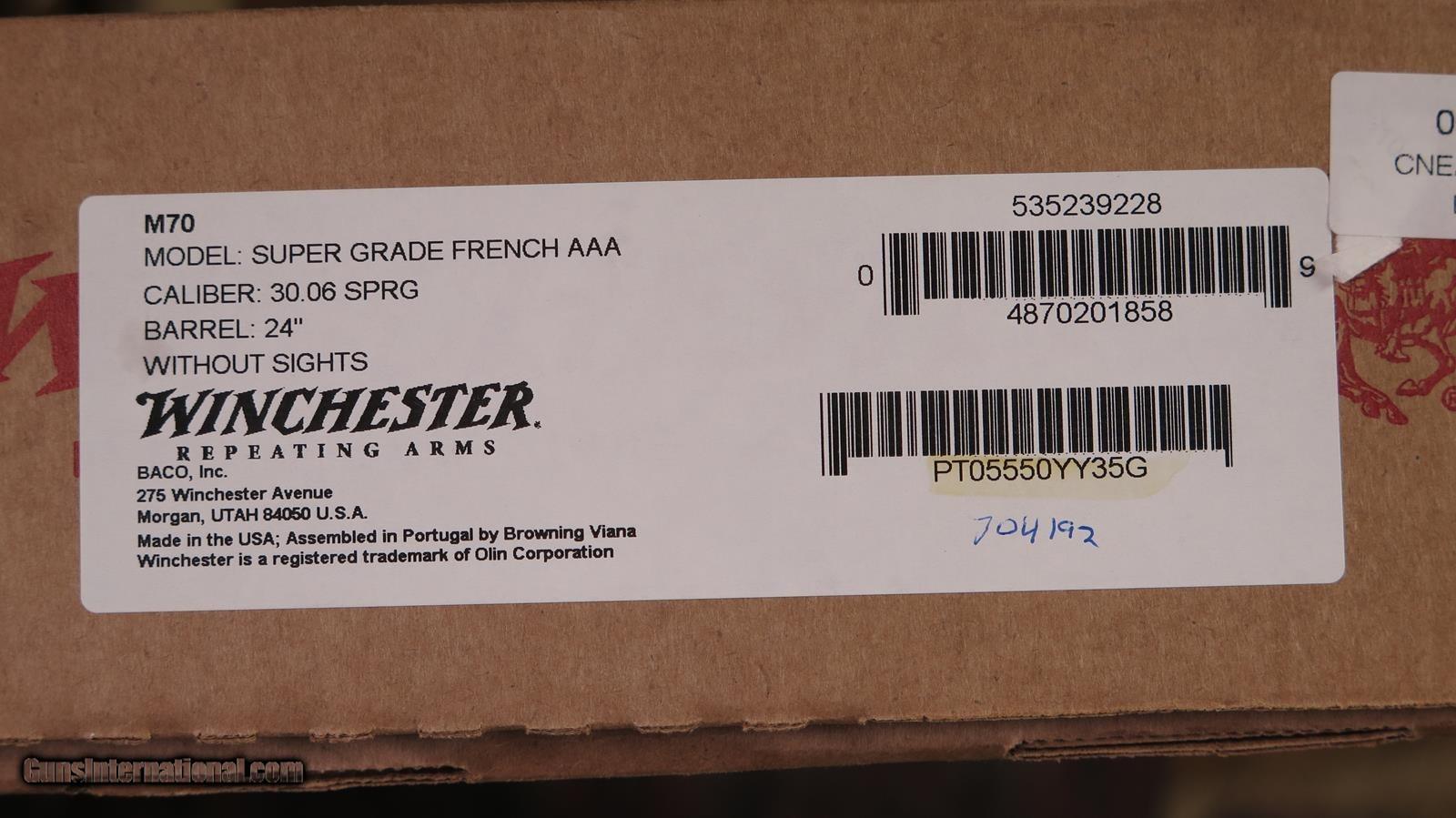 Description: Winchester 70 Super Grade 30-06. AAA French walnut. 24 inch barrel. Control feed. Beautiful grain in wood. 99% condition in original box with manual. SOLD Rifle Caliber: .30-06 Springfield |