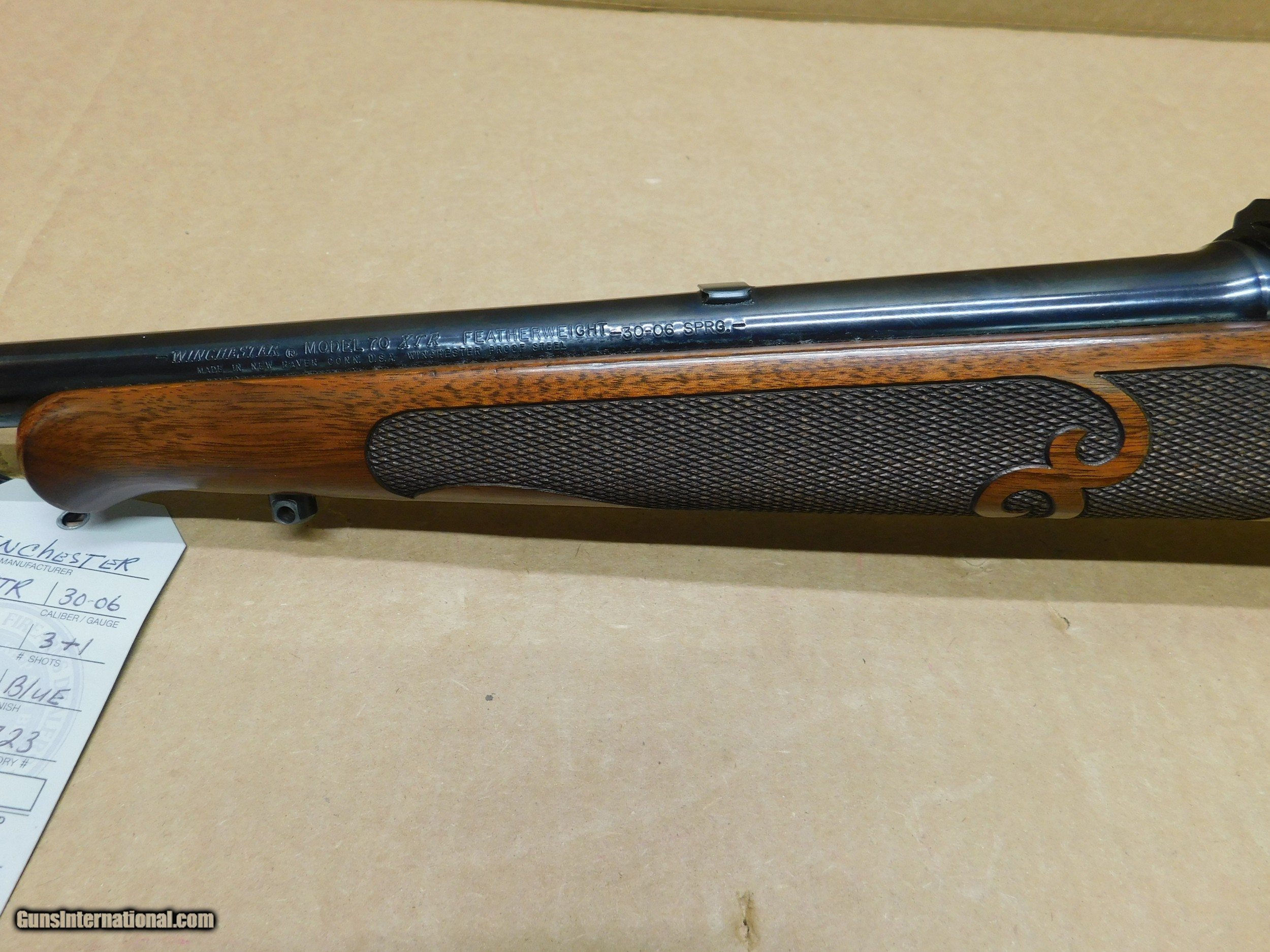 Description: This is a very clean Winchester 70 XTR Featherweight It is a 30-06 bolt action rifle it is a 3+1 shot with a 22" blued barrel SN-G1552215 $725.00 SOLD Manufacturer: Winchester Model: 70 XTR Featherweight Serial Number: G1552215 Caliber Info: 30-06 Bore: very good Condition: Used Metal Condition: very good Wood Condition: Very good Bore Condition: Very good Barrels: 22 Barrel Type: round Action: Bolt Triggers: Standard Stock: Checkered walnut with cheek rest and sling studs Butt Pad: Winchester rubber Finish: Blue Sights: None Extras: Rings and Bases |