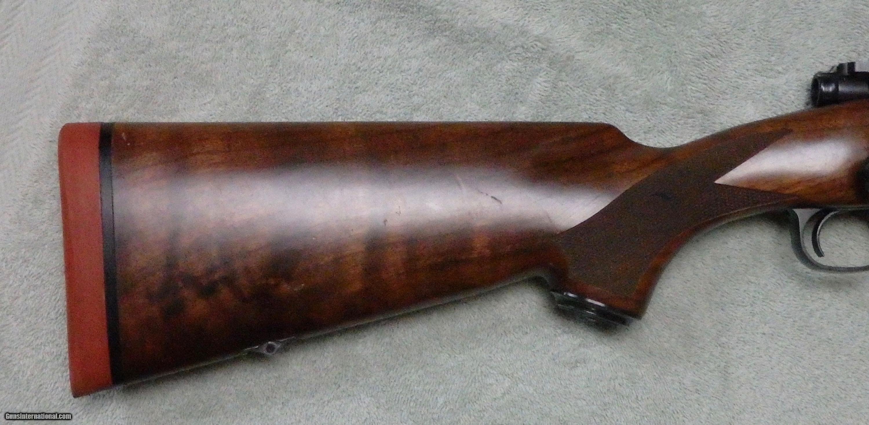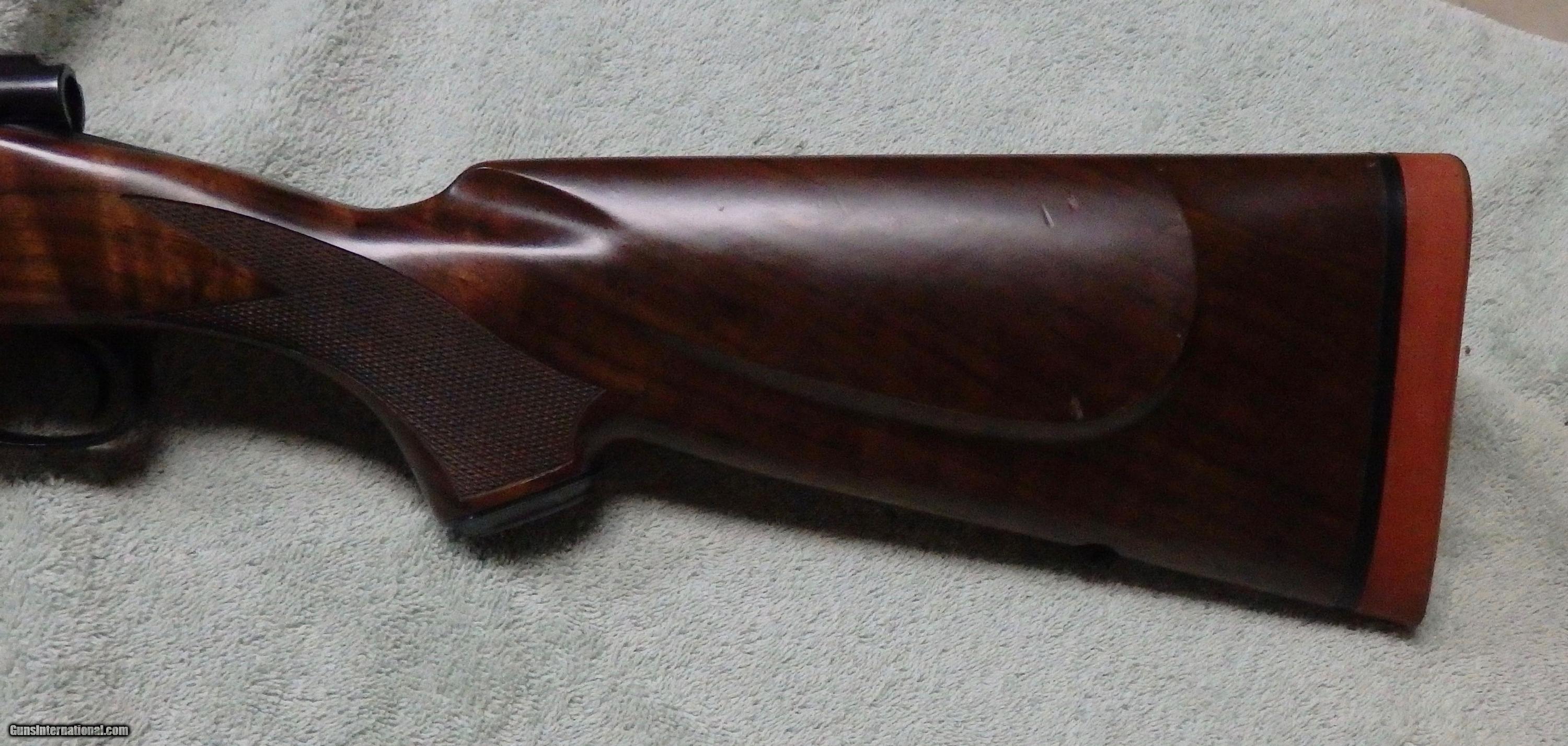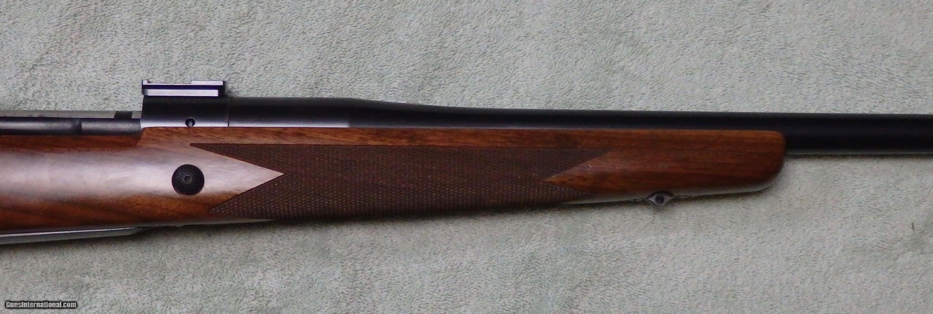 Description: M70 Classic controlled round feed action chambered for .338 RUM. 26" Kreiger barrel with VG bore. 1-piece bottom metal. Excellent bluing with wear on bolt knob and muzzle. Comes with 2 stocks, a walnut factory stock that has been pillar bedded and a H-S Precision synthetic stock that has its own bottom metal. Comes with dies and brass. UPS Ground delivery to your FFL is $35. SOLD |