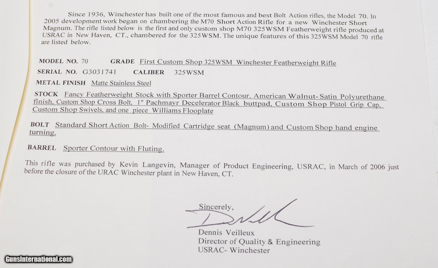 Description: Winchester Model 70 .325 WSM. First Custom Shop .325 WSM Featherweight Produced. Like New In Box Since 1936, Winchester has built one of the most famous and best Bolt Action rifles in the world, the Model 70. In 2005 development work began on chambering the M70 Short Action Rifle for a new Winchester Short Magnum. The rifle listed below is the first and only custom shop M70 325 WSM Featherweight rifle produced at USRAC in New Haven, CT., chambered for the 325 WSM. The unique features of this 325 WSM Model 70 rifle are listed below. The rifle was purchased by Kevin Langevin, Manager of Product Engineering, USRAC, in March of 2006 just before the closure of the URAC Winchester plant in New Haven, CT. SPECIFICATIONS PLEASE INSPECT YOUR NEW FIREARM FOLLOWING THESE CONDITIONS.