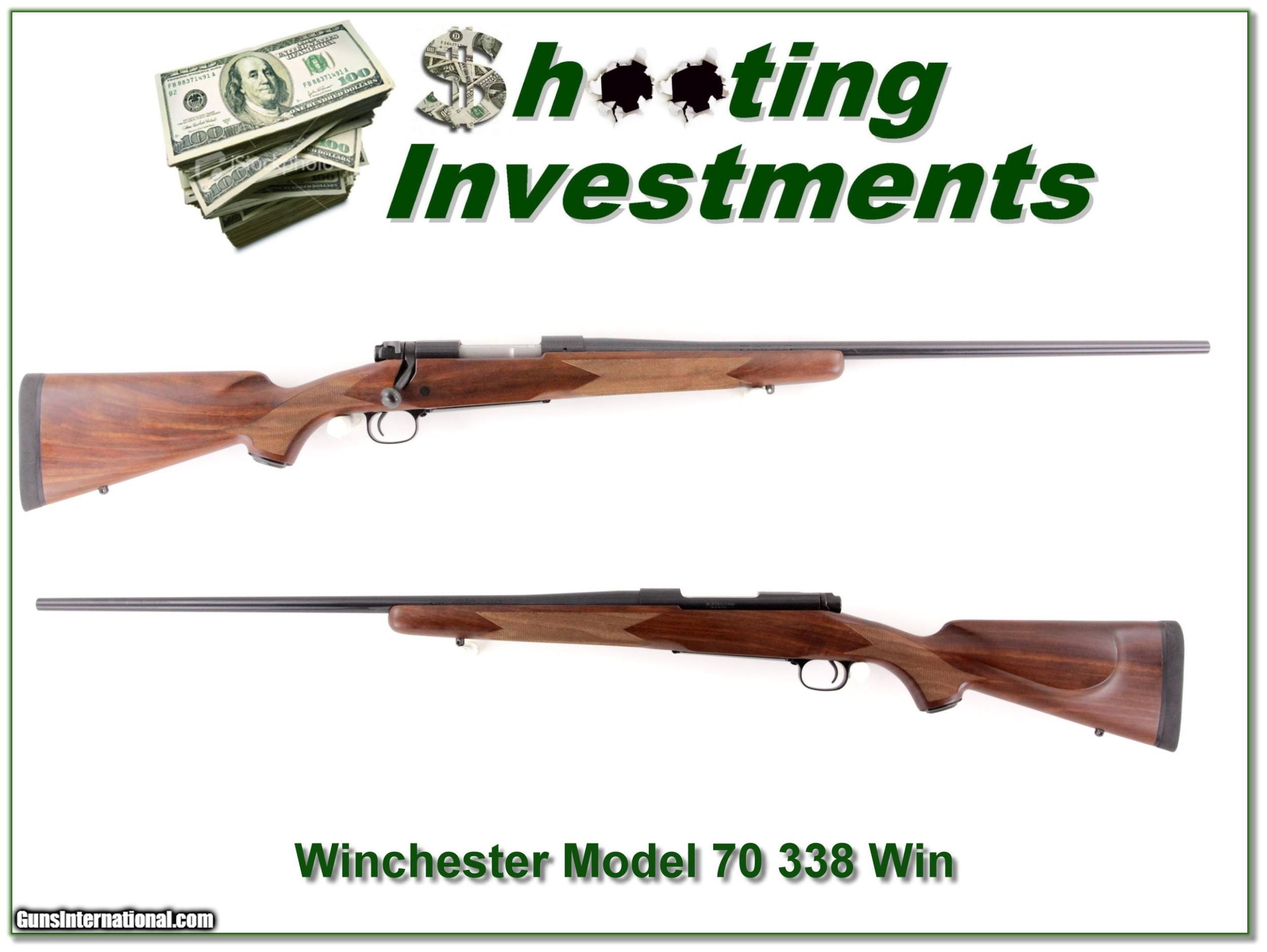 Description: This is a new condition Winchester Model 70 in the hard hitting 338 Winchester Magnum. I see no marks or wear on blue or wood and the wood has outstanding colors and figure! It has a 26in barrel and control feed action. It will make an excellent big game gun! Shipping with insurance is $39. Please email me with any questions or larger pictures. (Consign your quality firearms with Shooting Investments for only 12%! Let me know if you have any you would like to sell!) 19-1351 Payment: Payment is by Money Order, Cashiers Check or Personal Check. I can now also accept Credit Cards (MasterCard, Visa, Discover & American Express) with a 3% convenience fee. PayPal can be used for some items but never for firearms. Shipping: The shipping charge will be listed in each description. It is $39 for most firearms. Some heavy guns or those insured for over $2000 will be higher. Shipments to Alaska and Hawaii are higher because air shipment is required. Most firearms are shipped on Tuesday and Thursday and usually in 5 days of receipt of payment. We package all shipments carefully and insure them. Optics are shipped Priority Mail and most other non-firearm shipments are shipped First Class. Returns: Our return policy is simple. If for any reason you are not pleased with your purchase, you may return your item for a full refund of purchase price. Ammunition cannot be returned. It is important to us that you are happy. Guns cannot be fired or dissembled before returning them and they must be returned in the same condition as received. Notification of a return must occur with-in 3 days of receipt at your dealer. Shipping, convenience and dealer fees are not refundable and are the responsibility of the buyer. Lay-a-way: If needed, we offer a 60 day lay-a-way option on most firearms. It is 1/3 now, 1/3 in 30 days and 1/3 in 60 days. Lay-a-way firearm sales are final and if not completed the first payment cannot be returned. Consigning your firearms with Shooting Investments: We will help you get top dollar for your firearms. While most local guns shops charge 20% or more, our fee is only 12% with a minimum of $75. At your local gun shop it might take months to sell. Selling on-line provides instant access to thousands of interested buyers. You won’t find any other on-line dealer willing to sell your firearms for only 12% or listing every gun on 3 separate s. Selling through an House typically costs the seller 15% and the buyer an addition 15% (so 30%) and you have to wait several months to sell and longer to receive funds. If properly priced, we will sell your firearms in a few weeks. Send us an email or give us a call and we’ll explain how easy it is for you to get top dollar. Trading: Trading for use is really just buying your gun to re-sell. If you have a gun you want to trade, please email a picture and we will let you know what we can give or it. You will always get more if we sell it for you on consignment. Help for California Buyers: We are happy to ship to California. It is the buyer’s responsibility to make sure any item you buy is legal in your state. We are also happy to help with your purchase of a firearm from someone other than us. If you see a gun you would like to buy but the seller can’t or won’t ship to California they can ship to use and we’ll then ship it to your California dealer. The cost for this service is only $30 + shipping. Let us know if we can help! SOLD |