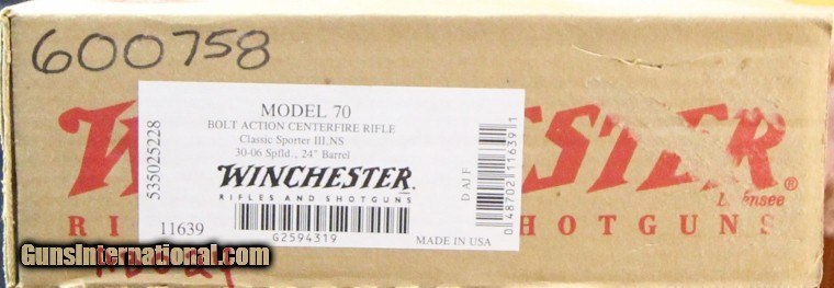 Description: .30-06, #G2594319, 24 inch barrel, blued finish, pistol grip/checkered/walnut stock, no barrel sights, all original. Condition: NIB, manufactured in New Haven before 1996 shut down. SOLD |