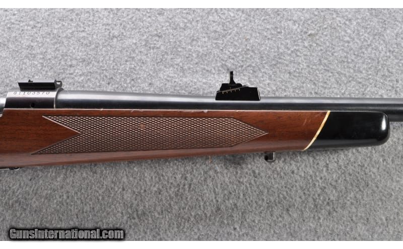 Description: This Winchester Model 70 Deluxe was manufactured in 1973. Missing the front sight hood. .30-06 Springfield SOLD Chambers: .30-06 Springfield in a five round box magazine bolt action rifle Metal Condition: "Good condition, shows finish wear at the trigger guard, floor plate and at the muzzle Wood Condition: "Good, with scattered light scratches and field marks Bore Condition: "Good, sharp and bright Barrels: 22 Triggers: Single Stock Dimensions: 13 1/2" LOP Fore End: Checkered walnut with ebony tip and sling stud Butt Pad: Winchester composite with logo Weight: 7 Lbs. 10 Oz. Sights: "Brass beaded blade front, ramped adjustable leaf rear, fitted with Weaver style scope bases Item Location: Grand Junction, CO |