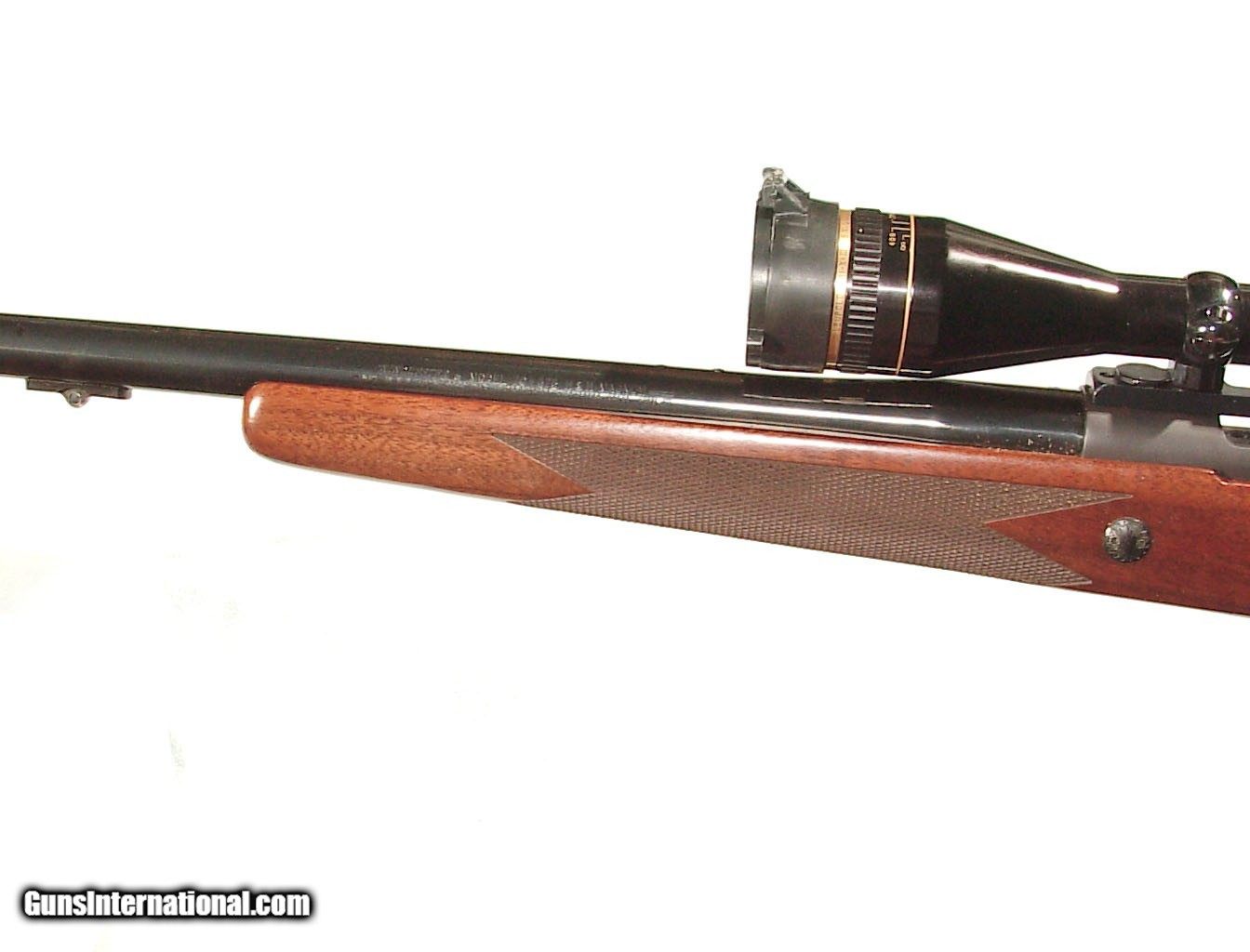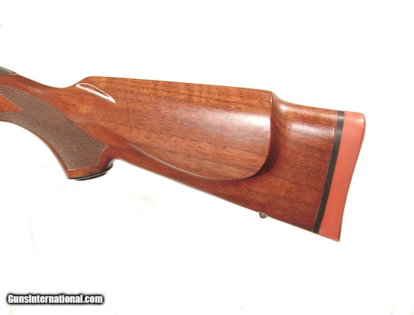 Description: .375 H&H magnum caliber, 24" heavy barrel marked "SUPER EXPRESS". Checkered walnut stock with cheekpiece and ending with a factory hard rubber pad LOP: 13 1/2". In near new, unused original condition retaining nearly all of the blue and minty wood. Topped by a Leopold Vari-x-III 3 1/2 x 10 scope. SOLD |