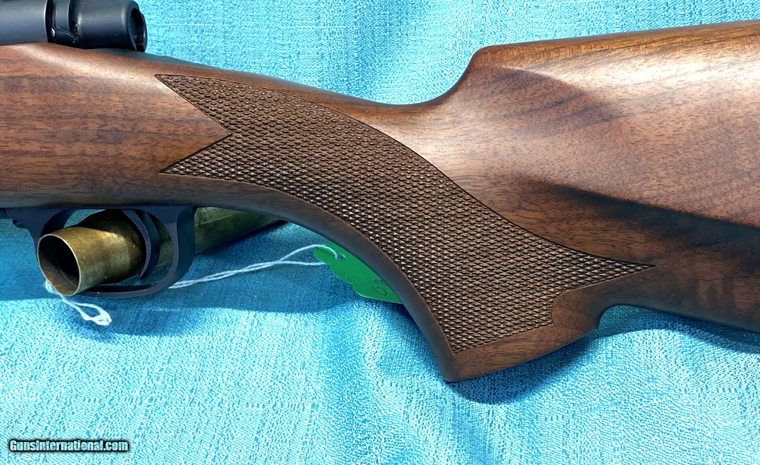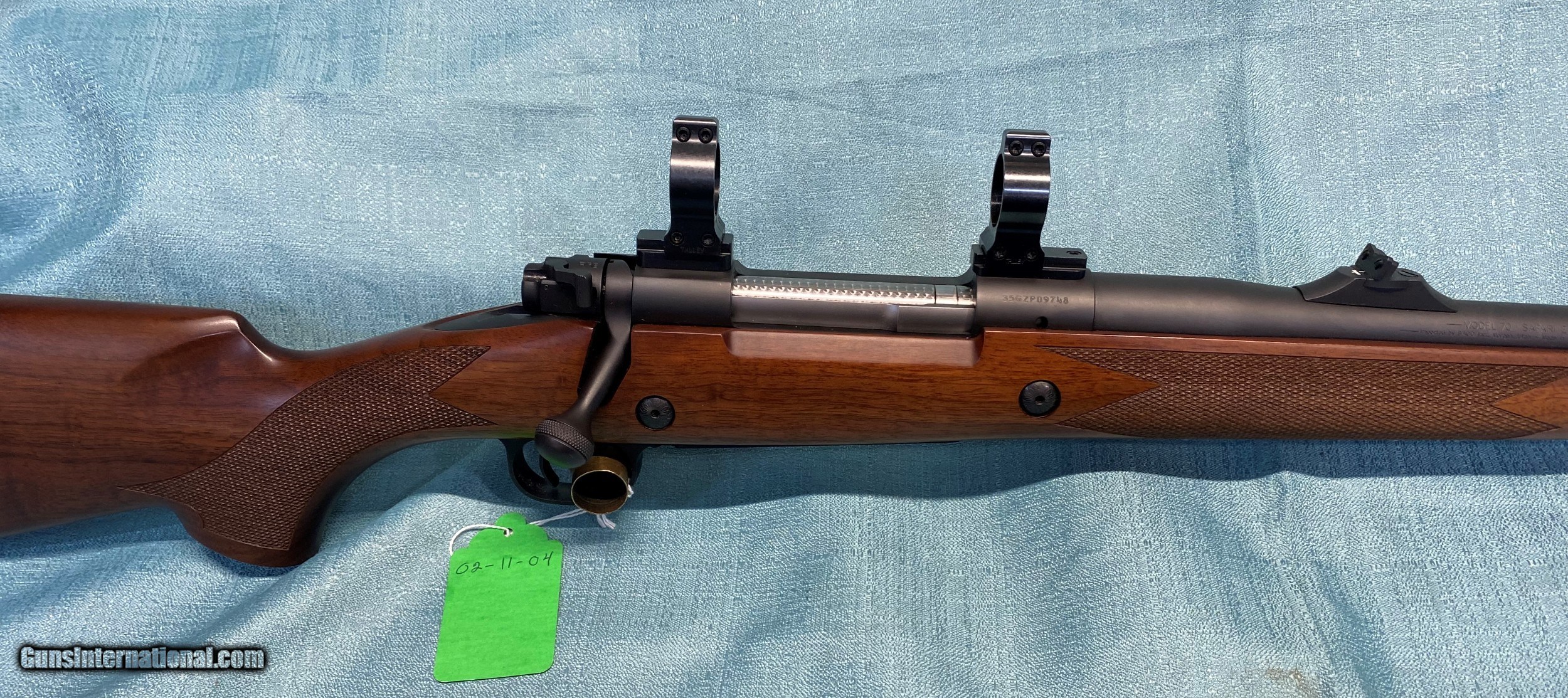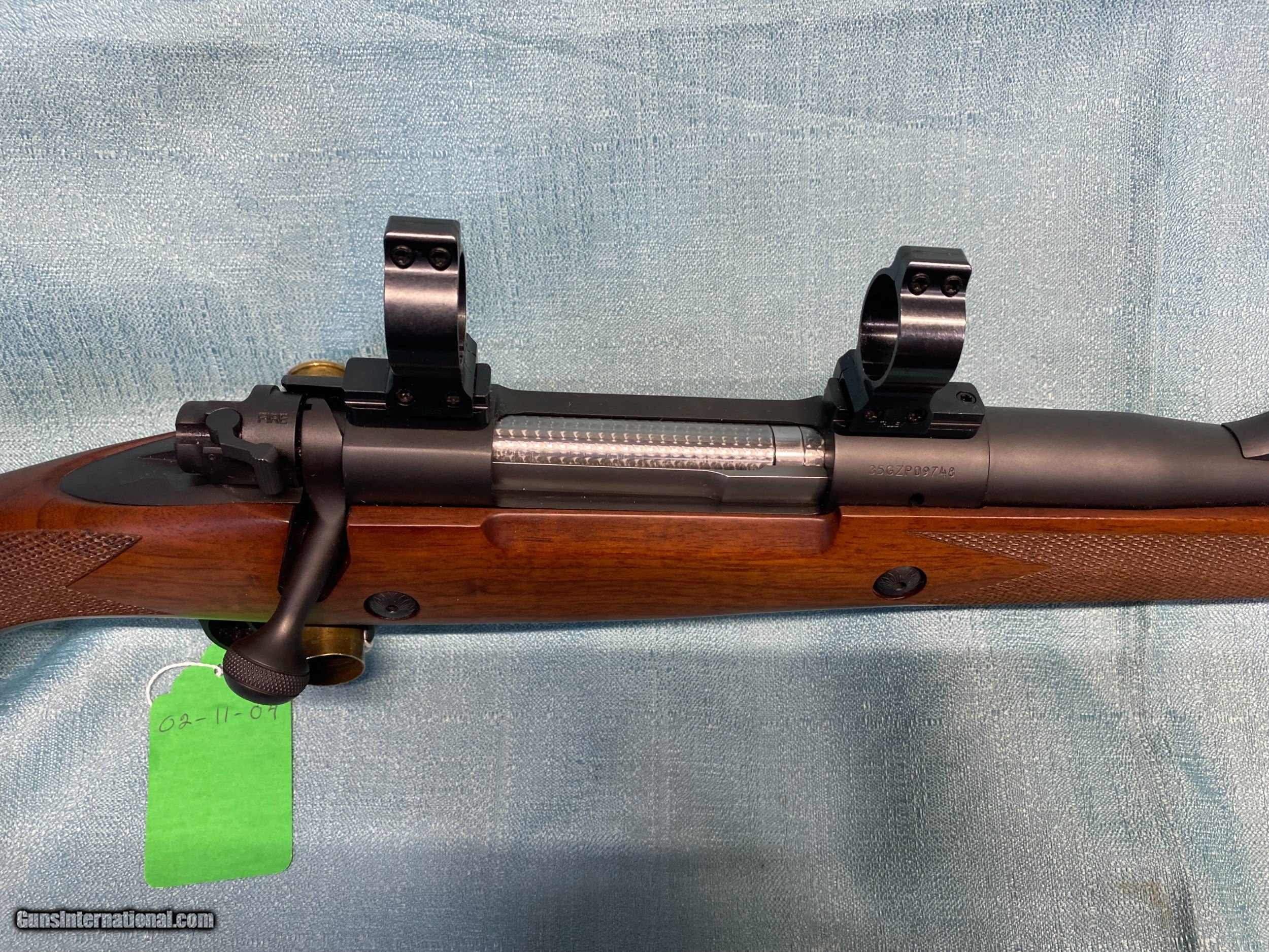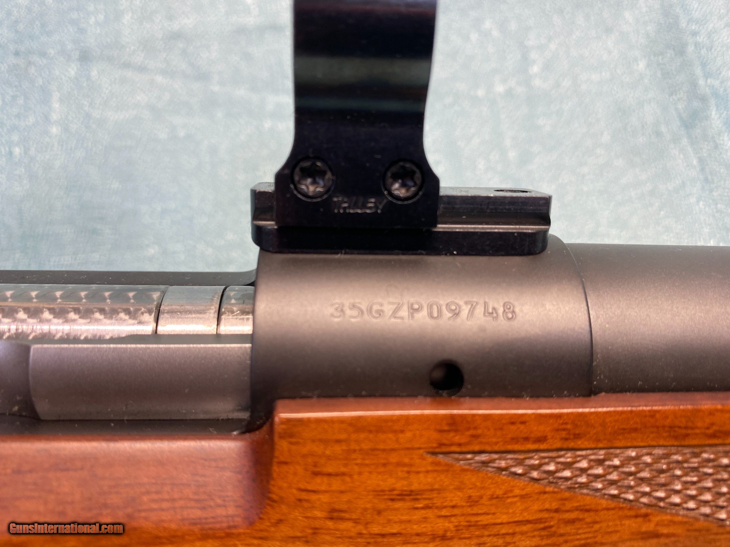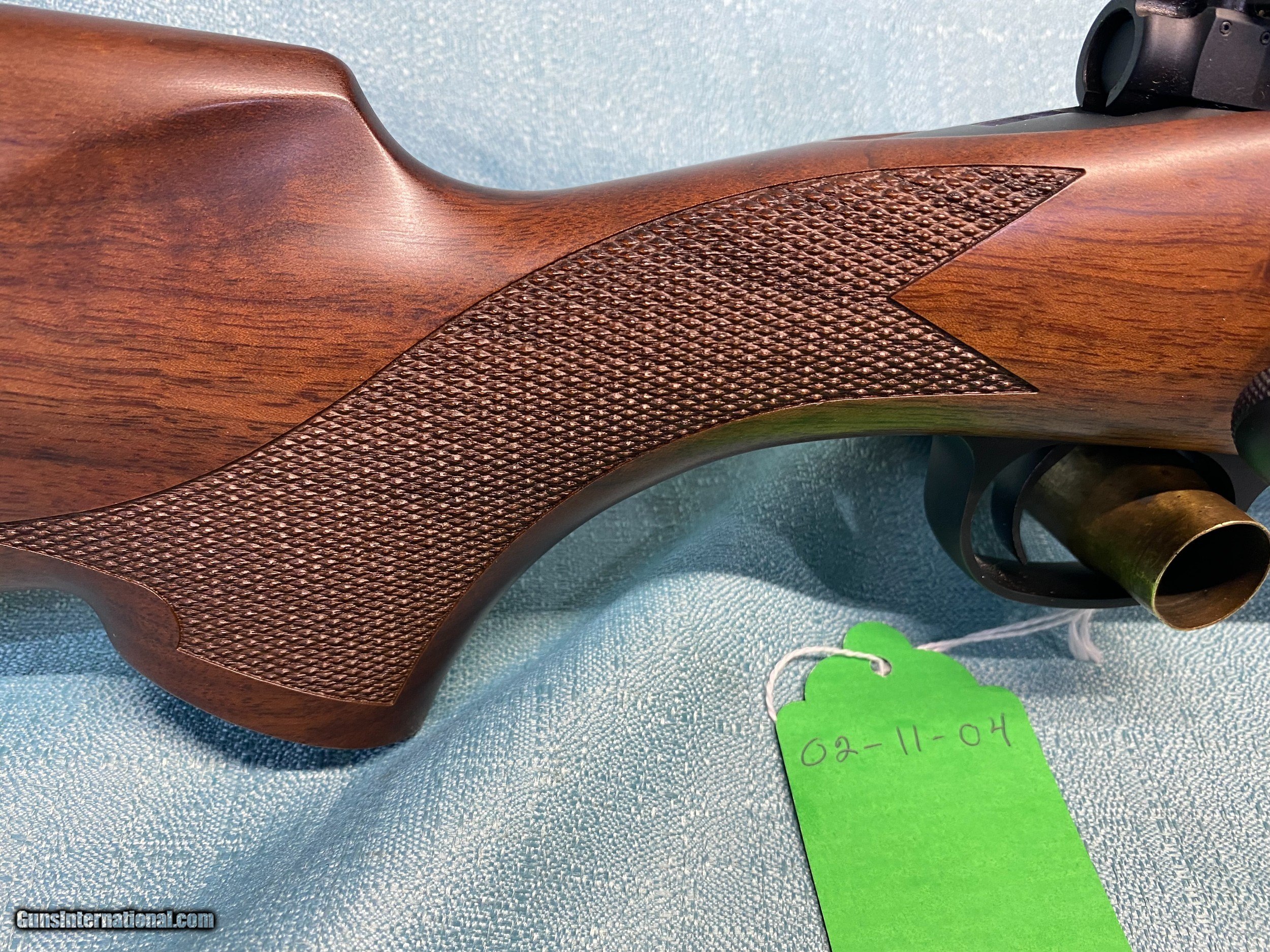 Description: This Winchester model 70 with control round feeding is in excellent condition. It is chambered in the Classic Game stopping 375 H&H Magnum cartridge. This rifle is the Safari Express version and has Tally scope mounts and rings already installed. Very nice smooth bolt with the classic three position safety. It is also fitted with a very nice and crisp trigger and sling mounts professionally installed at the factory. Maine Residents add 5.5% Sales Tax Price reflects a cash discount of 3.5% SOLD Rifle Caliber: .375 H&H Magnum Manufacturer: Winchester Model: 70 Safari Express Serial Number: 35GZP09748 Barrel Length: 24 Condition: Excellent Metal Condition: Excellent Wood Condition: Ezcellent Bore Condition: Excellent Finish: Matte Blued Item Location: Buxton Maine |