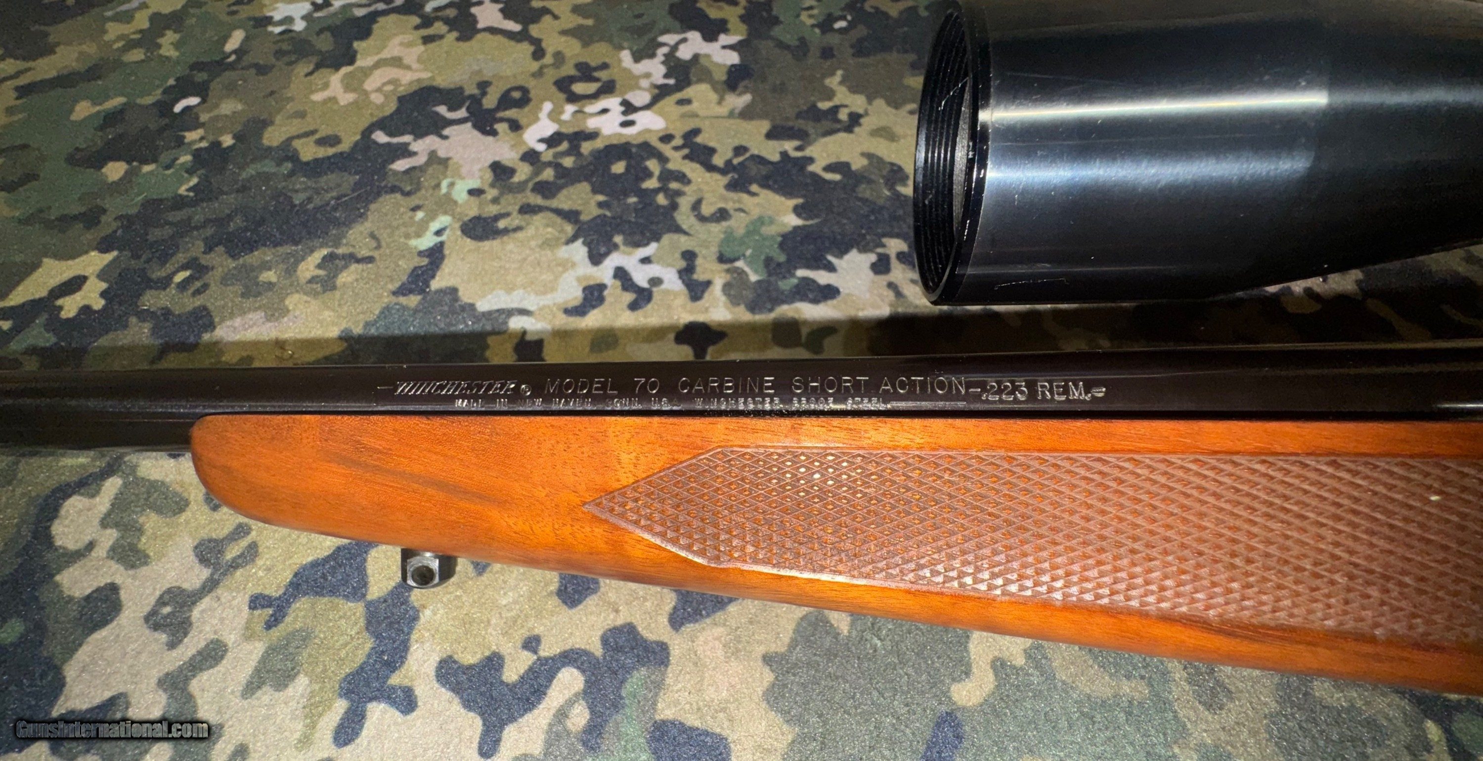 Description: Winchester model 70 short action carbine in .223 Remington with 20" barrel and 3x9 Weaver Micro-trac. These rifles were made in New Haven in the mid 80's. This rifle remains in excellent condition bluing is near perfect with only very minor handling marks to the wood. Very lightweight and fantastic looking rifle. Feel free to ask any questions. SOLD Rifle Caliber: .223 Remington Manufacturer: Winchester Model: 70 Barrel Length: 20 Condition: Excellent Metal Condition: Excellent Wood Condition: Very good Bore Condition: Excellent |