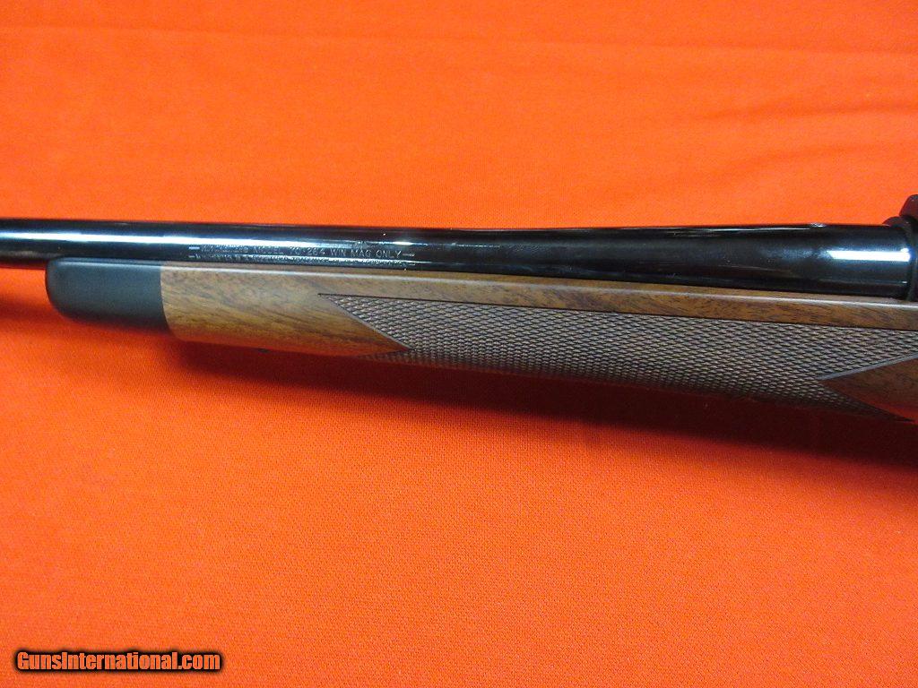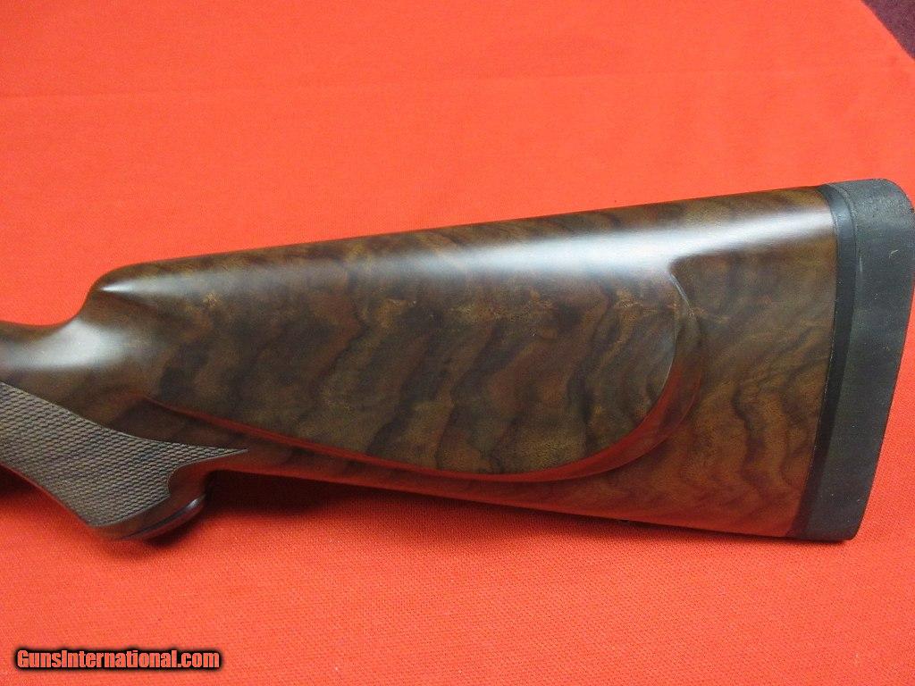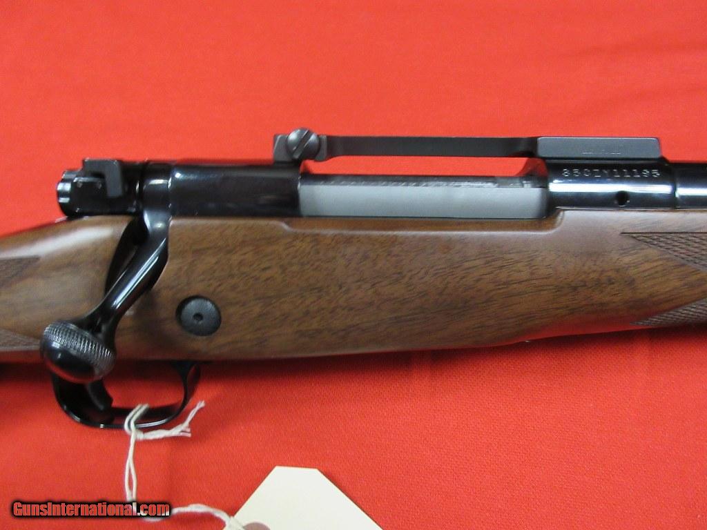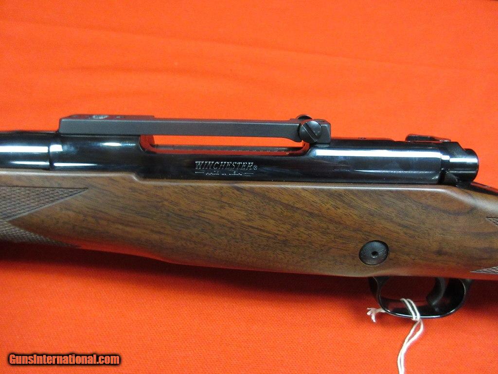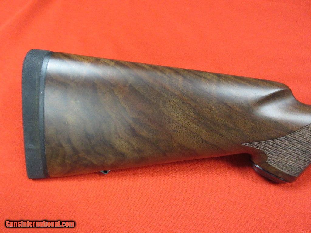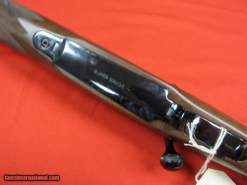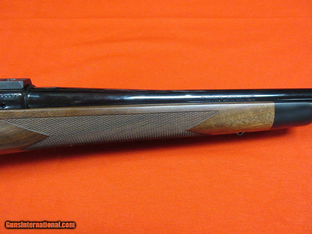 Description: Winchester Model 70 Super Grade 264 Win 26" (LNIB)-- This Model 70 Super Grade in 264 Win. is a limited production Shot Show Special. It sports a tastefuly checkered, nicely figured, fancy grade stock with a right handed shadowline cheekpiece and contrasting black forend tip, knurled bolt handle, free floated hammer forged barrel, full length claw extractor, engraved stock crossbolt, inletted swivel studs, jeweled bolt, high gloss blue on the receiver and barrel, and a Pachmayr Decelerator recoil pad. This is a sharp looking gun that would be a fantastic addition to any collection. LIKE NEW UNFIRED CONDITION WITH A LEUPOLD ONE PIECE BASE INSTALLED. SOLD |