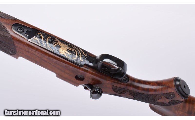 Description: Winchester Model 70 Western Big Game Series. Limited to only 129 rifles, the Whitetail Deer edition is chambered in 308 Winchester and features high polished blue finish, Specially scroll engraved floor plate with gold enhanced game scene. Highly figured AAA Claro walnut stock with shadowline cheekpiece and fleur-de-lis checkering. Very limited supply production, New in factory box. .308 Winchester SOLD Metal Condition: "High Polished Blue, Engraved Floorplate Wood Condition: AAA Walnut Bore Condition: NEW Barrels: 22 Inch Stock Dimensions: 13 3/4" LOP Fore End: Ebony Tip Butt Pad: Decelerator Recoil Pad Weight: 7 Lbs 9 oz Sights: No sights. Tapped for mounts Item Location: Buda, TX |