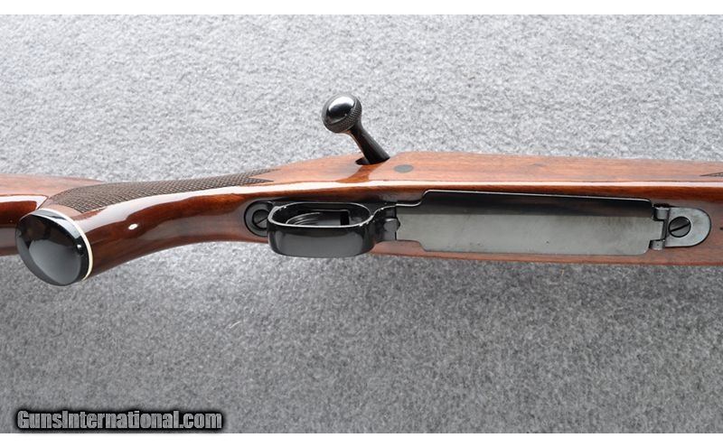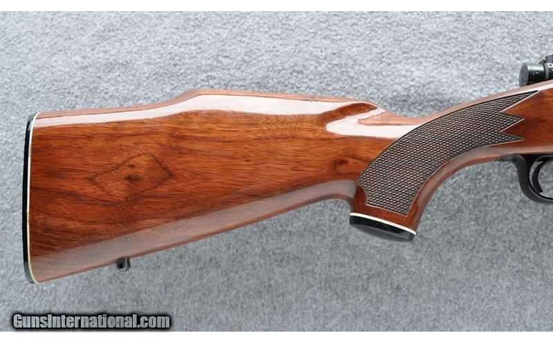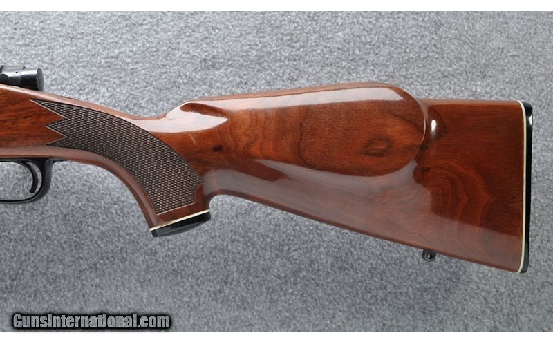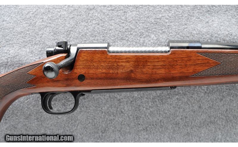 Description: This Model 70 dates to 1979 - 1980 New Haven, Conn. manufacture and is a push-feed bolt action XTR. Appears to have been exposed to moisture and not treated properly as there are spots along the barrel and other metal parts where rust accumulated and was subsequently buffed out, leaving fine scratches and blue loss. The wood is of select walnut and exhibits nice grain and color. .30-06 Springfield SOLD Chambers: .30-06 Springfield in a 5 round fixed magazine Metal Condition: "Good with the exception of scattered blue loss on the barrel which appears to have buffed, leaving scratch marks. The magazine floor plate shows pitting on the left edge and the trigger guard has a few small nicks. The bolt handle also shows corrosi Wood Condition: A couple of marks on the left side of the fore-end and butt-stock Bore Condition: Good bright & sharp rifling Barrels: 22 Triggers: Grooved face Stock Dimensions: 13 1/2" LOP Fore End: Checkered walnut with ebony fore-end tip and sling stud Butt Pad: Winchester checkered composite with logo Weight: 7 Lbs. 10 Oz. Sights: "Hooded blade front, Flip-up adjustable leaf rear Item Location: Grand Junction, CO |