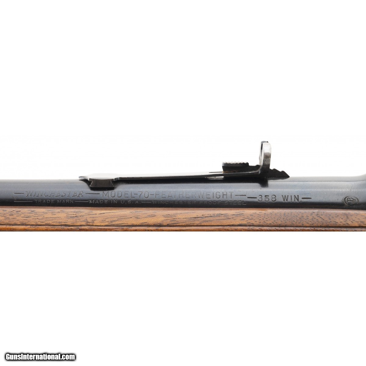 This rare Winchester Model 70 Featherweight rifle in .358 Winchester caliber is circa 1955. The 22"" barrel has an excellent bore with bright, strong rifling. The metal retains approx. 98% of its original finish. The stock is very fine with sharp checkering, some use wear, and a very good aluminum buttplate with approx. 70% finish. The front sight cover and two sling swivels are present. The action functions correctly. It has never had a scope mounted on it. This rare Model 70 358 Winchester Featherweight rifle is ready for the finest collection!