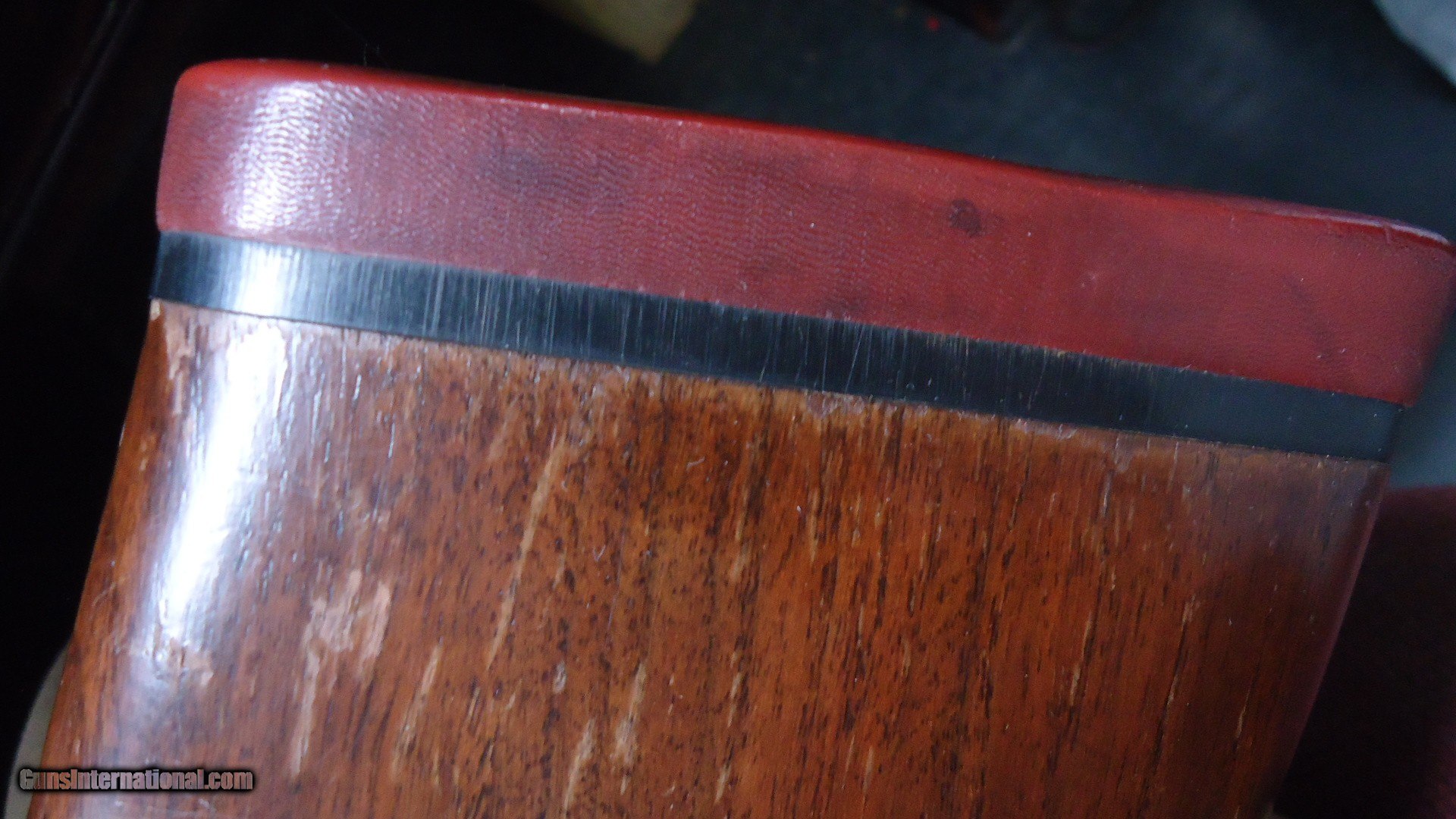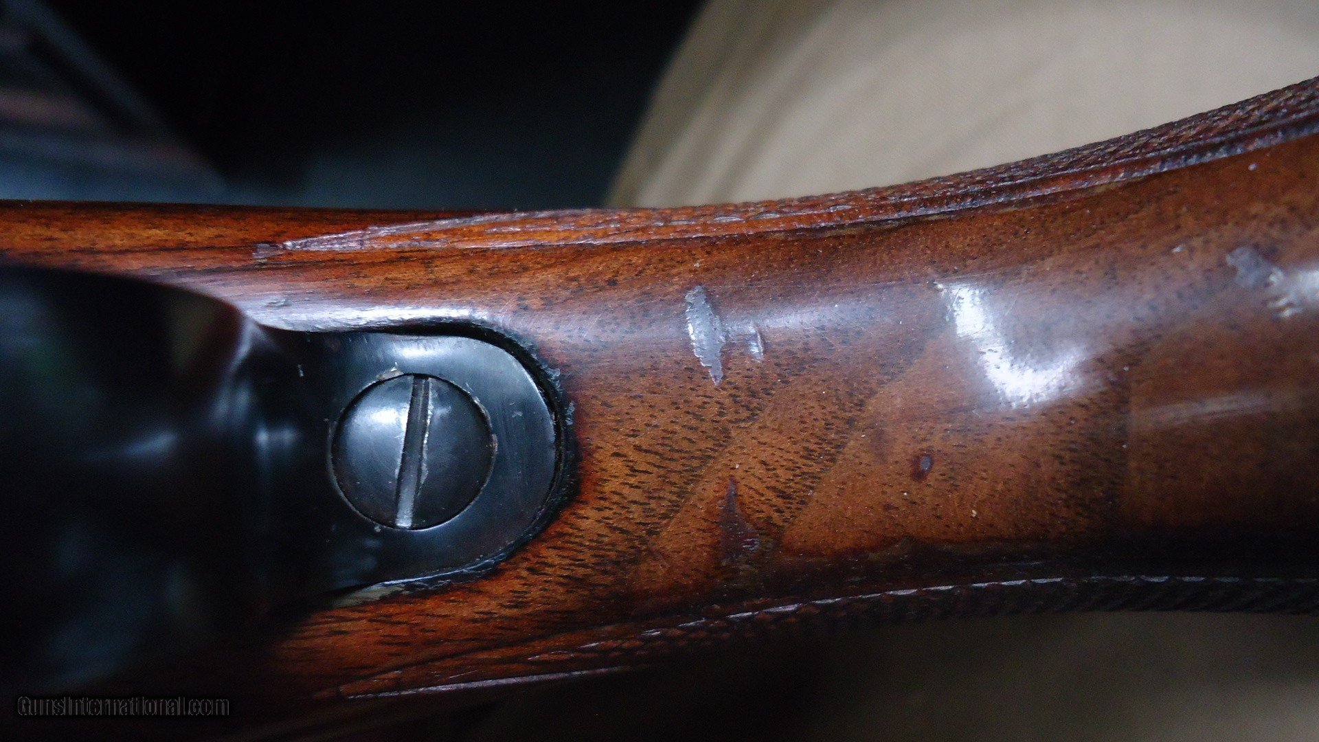 Description: 26 inch round barrel chambered in the desirable 300 H&H Magnum caliber with a bright shiny excellent bore. Barrel retains most all of the original blue. Sights include a ramped beaded front and a folding leaf rear. Also has a Griffin & Howe quick -detach scope mount with a Lyman 2-1/2 x Perma-Center scope with a post and crosshair reticle with clear optics. Checkered walnut pistolgrip Monte Carlo stock is in good condition with some light wear and handling mars. Red Winchester buttpad. Includes sling mounts as well. A good usable investment grade Winchester Model 70 made in 1958. Leroy Merz Antique Firearms specializes in antique and vintage Winchesters and other fine American firearms. Since 1965 Mr. Merz has taken part in the world of firearms and has been a contributor to many well known reference books. We have hundreds of additional guns in every price range at our home online. Search for Merz Antiques in google. SOLD Curio/Relic: Yes Rifle Caliber: .300 H&H Magnum |