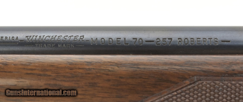 Winchester 70 .257 Roberts caliber rifle. Beautiful .257 Roberts model 70 manufactured in 1953. 99% original blue (tiny scratch on floor plate). Bore is perfect. Stock is excellent with some very minor handling marks on the underside near the rear sling swivel. Buttplate is perfect. Excellent plus condition and in .257 Roberts!