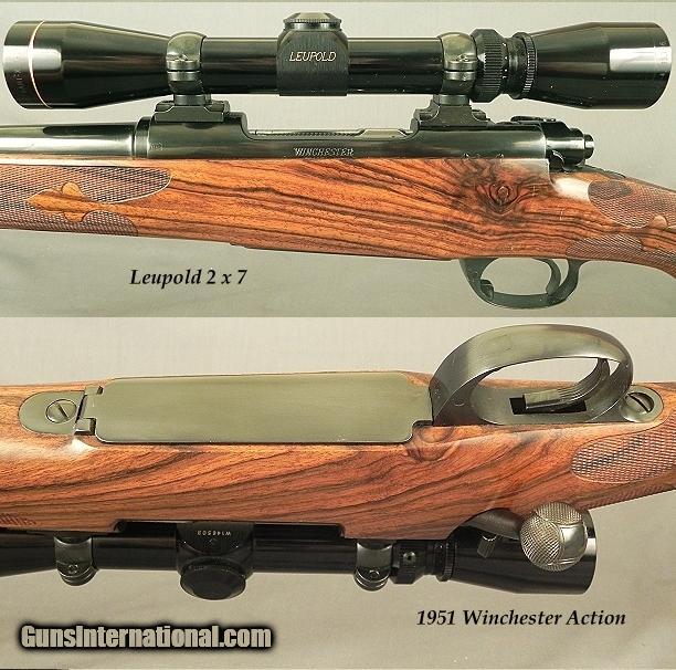 Description: #177471, Dale W. Goens #983 - 270 Winchester Classic Custom Stocked Pre-64 Winchester Model 70, The action was made in 1951, 22 3/4" barrel without any open sights, Profiled barrel like a Model 70 Featherweight, 2 piece Redfield/Leupold profiled scope bases, Leupold 2 x 7, Original Model 70 floorplate with a custom profiled trigger guard bow with a center bow release, A 3-position Model 70 wing safety, Four panel teardrop bolt knob checkering, Model 70 trigger, Jeweled bolt and follower, Goens classic stock on an Excellent piece of English Walnut, Classic Goens wrap around Fleur-de-lis checkering pattern with ribbons thru the panel, Shadowline cheekpiece, Ebony forend tip, Sling eyes, Steel grip cap, 13 3/4" LOP over a Biesen checkered steel buttplate, 7 lbs. 14 oz., Doggone nice color and contrast in this piece of wood, The original Goens blue remains at 98%, The original stock finish at 95% with light handling marks, The checkering is at 99%, The bore looks brand new. SOLD |