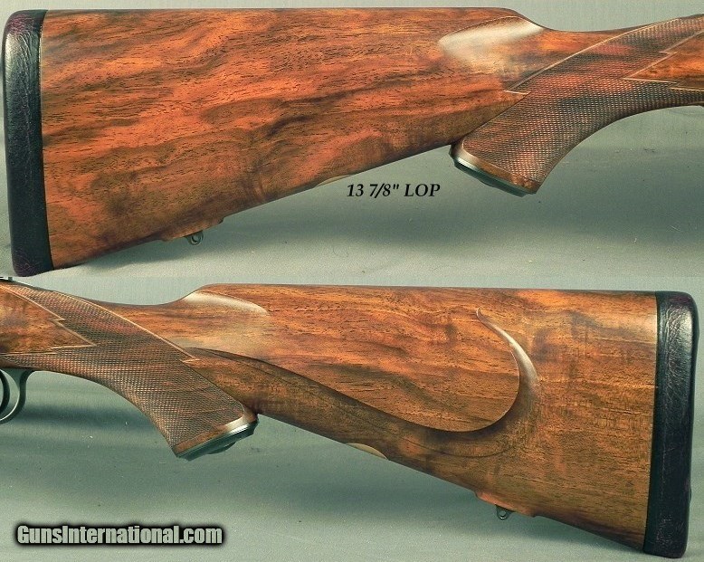 Description: #101172, Gene Simillion - A 416 Taylor Classic Custom Pre-64 Model 70 Made by Simillion in 1992, The M-70 action was made in 1948, Superb Simillion metal & wood work, 23 3/4" barrel, Neat 1/4 rib with 1 standing rear sight sighted at 50 yards with a 400 grain bullet, The sight with a neat Ivory or Warthog Ivory sight line, Front ramp with a cover for 2 each front sights, The cover is removed with a small punch that is in the trapdoor grip cap with the 2 sights (Neat Stuff), Lever release Quick Release rings, Leupold 1.5 x 5, Straddle hinged floorplate with a custom trigger guard with a locking center bow release with a very small spring plunger that is depressed to move the release (Novel), Rolled trigger guard edge, A 3-position Model 70 wing safety, Five panel teardrop bolt knob checkering with engraving, Built up & checkered bolt stop release, Model 70 trigger, Jeweled bolt, The action rails inside are polished to a tee, A custom bolt handle, Gold bands at the breech and muzzle, Simillion classic stock on a nice piece of wood, Classic Simillion wrap around point pattern checkering pattern with a border, Dual crossbolts, Shadowline cheekpiece, Ebony forend tip, 2 screw sling eye on the stock, Engraved trapdoor grip cap with the spare front sights and the previously mentioned punch, 13 7/8" lop over a leather pad with plugs for easy removal, 8 lbs. 13 oz. as a serious open sighted dangerous game rifle, 9 lbs. 12 oz. with the scope mounted, The original and total Simillion satin blue at 99%, The original stock finish at 98-99%, The checkering at 100%, The bore remains as new. This piece comes with a set of RCBS reloading dies. The .416 Taylor was created by Robert Chatfield-Taylor in the early 1970s. The cartridge idea was to replace the magnum length .416 Rigby with a cartridge that would fit into a standard-length bolt-action rifle such as the Mauser 98 and Winchester Model 70. It produces nearly the same performance as the legendary .416 Rigby but does it in a bolt rifle built on a standard length action. Norma makes ammo for this cartridge. The case is based on the .458 Winchester Magnum necked down to accept .416 caliber bullets or the .338 Win. Mag. necked up. It will move a 400-grain bullet at about 2,300 fps in a 24" barrel with a muzzle energy of about 4,850 ft. lbs. The .416 Taylor can drive a 340-grain bullet at about 2,500 fps. Mr. Gene Simillion has it all together on both metal and wood. He is one of the best custom gun builders in all the U.S. and does not take a back seat to anyone. His style, workmanship, craftsmanship and full attention to detail is beyond reproach. The metal polishing outside and on the inside is done almost flawlessly and the stock inletting is as good as I have seen on 99% of all top-drawer custom rifles. Mr. Simillion practices his craft in Gunnison, Colorado. This is flat-out one nice rifle done by someone that knows everything about right from wrong. SOLD |