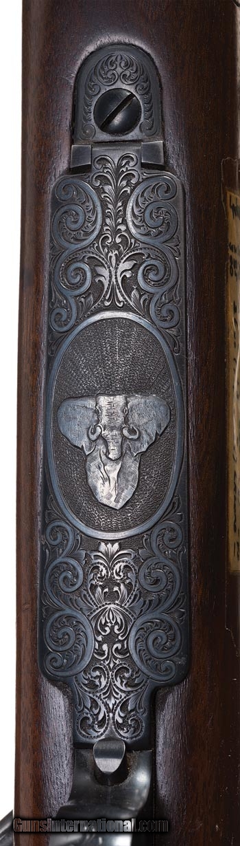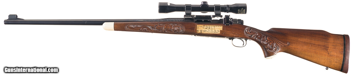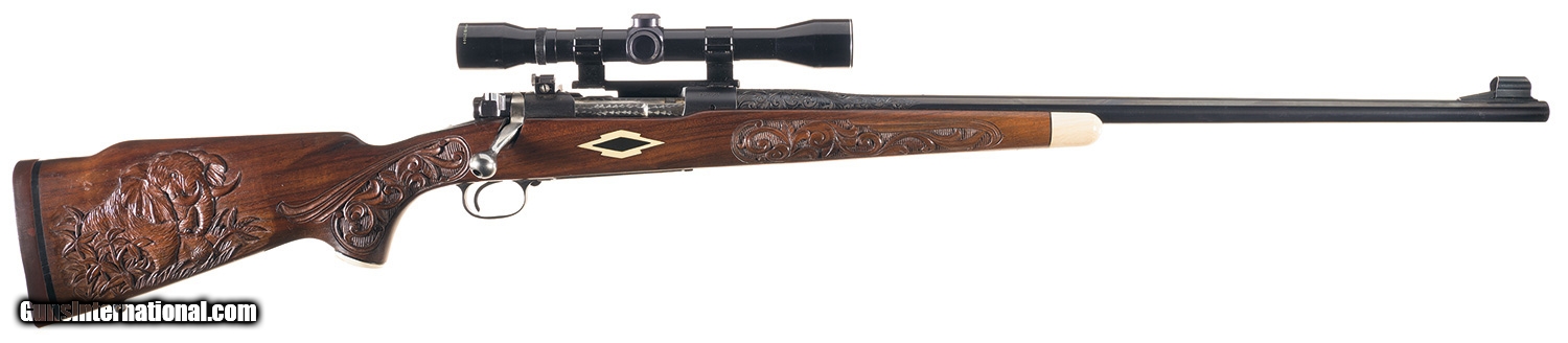 Description: Original pre-64 Win 70 in 375 H&H with rare 25" barrel, custom stocked and engraved by master craftsmen, scoped with a period Valor 4x32 tapered reticle scope in a side mount, the floorplate heavily engraved with a bull elephant in aggressive pose in a field of expertly cut scroll. The stock boasts an ivory forend tip and grip cap, together with ebony and ivory inlays on each side; extensively carved panels and a full body rendition of a rampant bull elephant on the offside of the butt. The sights comprise a receiver sight mounted so as to allow use with or without the scope in place, and the original hooded front. The customer for whom it was made was not only willing to pay for top notch work, but took his riflemanship seriously, evidenced by trajectory data taped to the stock. SOLD Curio/Relic: Yes |