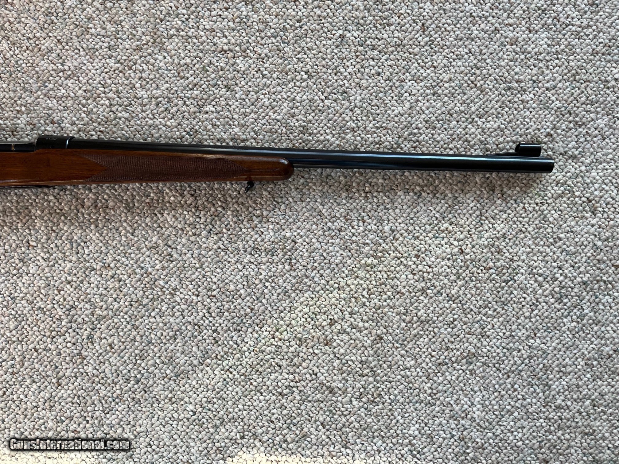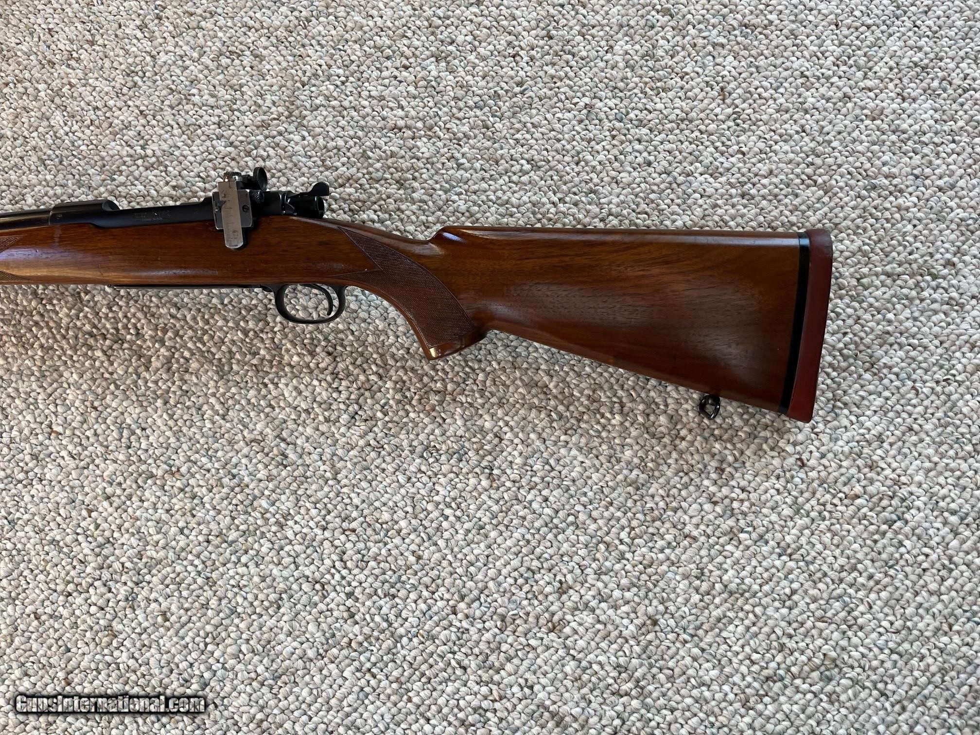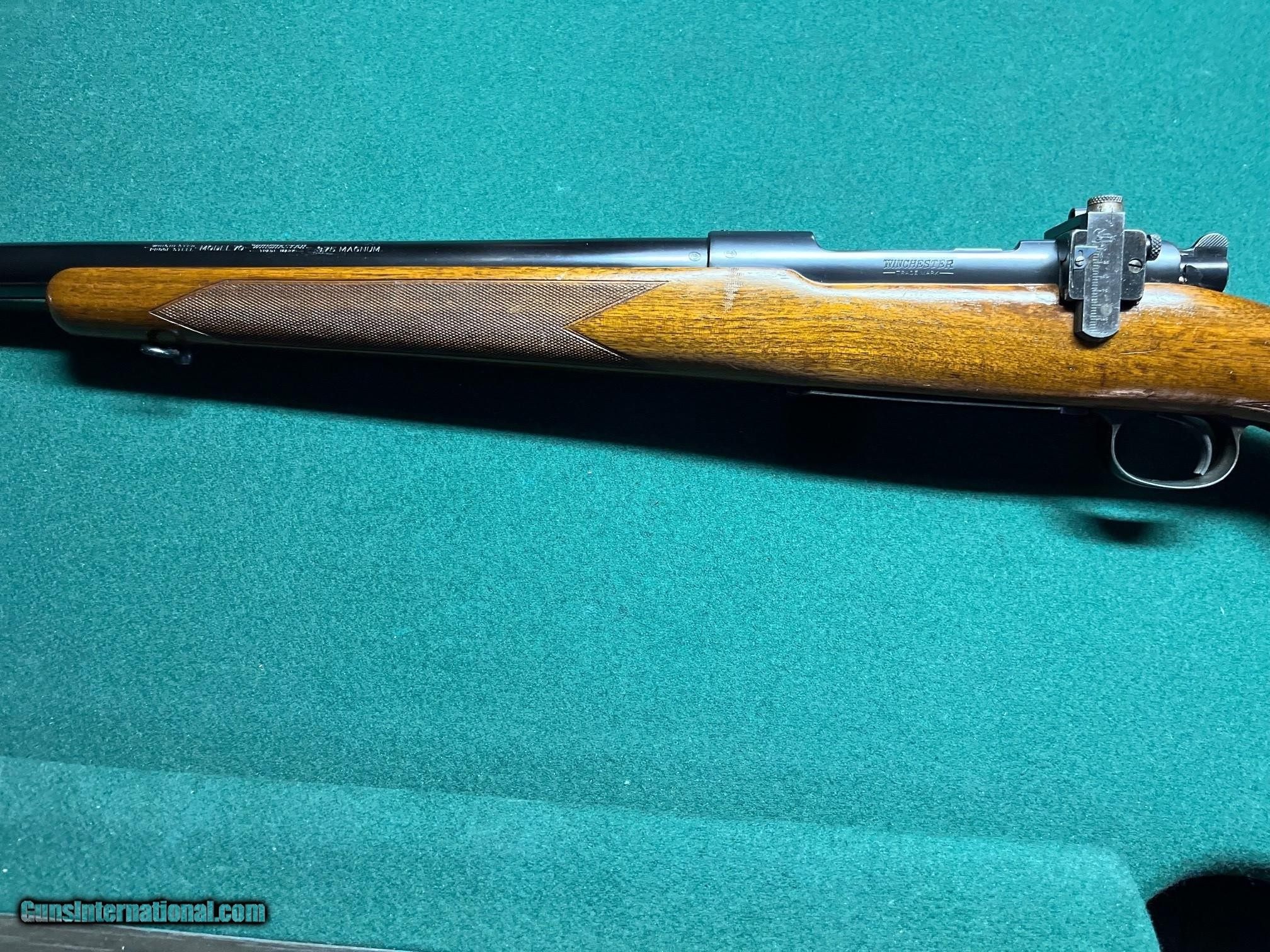 Description: For sale is a pre-64 Winchester Model 70 375 H&H. Rifle was manufactured in 1937 having serial number 4622. Bolt is correctly serial numbered to the gun. This rifle is configured with a straight taper barrel. Of the approximately 428 375 H&H rifles produced in 1937, roughly 100 have this straight taper barrel configuration. The bore is perfect having no signs of wear or pitting. The barrel and receiver show slight handling wear with a few minor scratches on the barrel. The floor plate has flaking typical to the period and a few light scratches. The original rubber recoil pad remains without deterioration showing some sign of standing in the gun safe. Wood finish has a few handling marks and one small chip that was repaired adjacent to the rear sight base. This rifle was delivered with an early Lyman long-slide receiver sight. The receiver has not been drilled. 100% original swivels remain on the rifle. All finishes on the rifle appear to be original. SOLD Rifle Caliber: .375 H&H Magnum Manufacturer: Winchester Serial Number: 4622 Condition: Very good, original condition Metal Condition: VG Wood Condition: VG Bore Condition: Perfect |