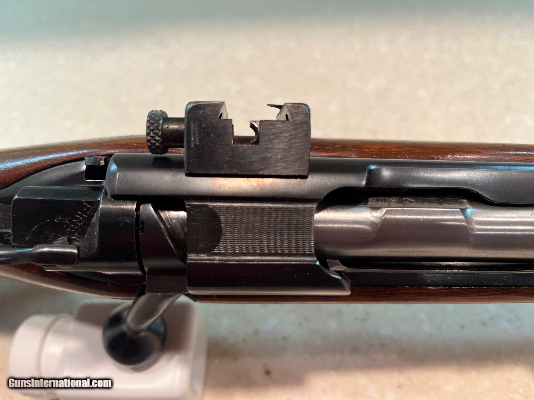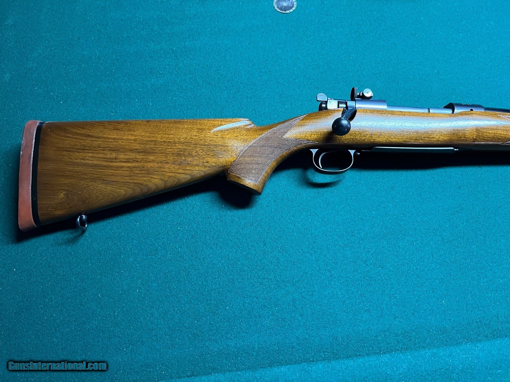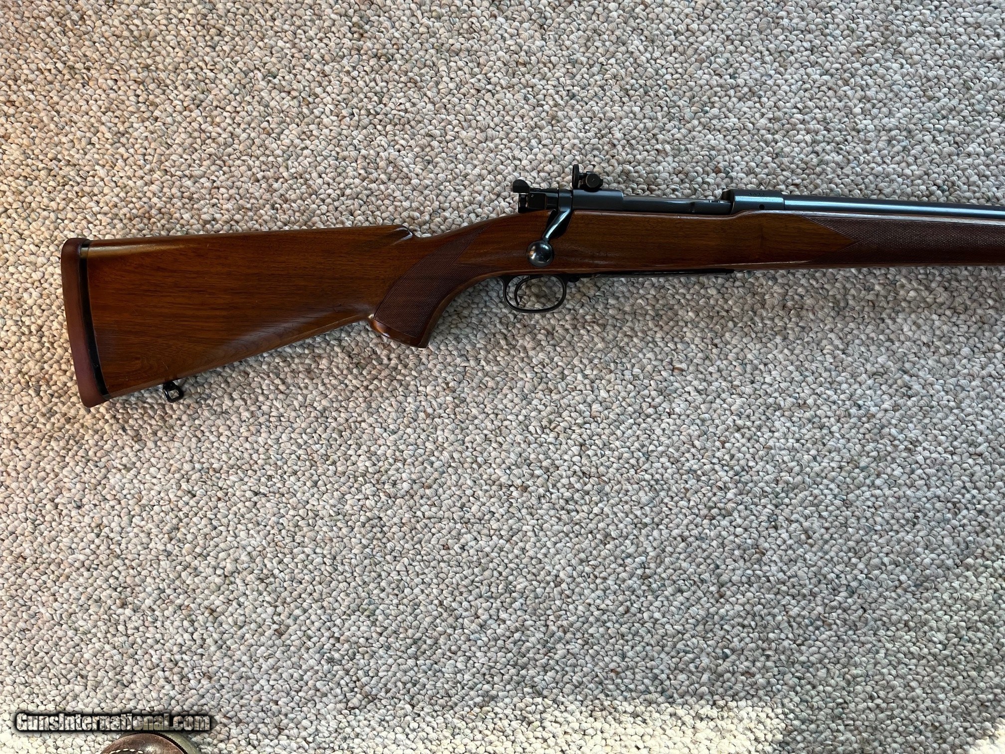 Description: For sale is a pre-64 Winchester Model 70 375 H&H. Rifle was manufactured in 1937 having serial number 4622. Bolt is correctly serial numbered to the gun. This rifle is configured with a straight taper barrel. Of the approximately 428 375 H&H rifles produced in 1937, roughly 100 have this straight taper barrel configuration. The bore is perfect having no signs of wear or pitting. The barrel and receiver show slight handling wear with a few minor scratches on the barrel. The floor plate has flaking typical to the period and a few light scratches. The original rubber recoil pad remains without deterioration showing some sign of standing in the gun safe. Wood finish has a few handling marks and one small chip that was repaired adjacent to the rear sight base. This rifle was delivered with an early Lyman long-slide receiver sight. The receiver has not been drilled. 100% original swivels remain on the rifle. All finishes on the rifle appear to be original. SOLD Rifle Caliber: .375 H&H Magnum Manufacturer: Winchester Serial Number: 4622 Condition: Very good, original condition Metal Condition: VG Wood Condition: VG Bore Condition: Perfect |