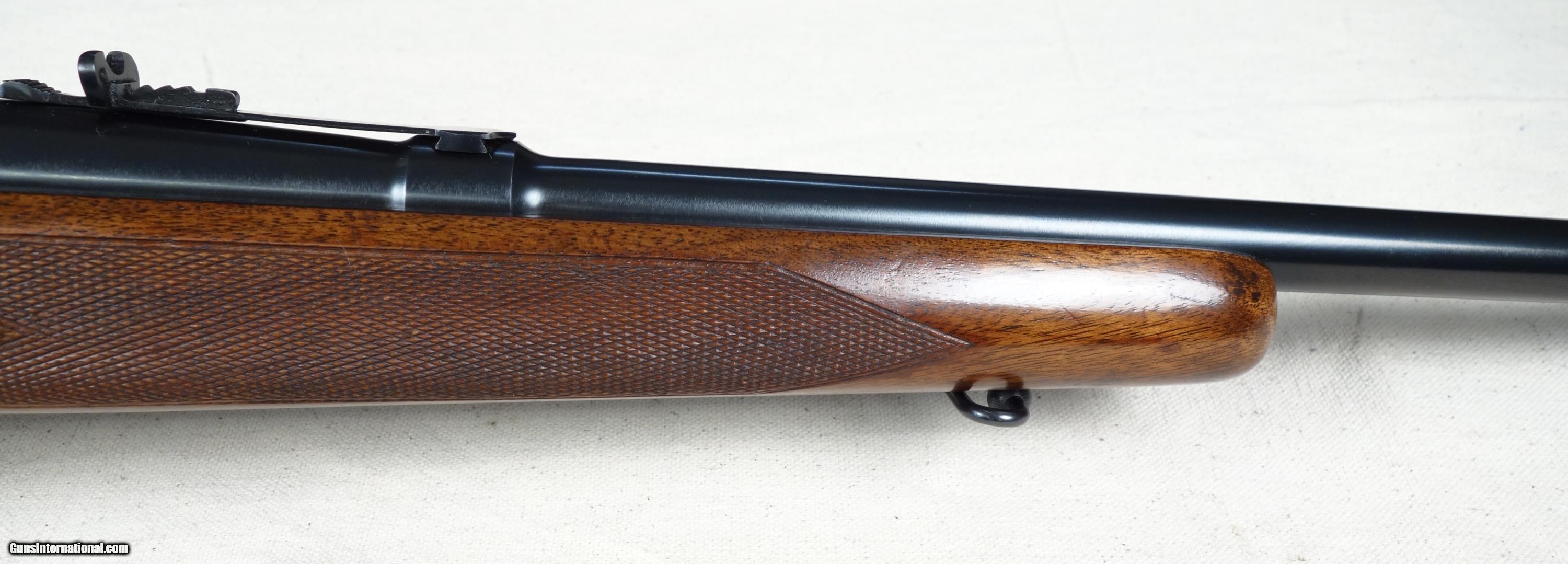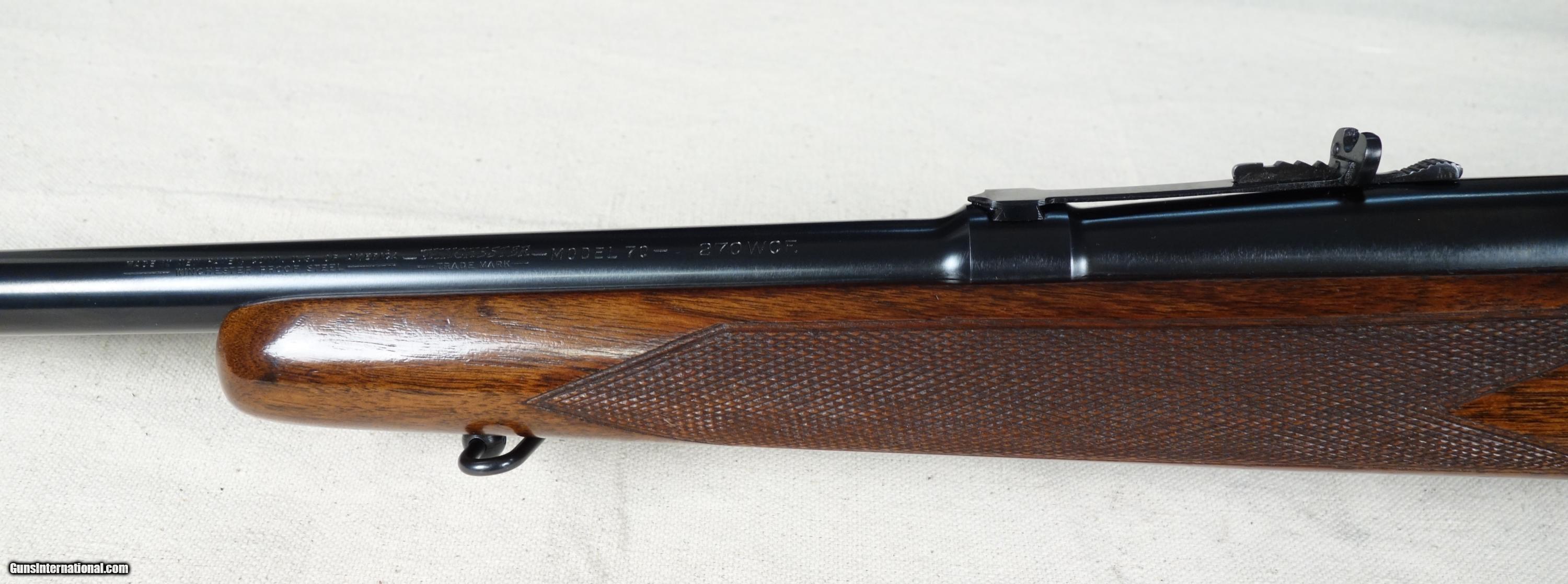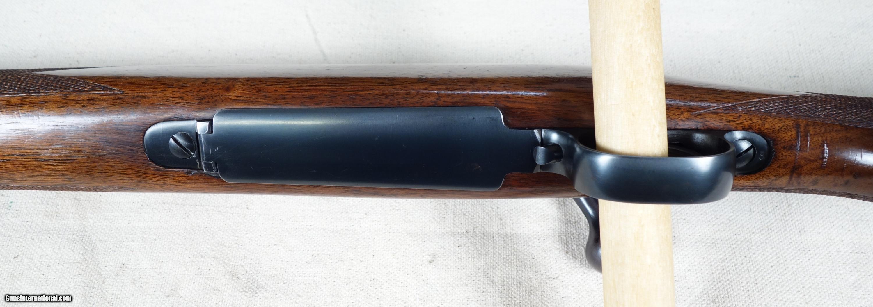 Description: Nice Winchester Model 70 standard rifle in .270 Caliber. This is a transition period rifle Mfg. in 1948, but is basically all post WWII with a straight taper tang and all other post war features, except for the clam shell safety generally found only on 1946-48 rifles. 24" Barrel. S/N 88xxx with matching bolt. Correct factory drill holes front and back for scope mounting if desired. Blue is about flawless at 99% with only slight wear showing where rifle rested on heel of butt plate. The wood is also very nice rated at about 96% due to some scattered and shallow, but noticable compression marks, the worst exaggerated by strong light on left butt stock, and a few under wrist/grip. Mechanics and bore are excellent, virtually new. Overall, a good looking rifle from a less common production group. SOLD Curio/Relic: Yes |